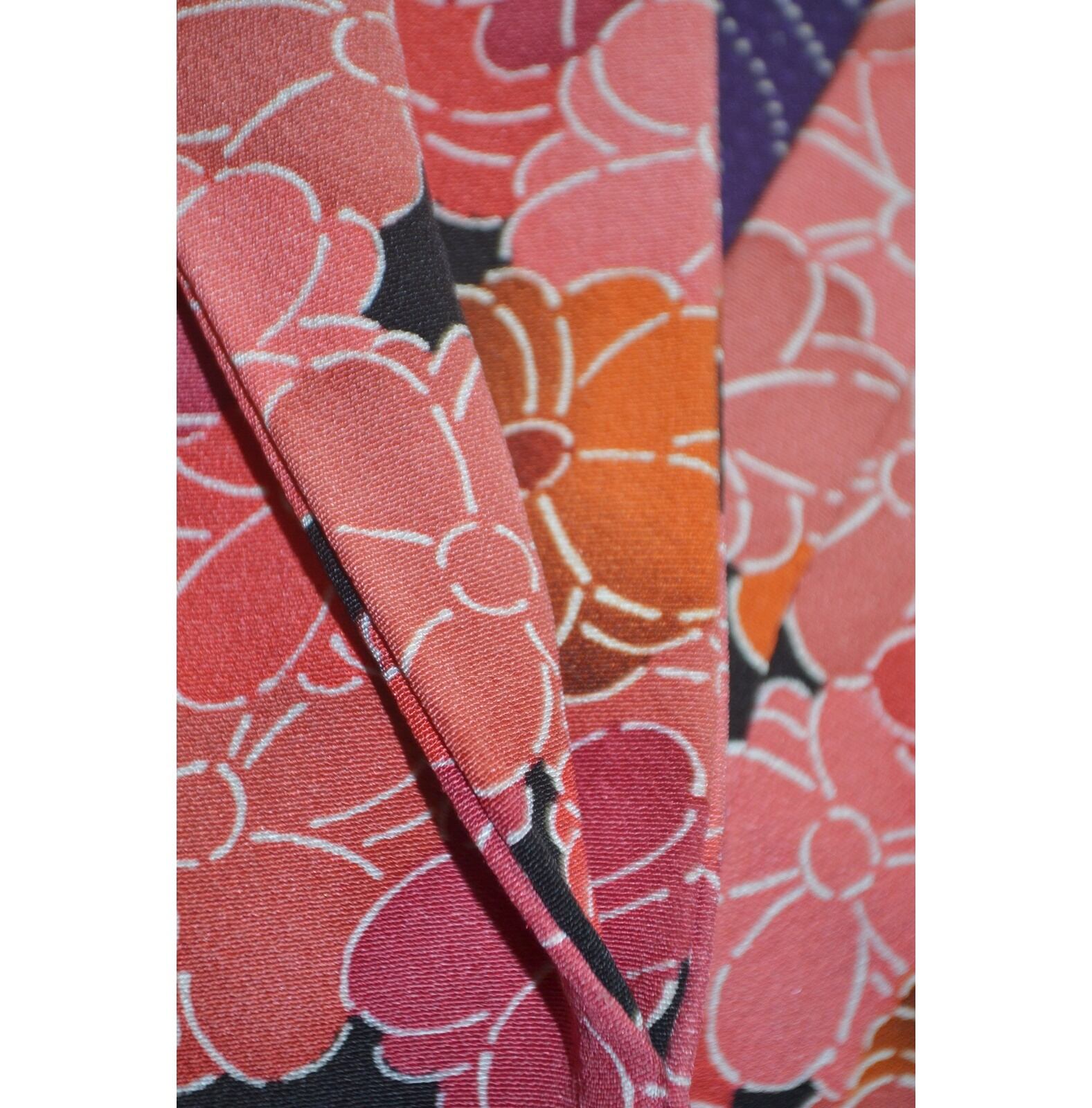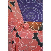 縮緬生地だと思います、黒地にピンクや黄色の花が大きく染められています。