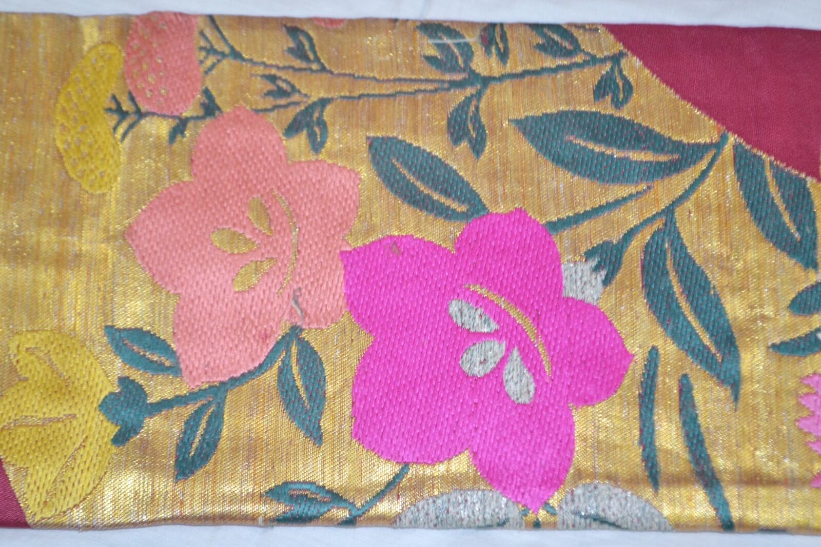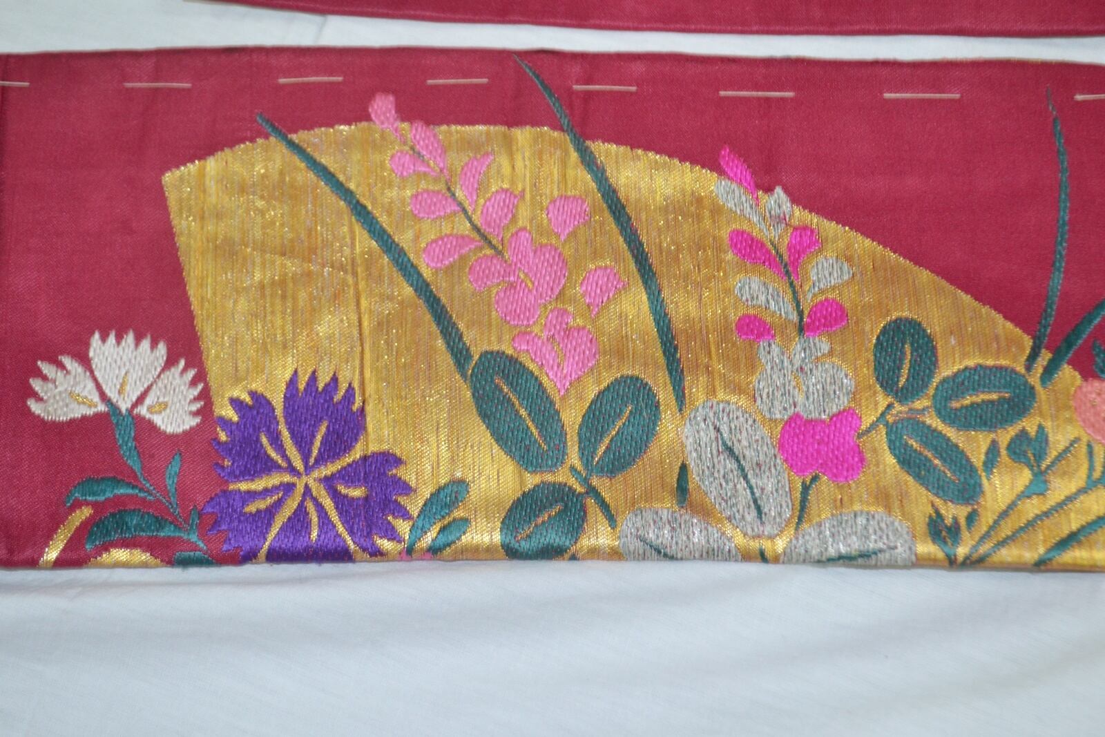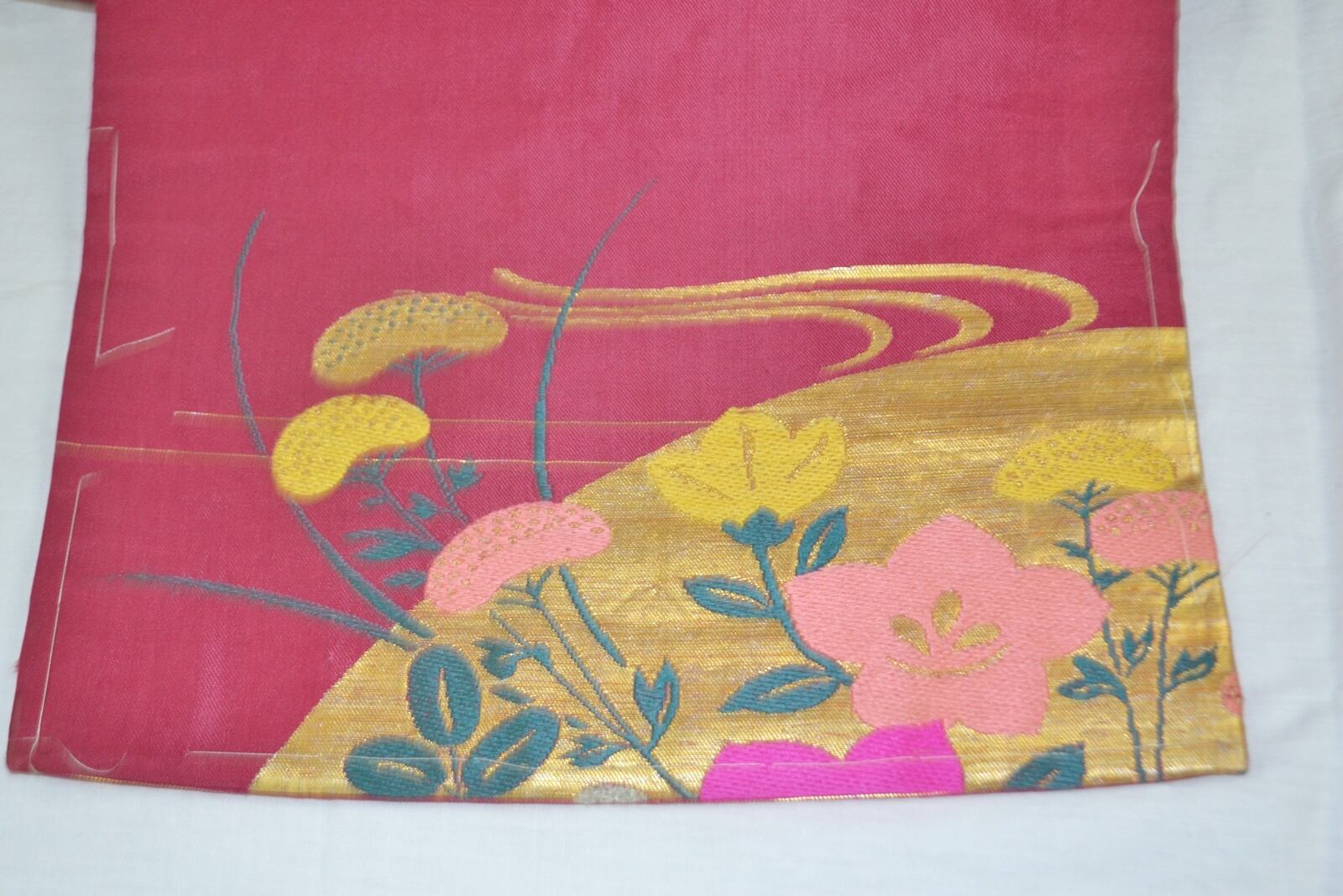 たれの柄部分金色の松、ピンクの桔梗部分少し糸がたるんでいます。