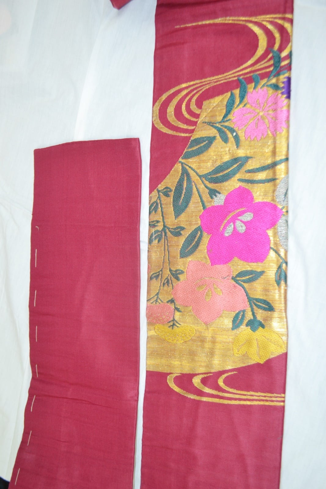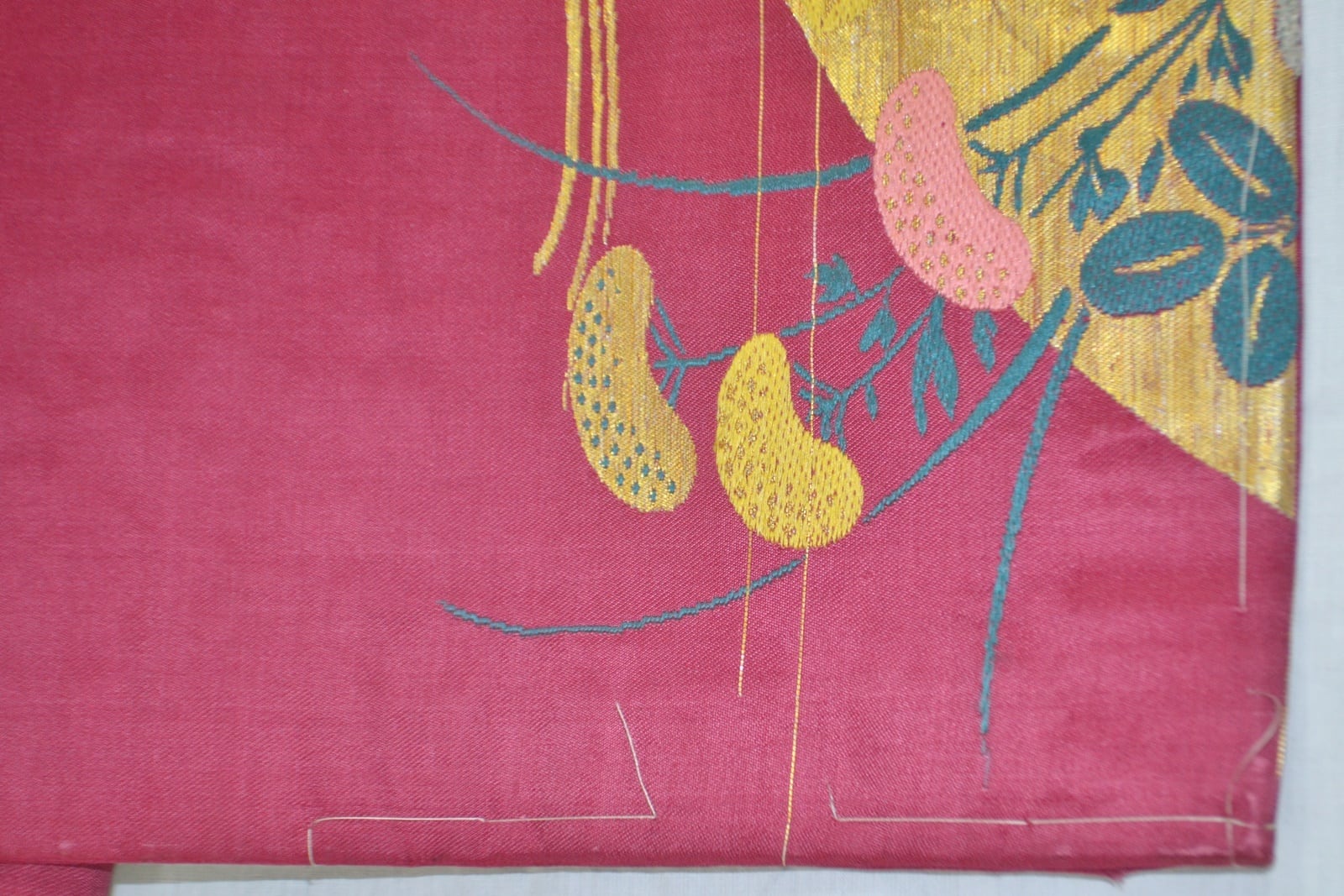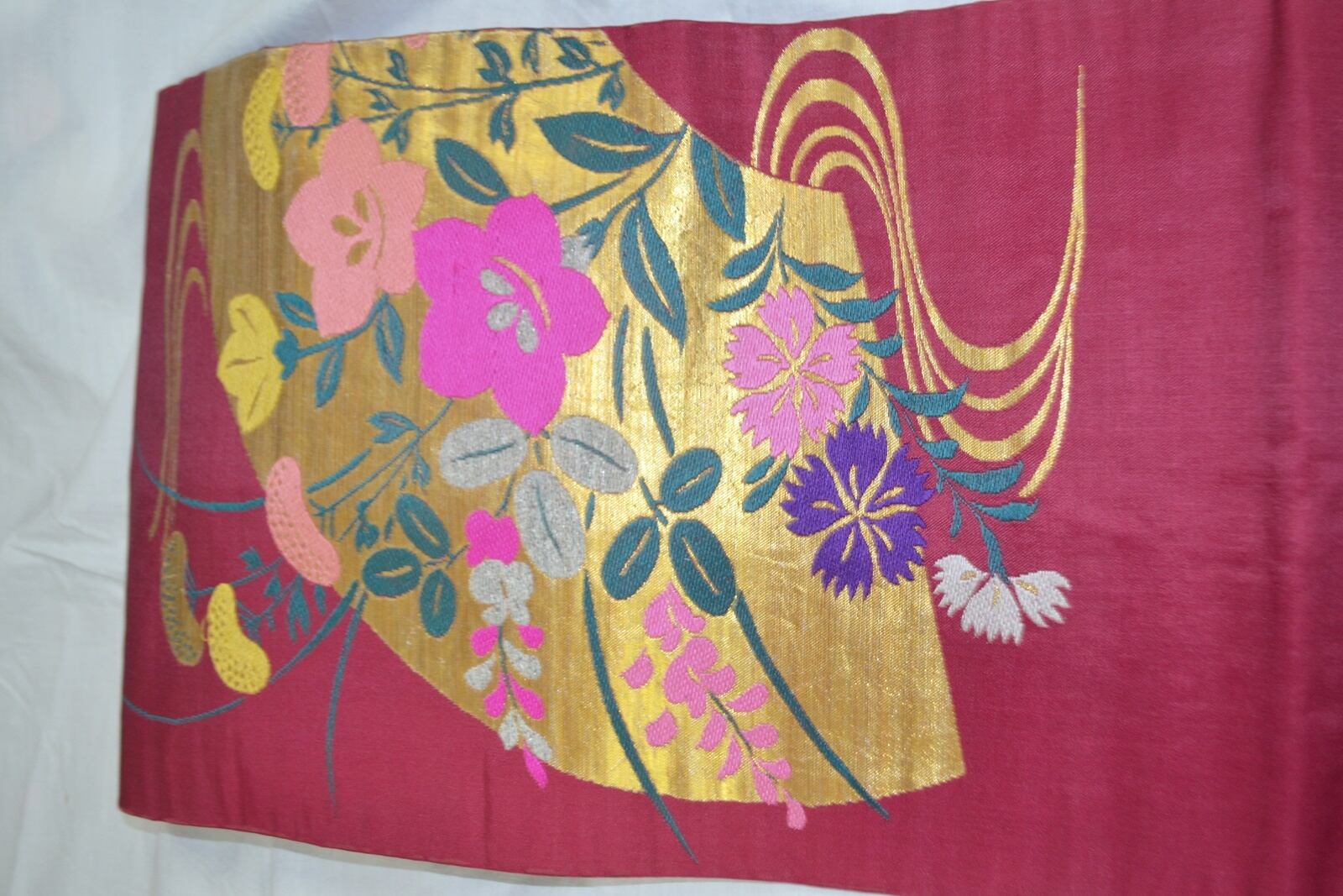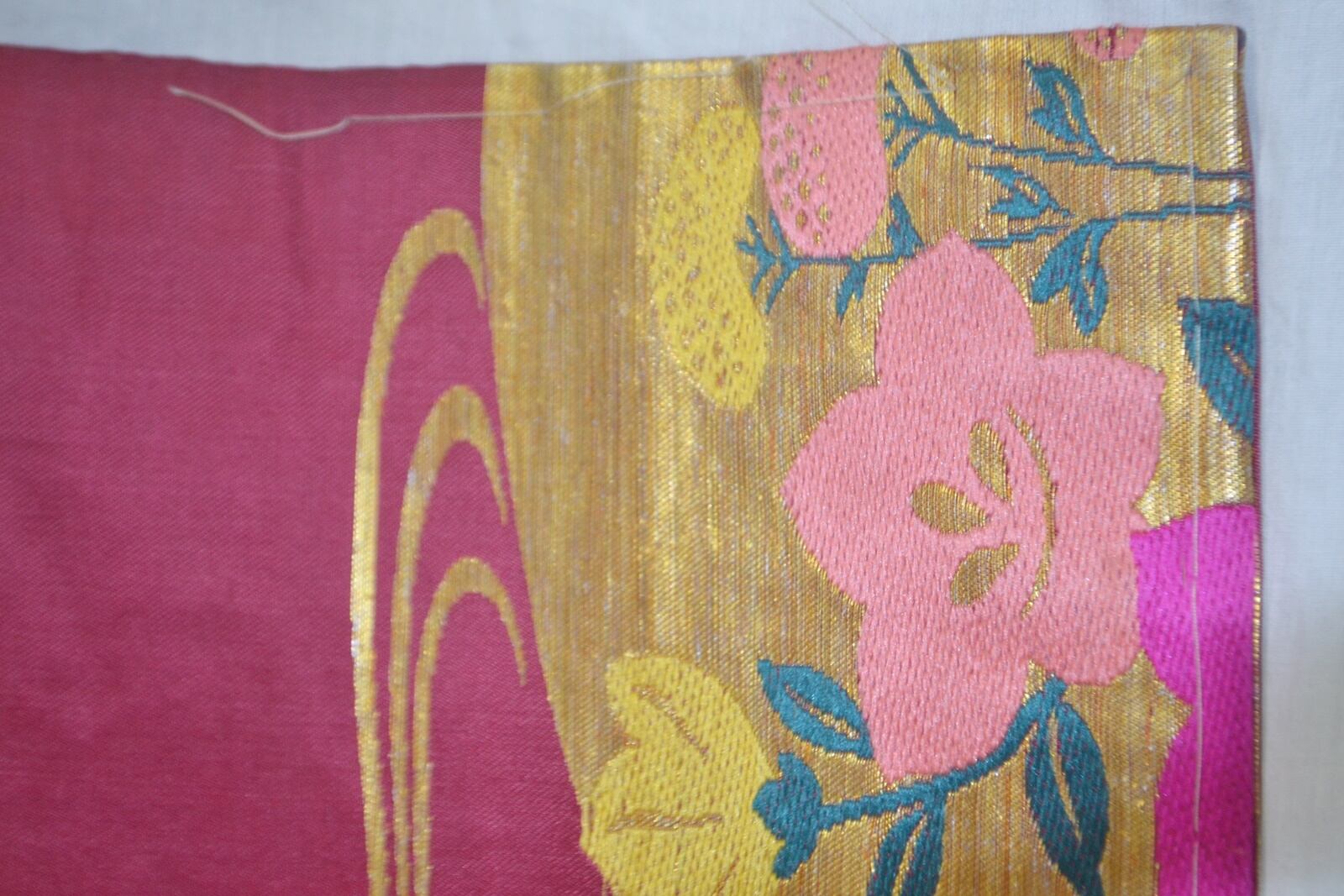 たれの柄部分金色の松、ピンクの桔梗部分少し糸がたるんでいます。