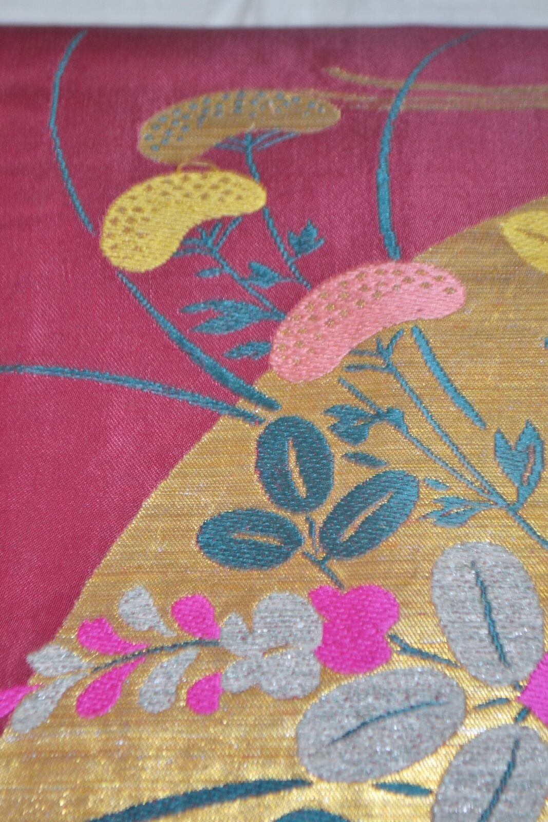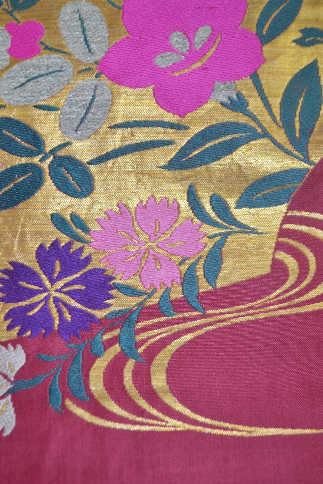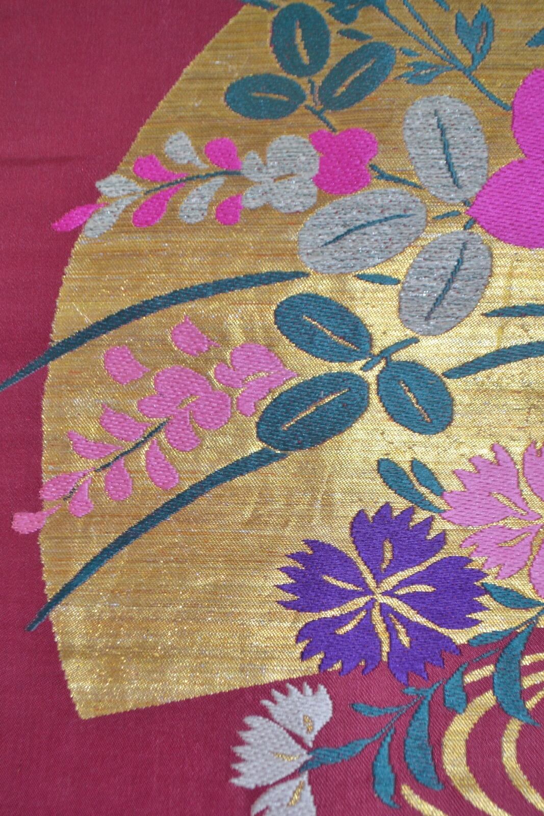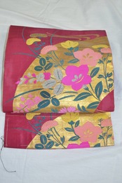 アンティーク帯 九寸名古屋帯 えんじ 金糸 扇 ナデシコ 桔梗 萩