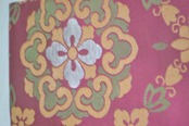 光沢のある明るいパープルの生地で、銀糸、グリーン、山吹色の花紋が織り出されてます。