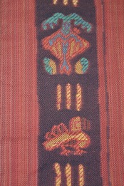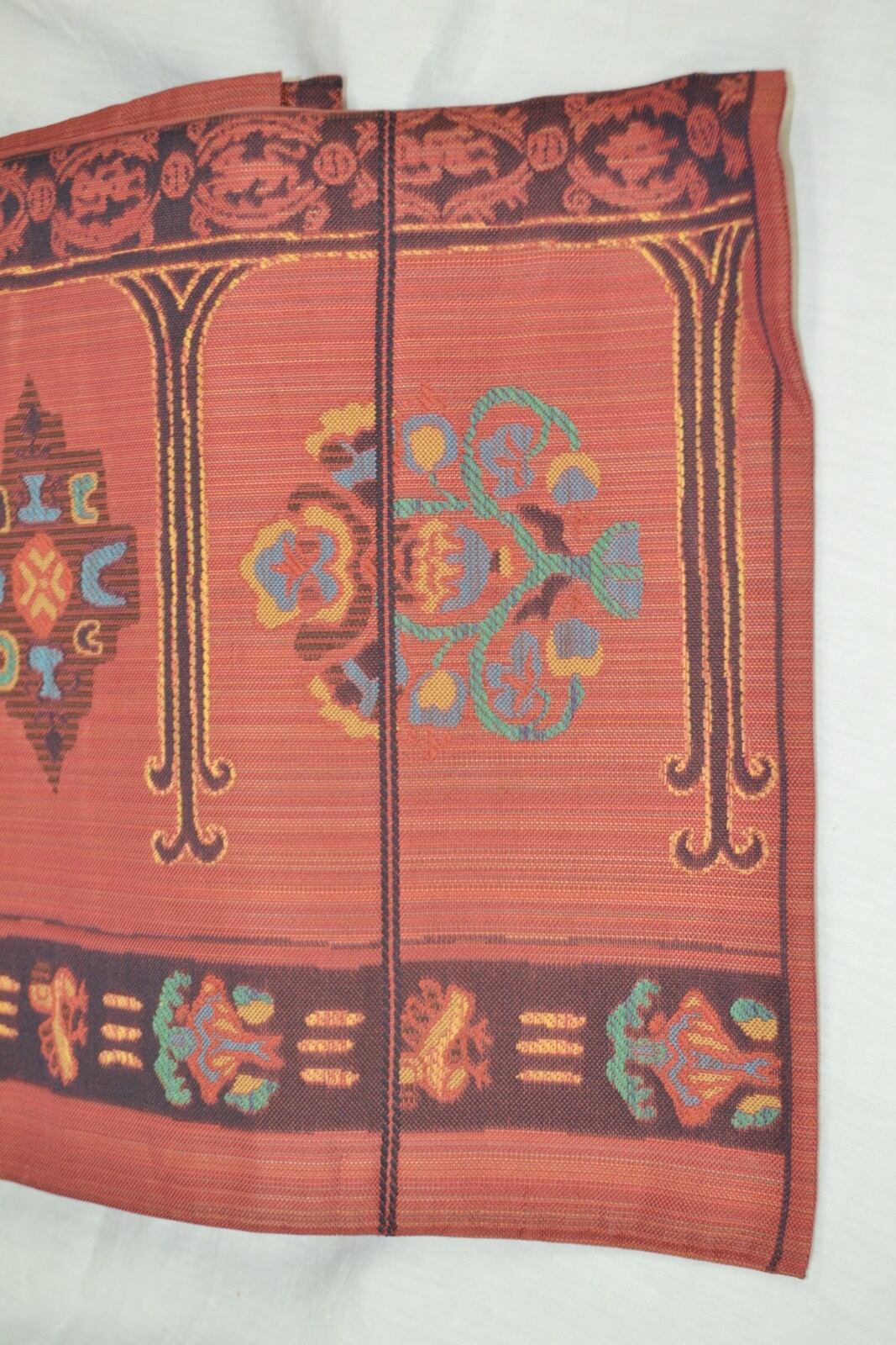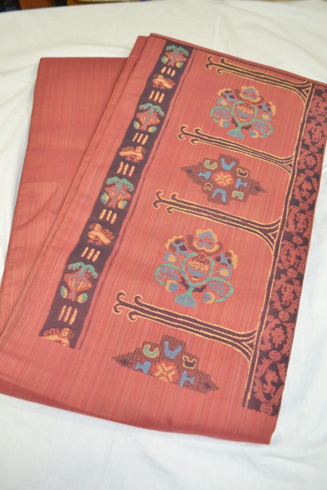 ややトーンを抑えた赤色の生地に幾何学的にデフォルメされた洋紋や
