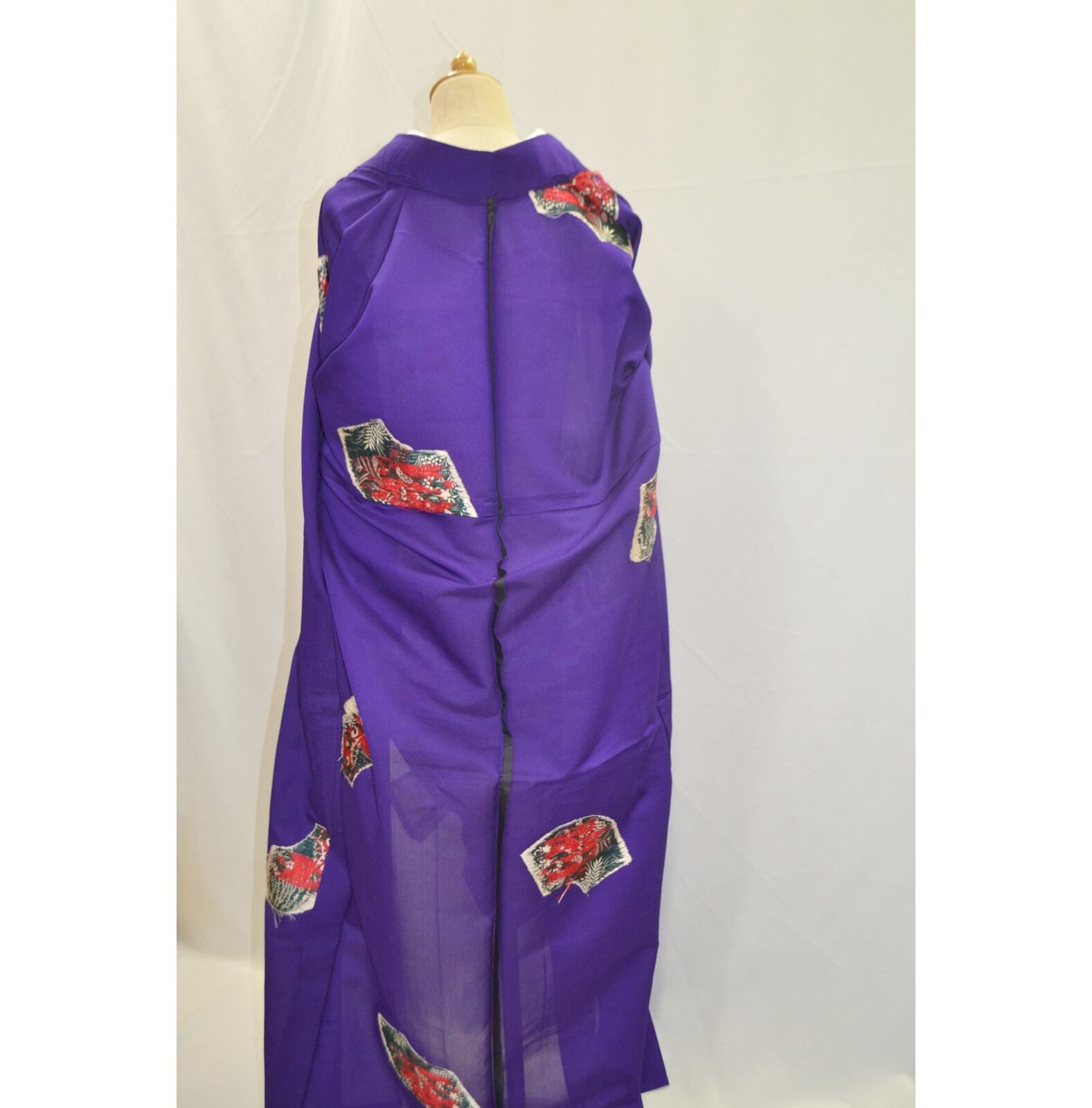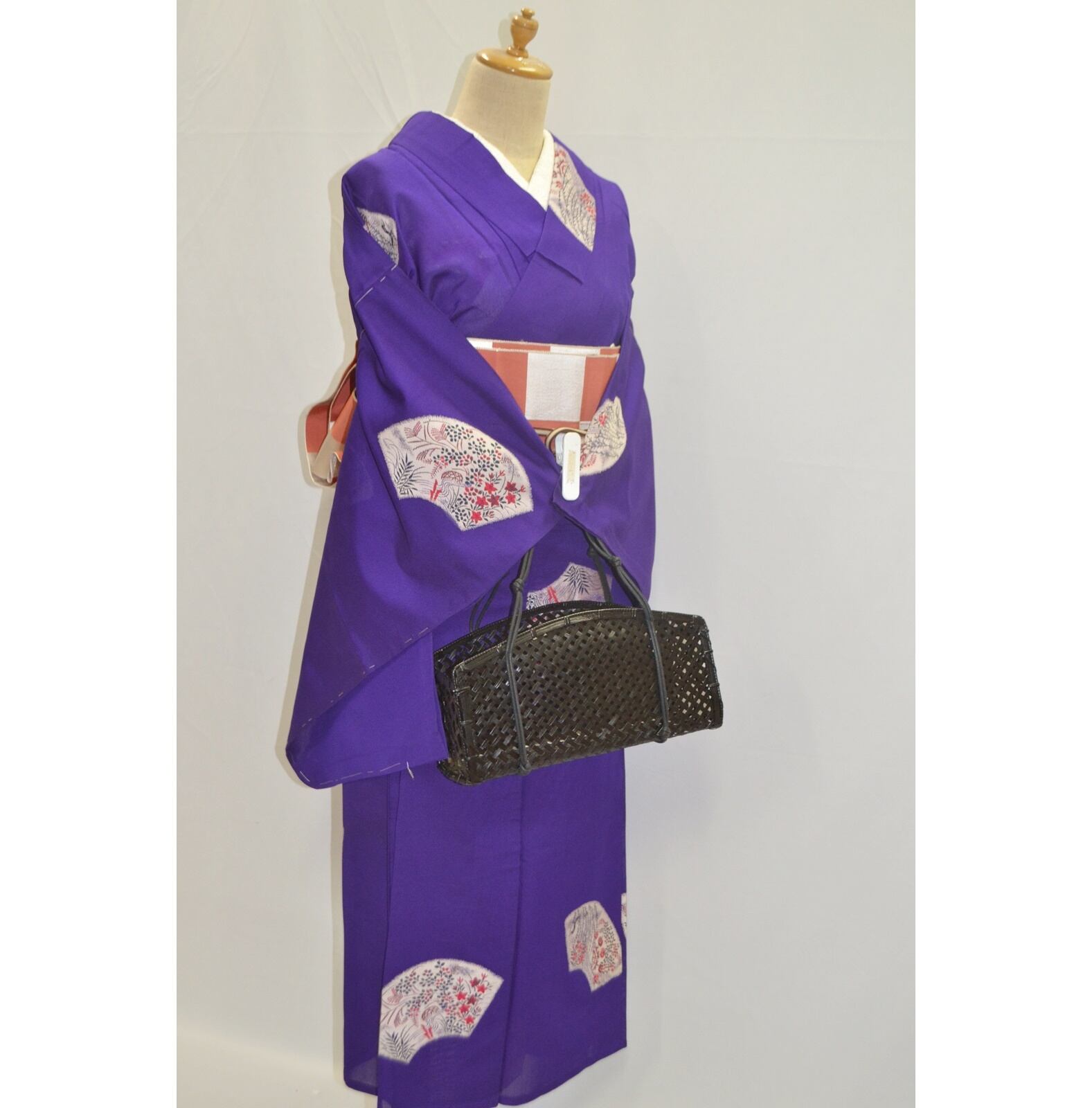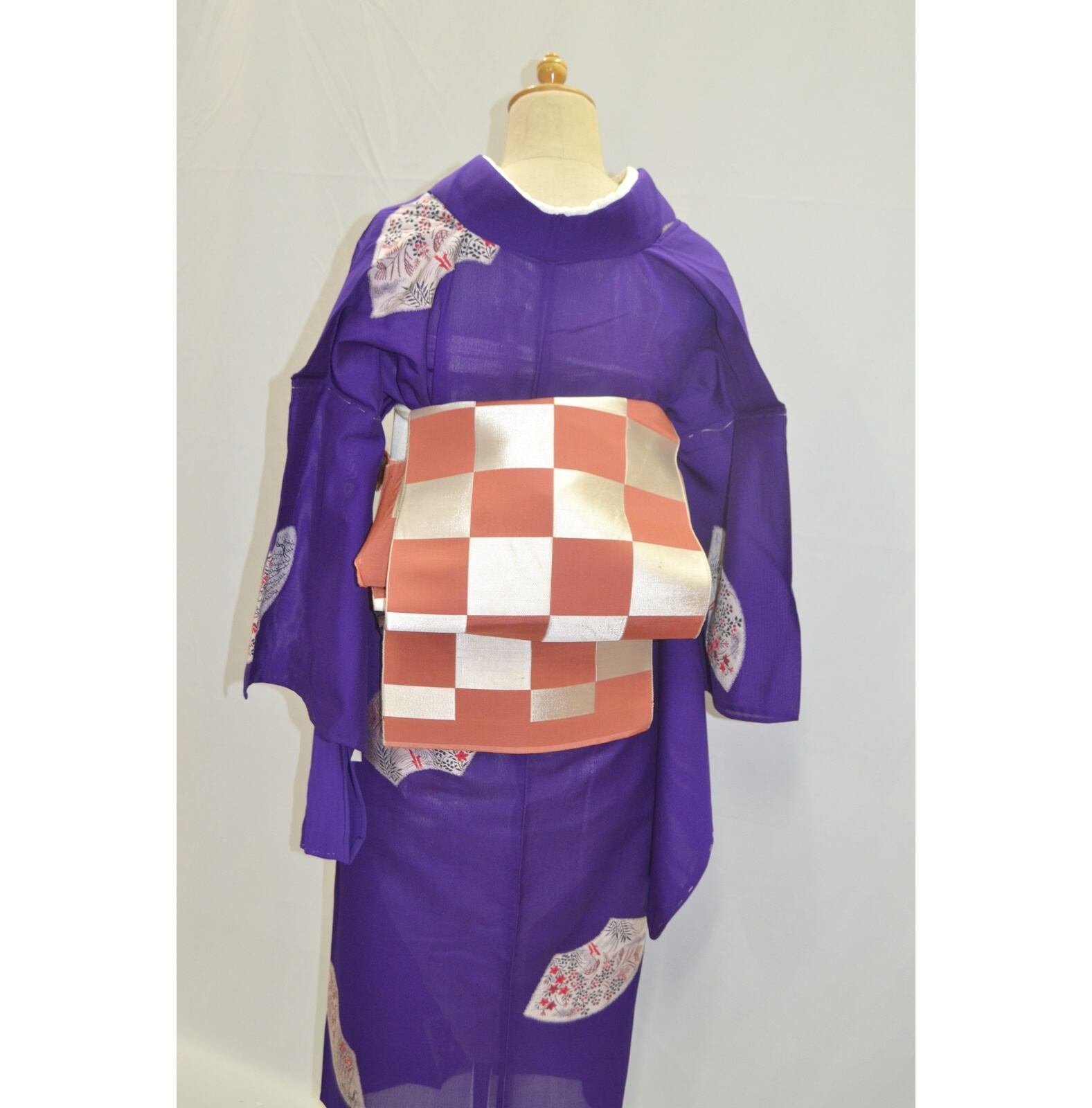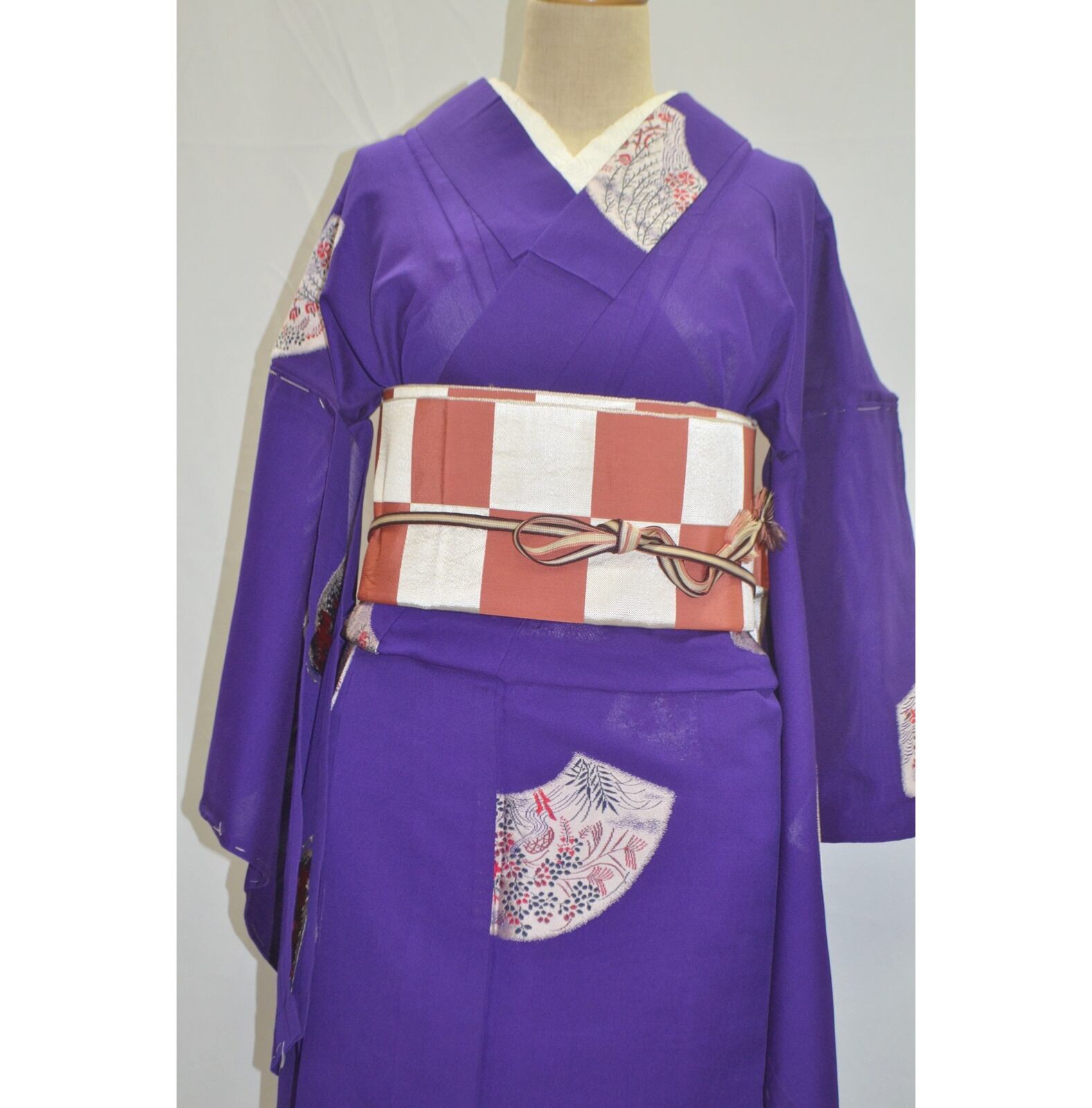 【アンティーク夏着物】紗 紫に扇【バチ衿】小紋 普段着 おしゃれ 貴重 お出かけ リサイクル 中古