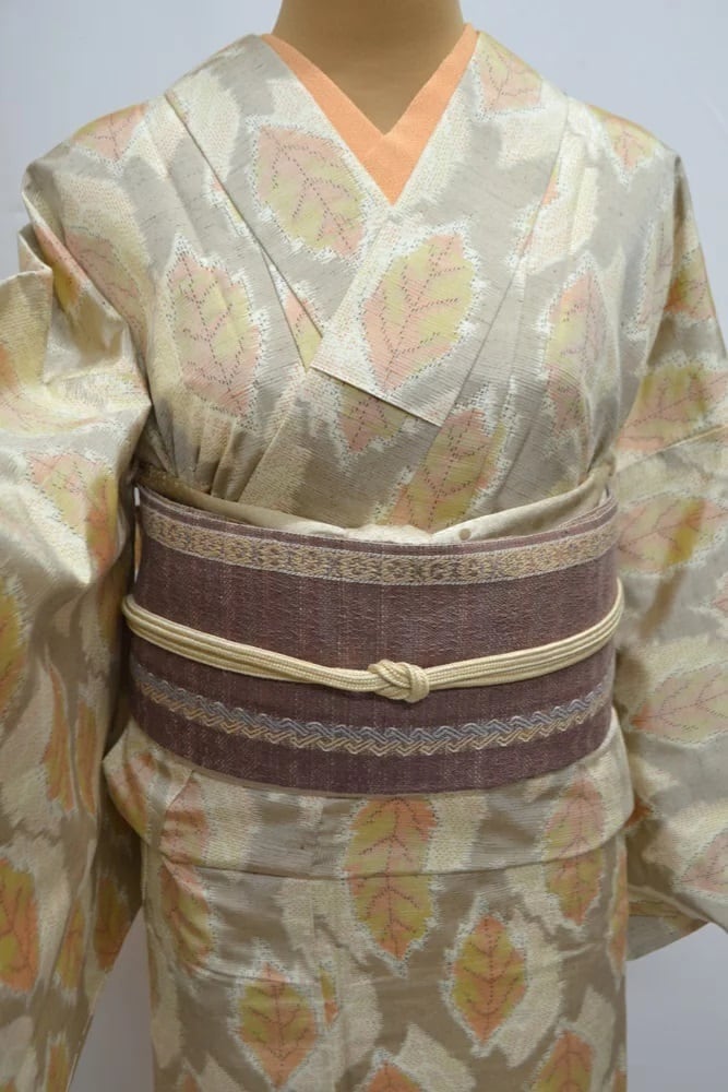 紬 ベージュ系 紅葉 秋の色 しつけ付 未使用 美品 小紋 葉っぱ 立涌 ナチュラル系 自然 裄大き目