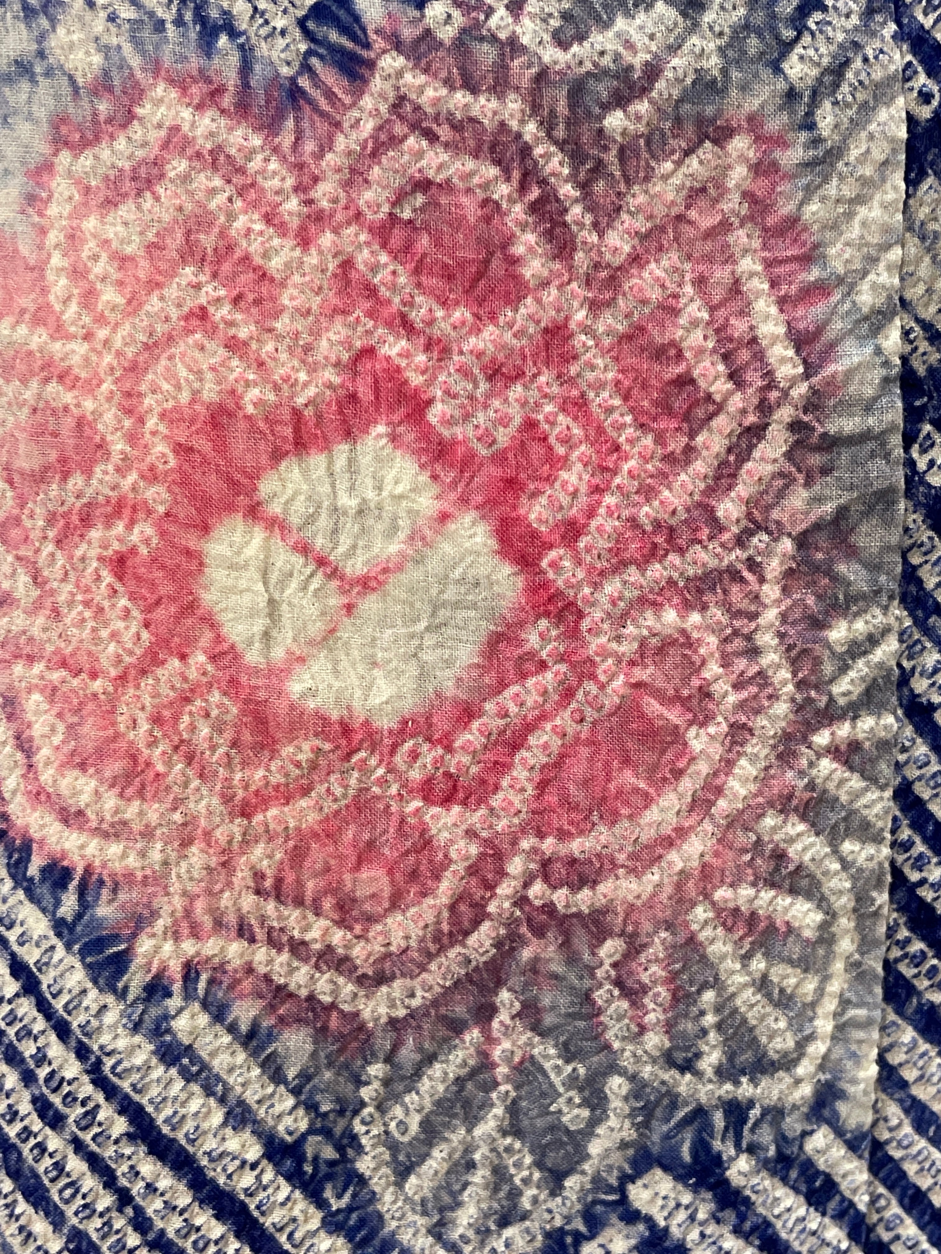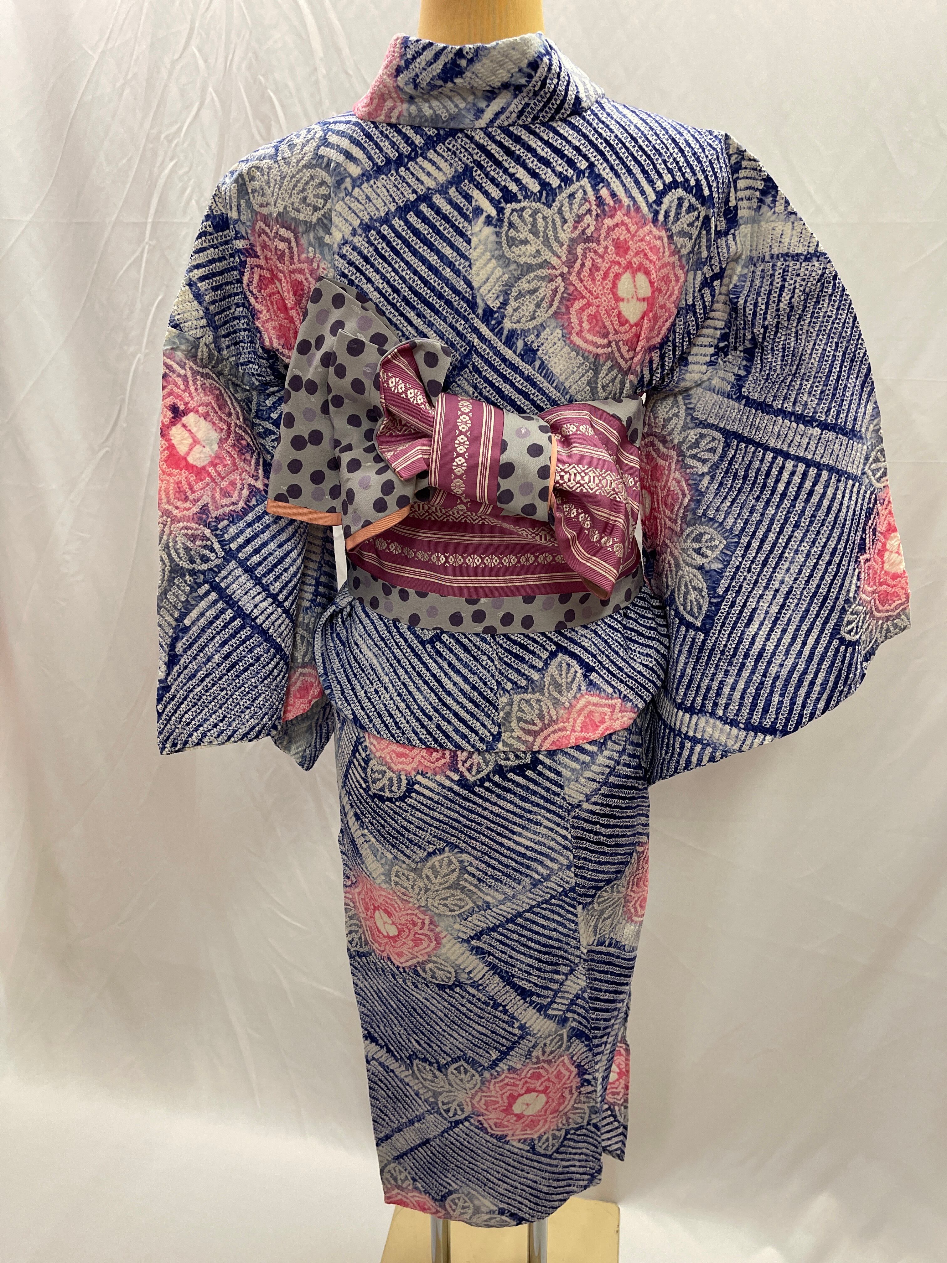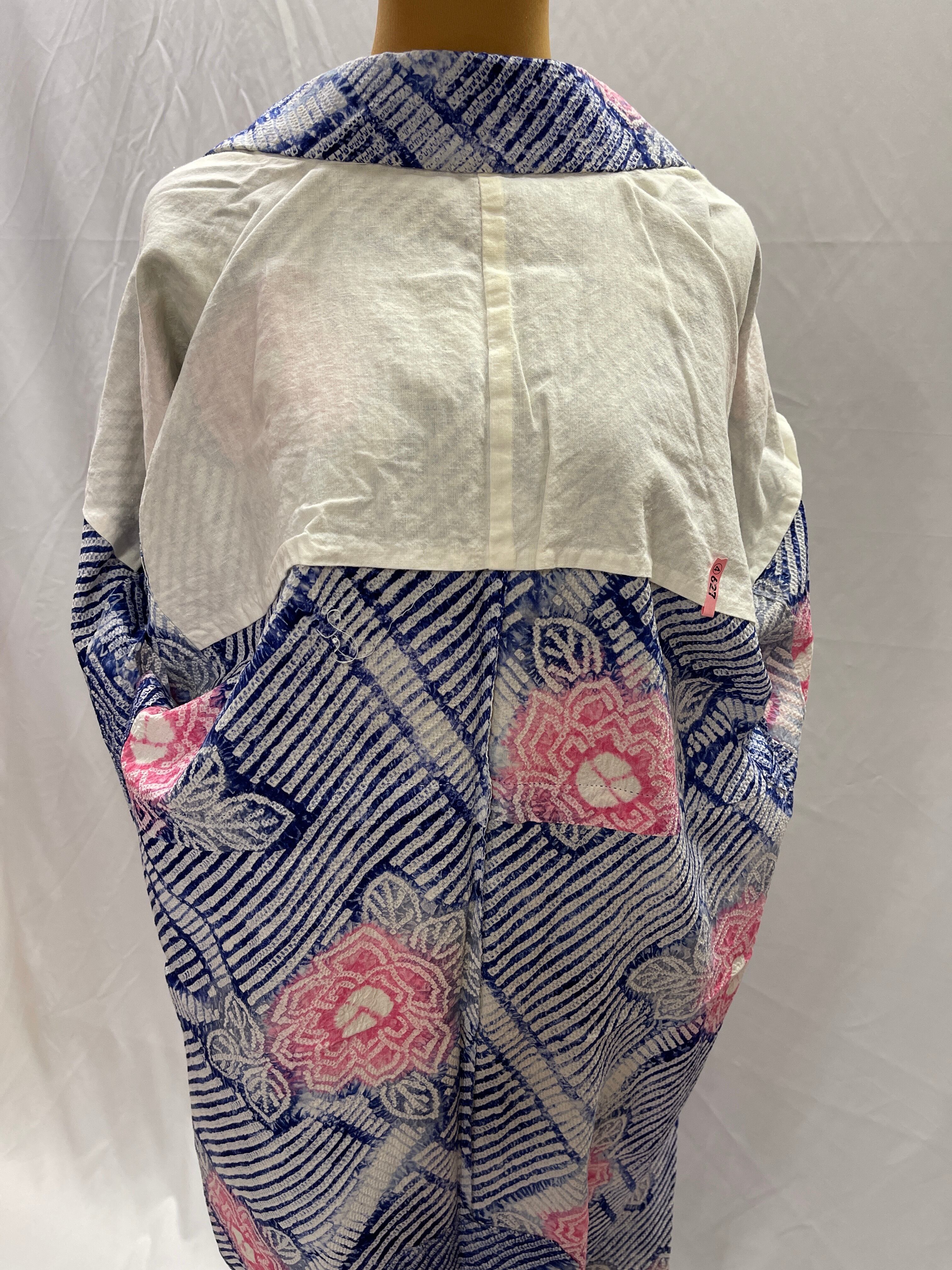 白地に紺とピンクでバラの花でしょうか、大きく大胆な絞り柄が入っています。
