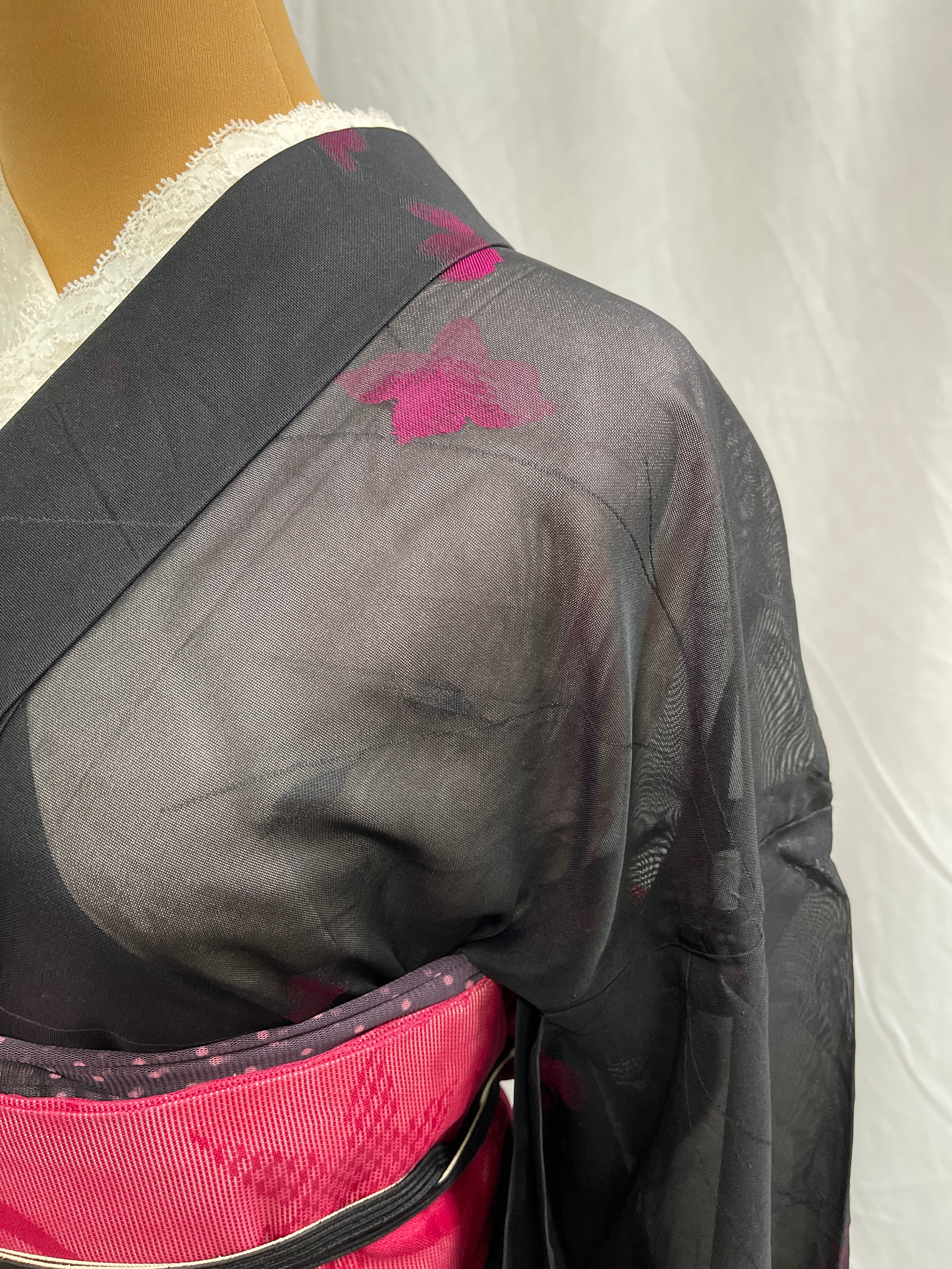 表は黒地で裏はピンク地になっているので、表の柄にピンクのお花が浮き上がって見えます。