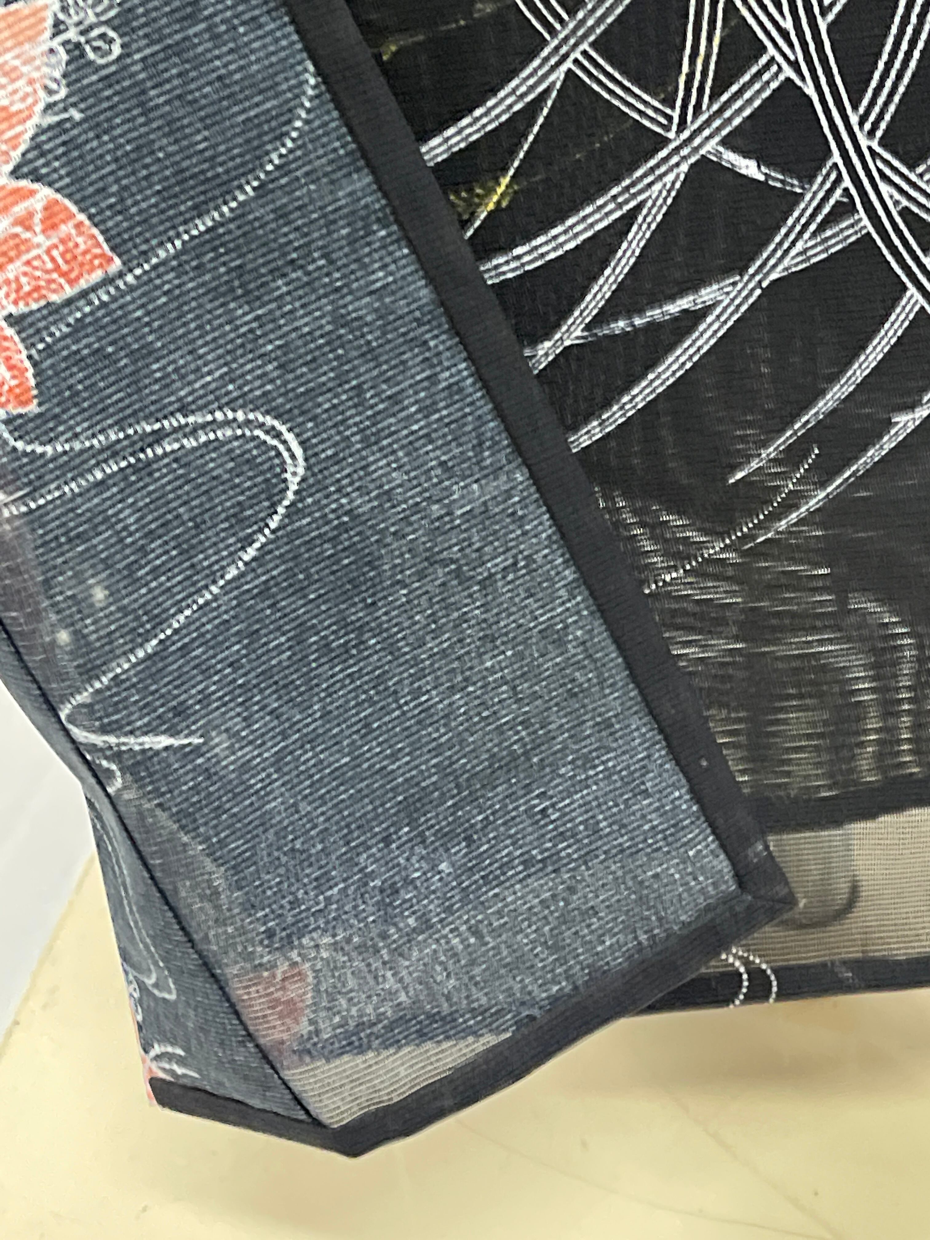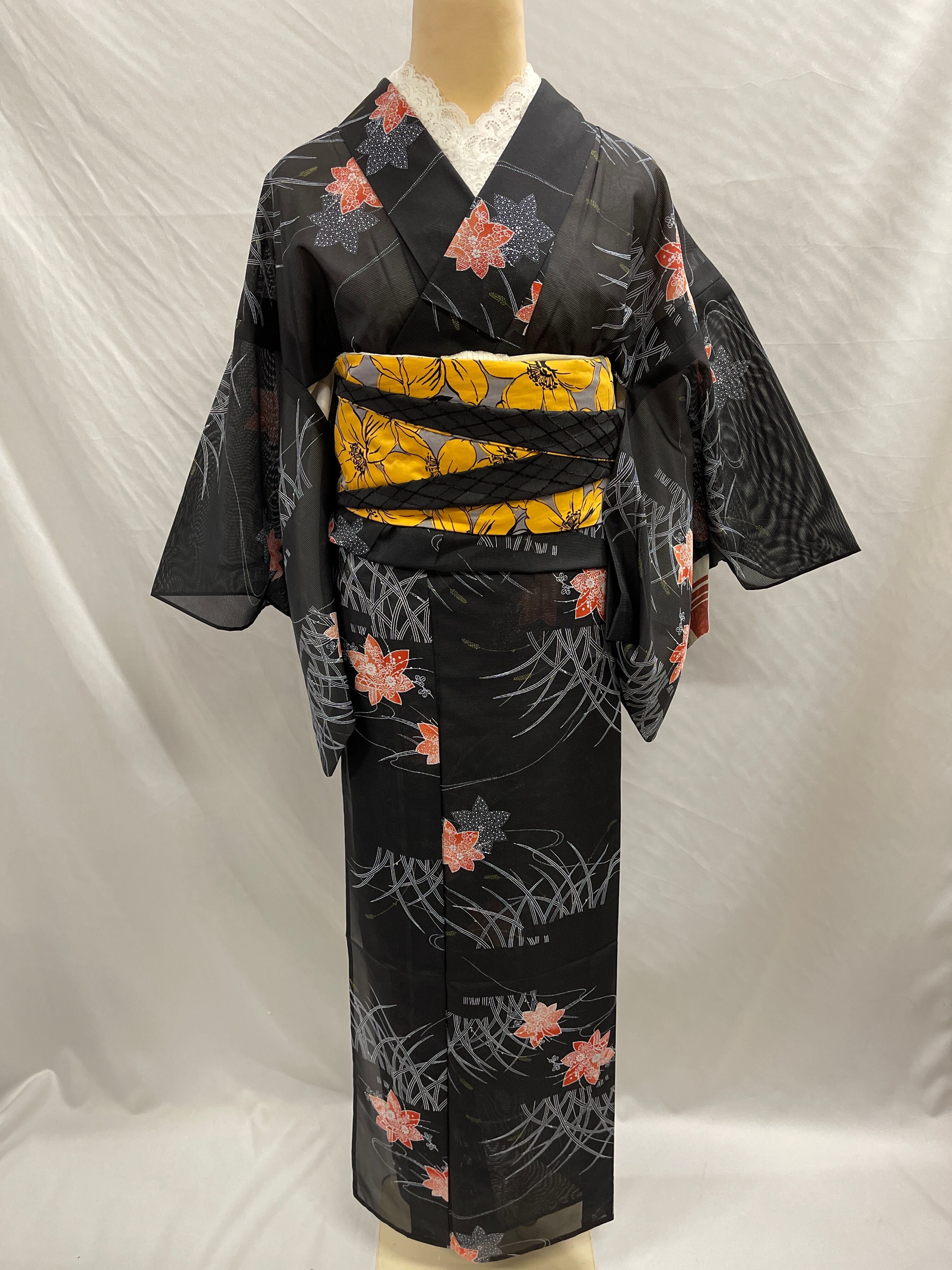 涼しい夏着物 洗える着物 黒地にオレンジの楓 絽 女 駒絽 絽 夏着物 単衣 レディース