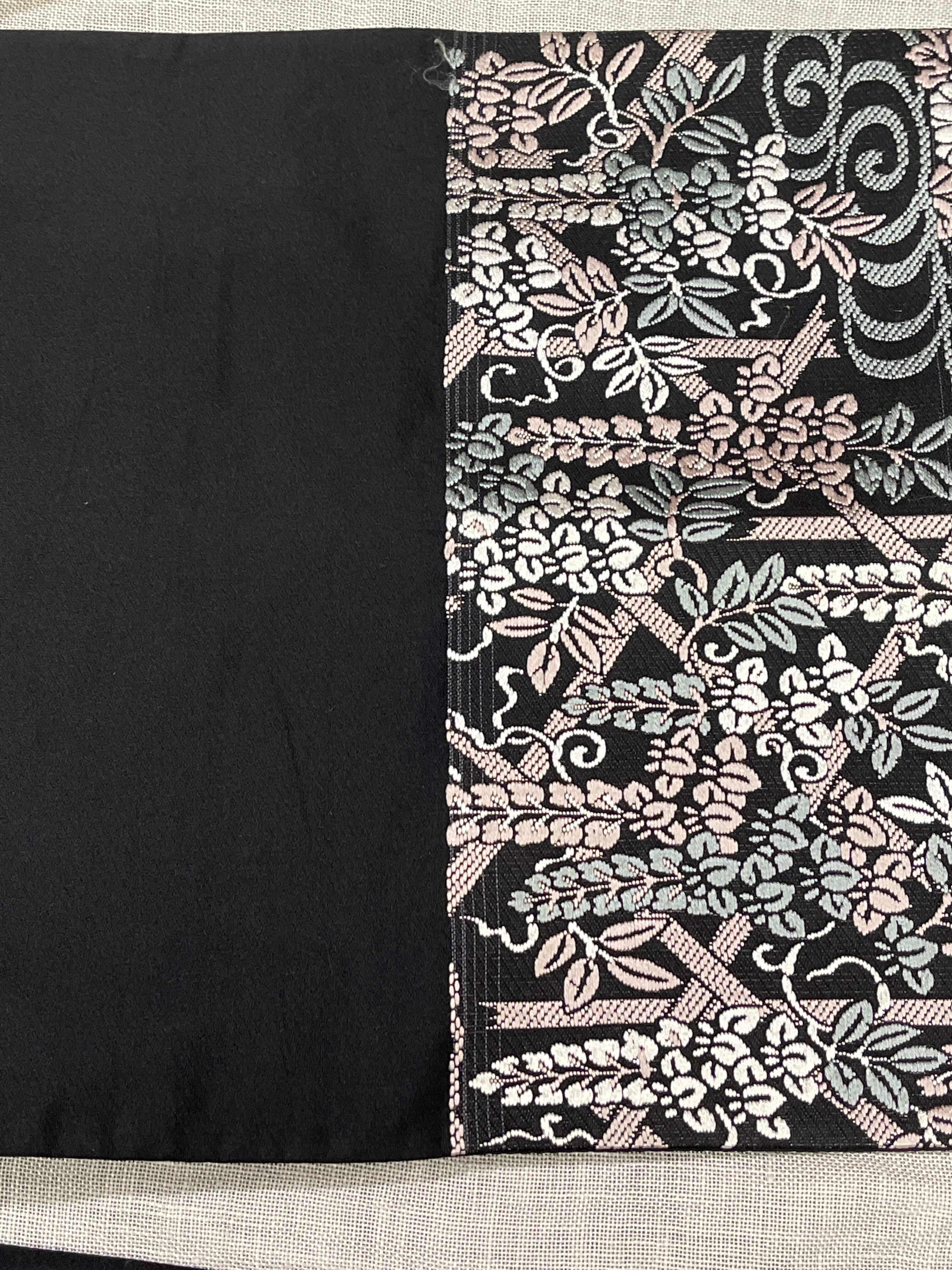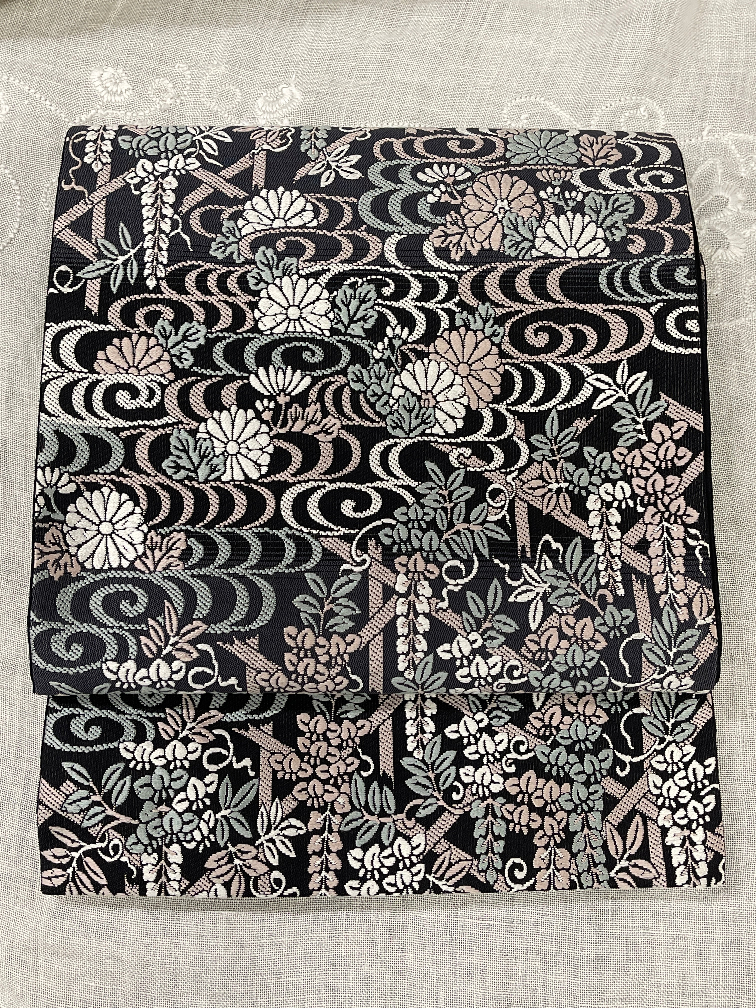 袋帯 黒地 藤 菊 流水 カジュアル セミフォーマル