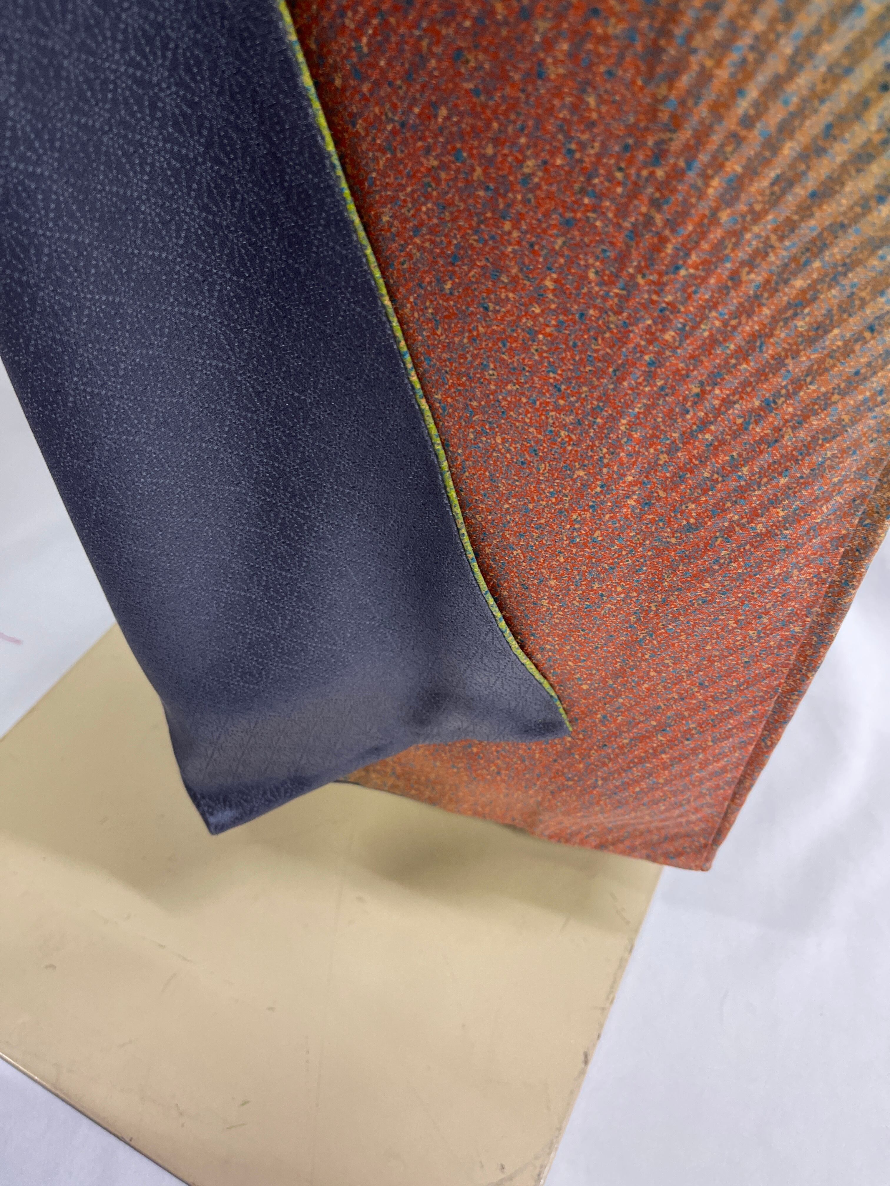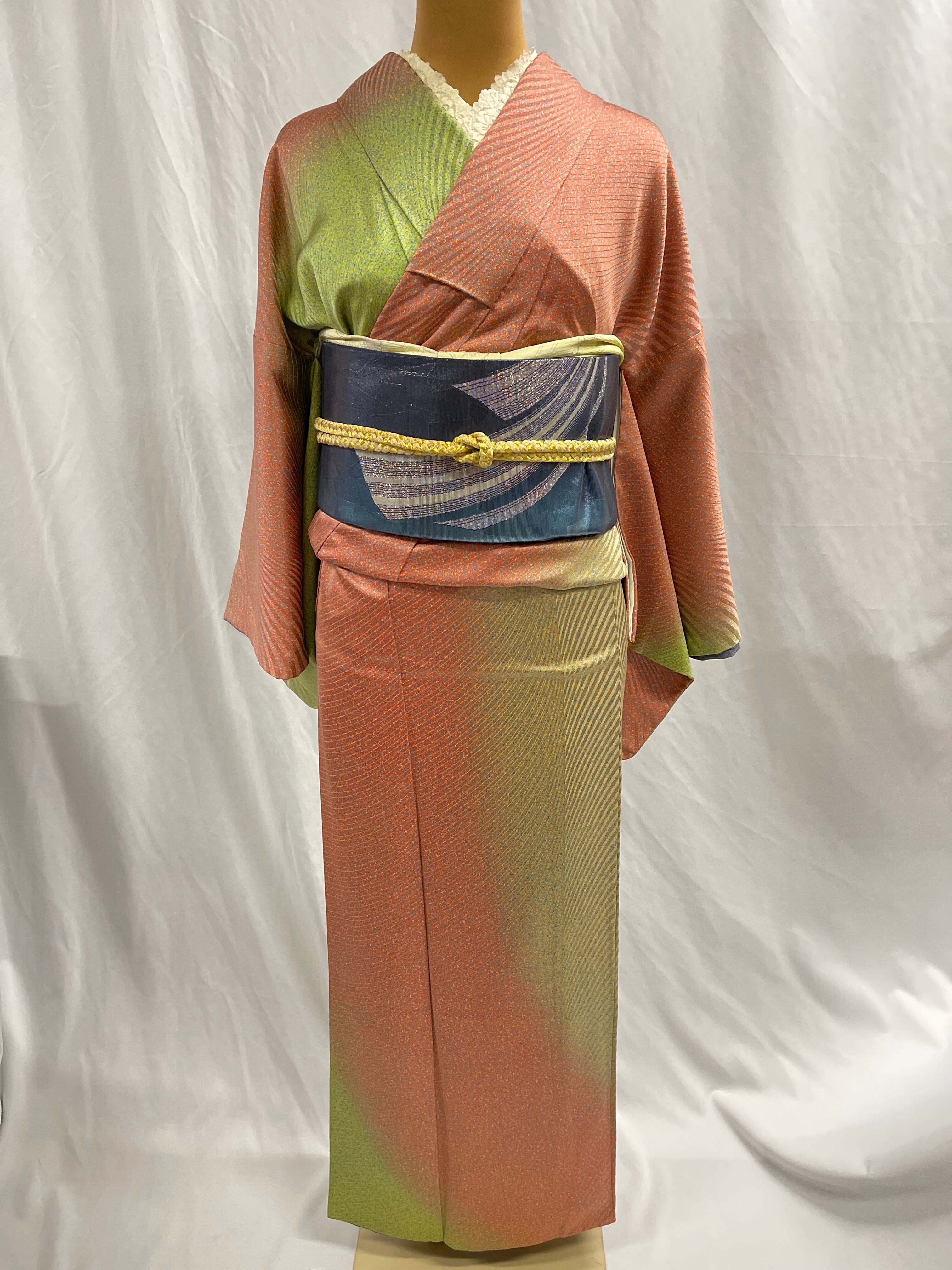 小紋 黄緑 赤 たたき染め 斜線縞地模様