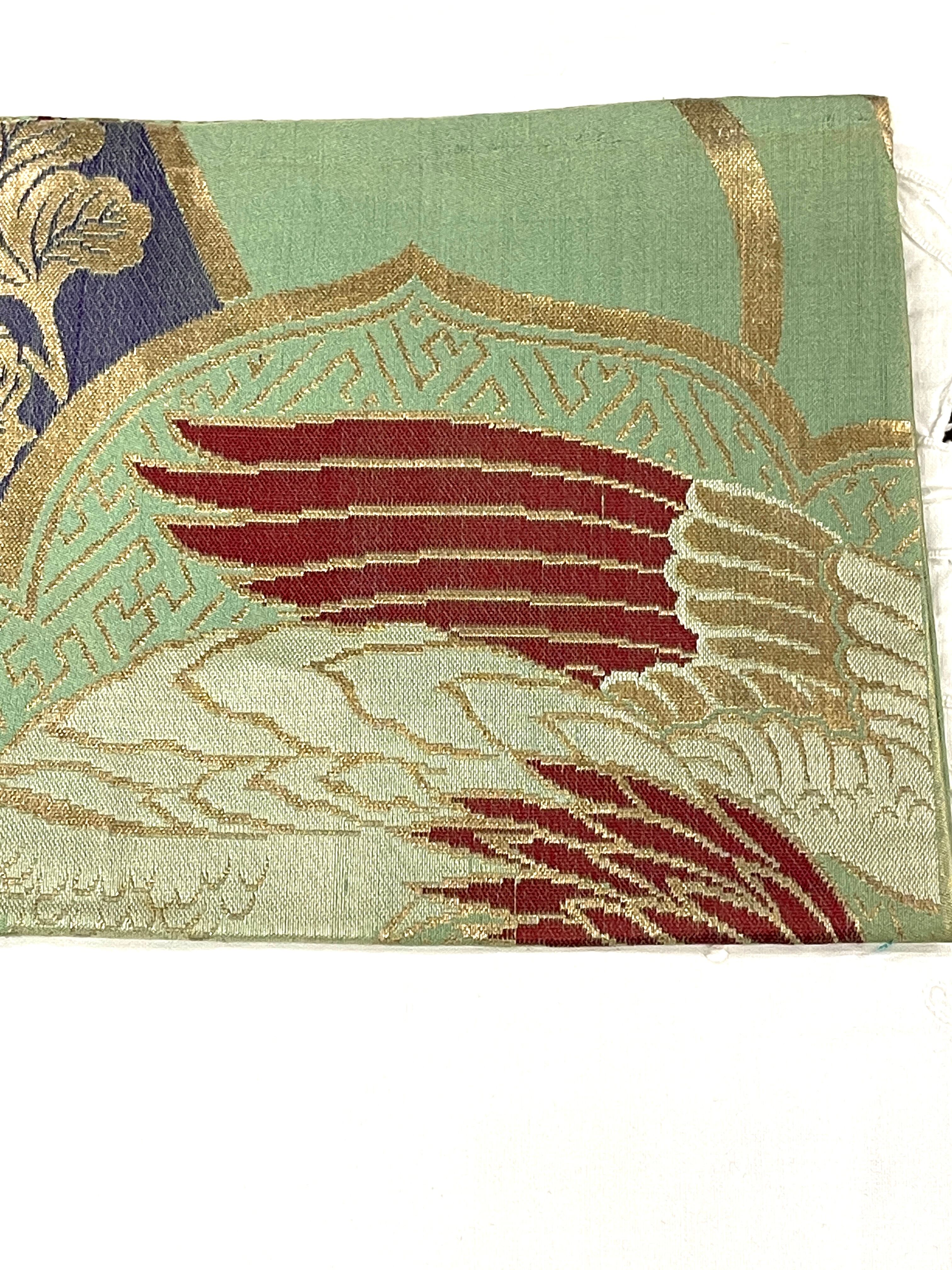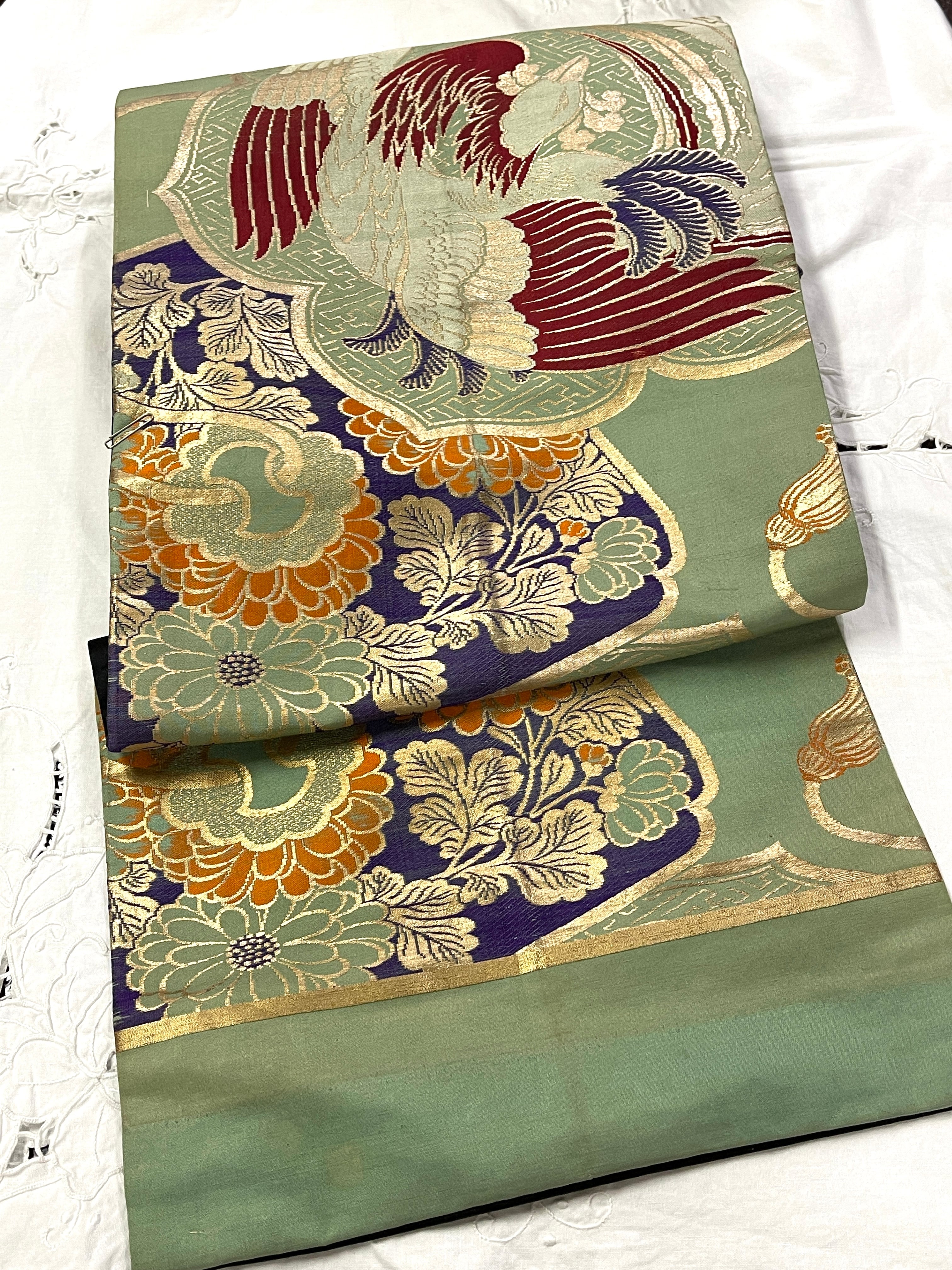 アンティーク名古屋帯 九寸名古屋帯 グリーン系 織り出し 鳳凰 菊 金糸
