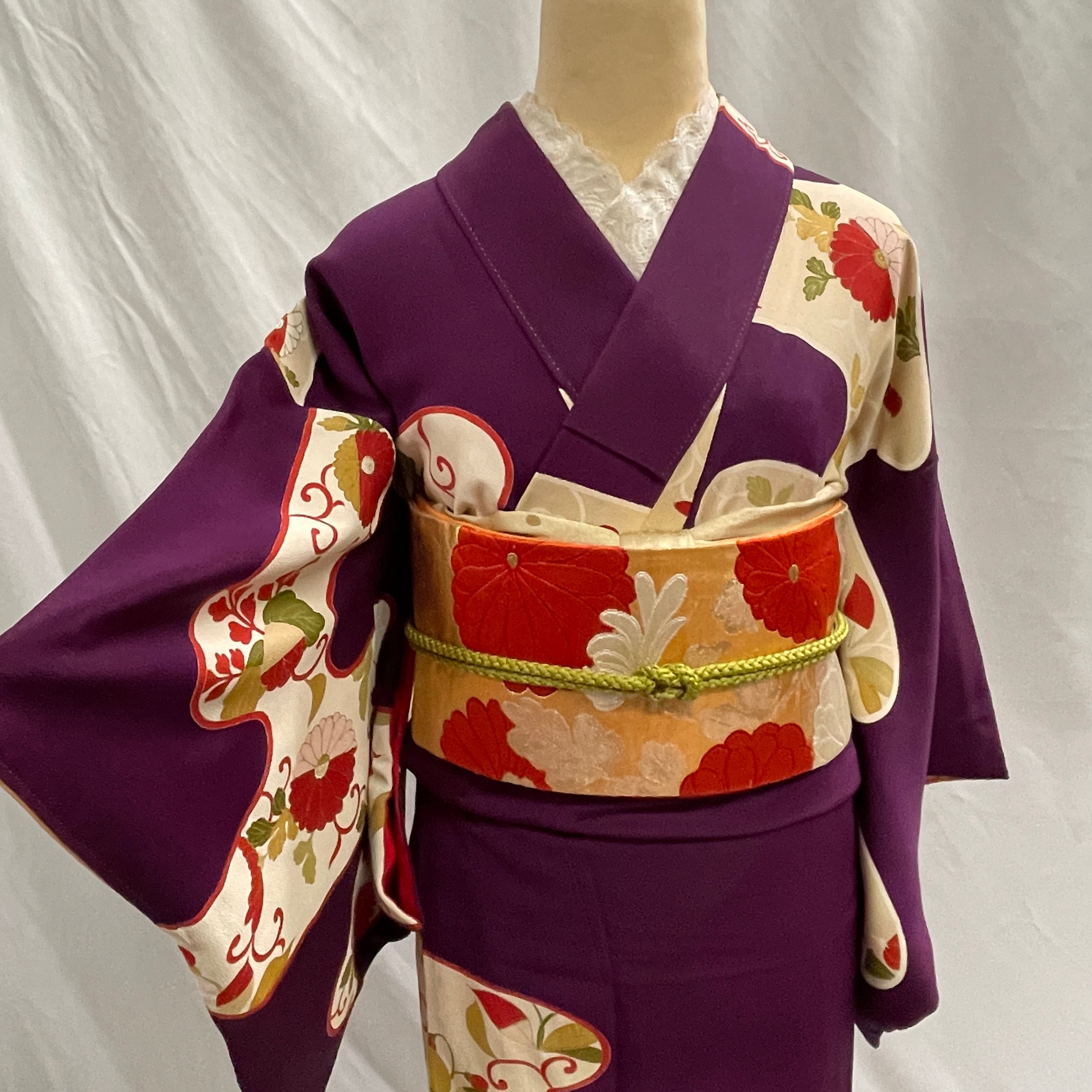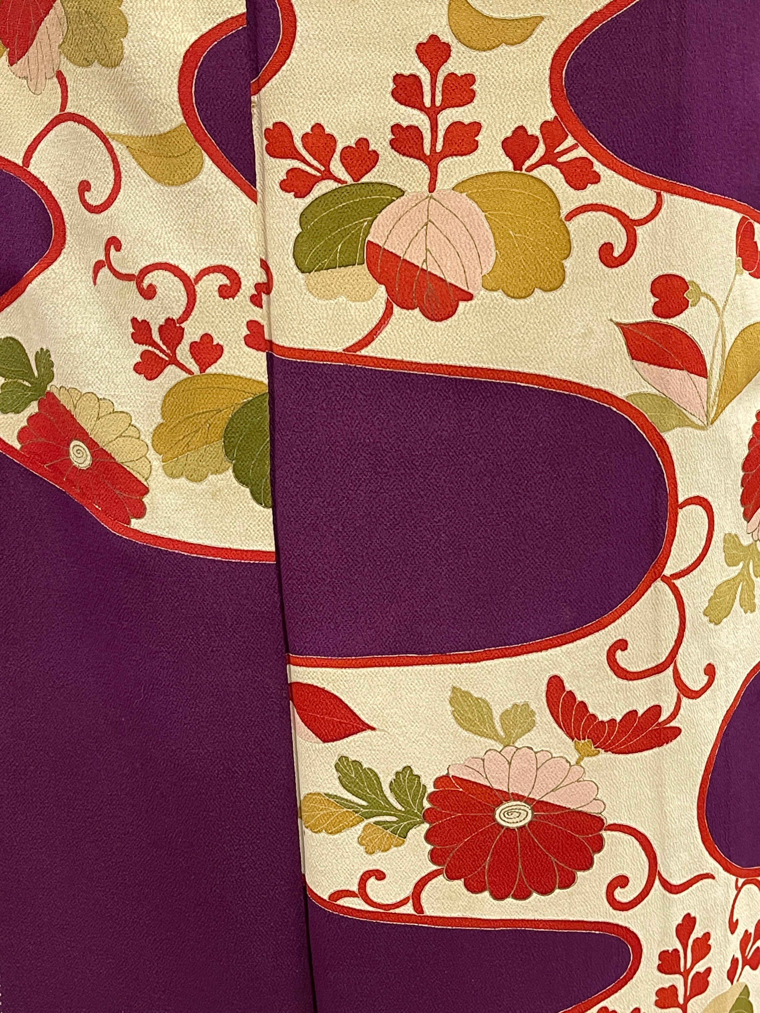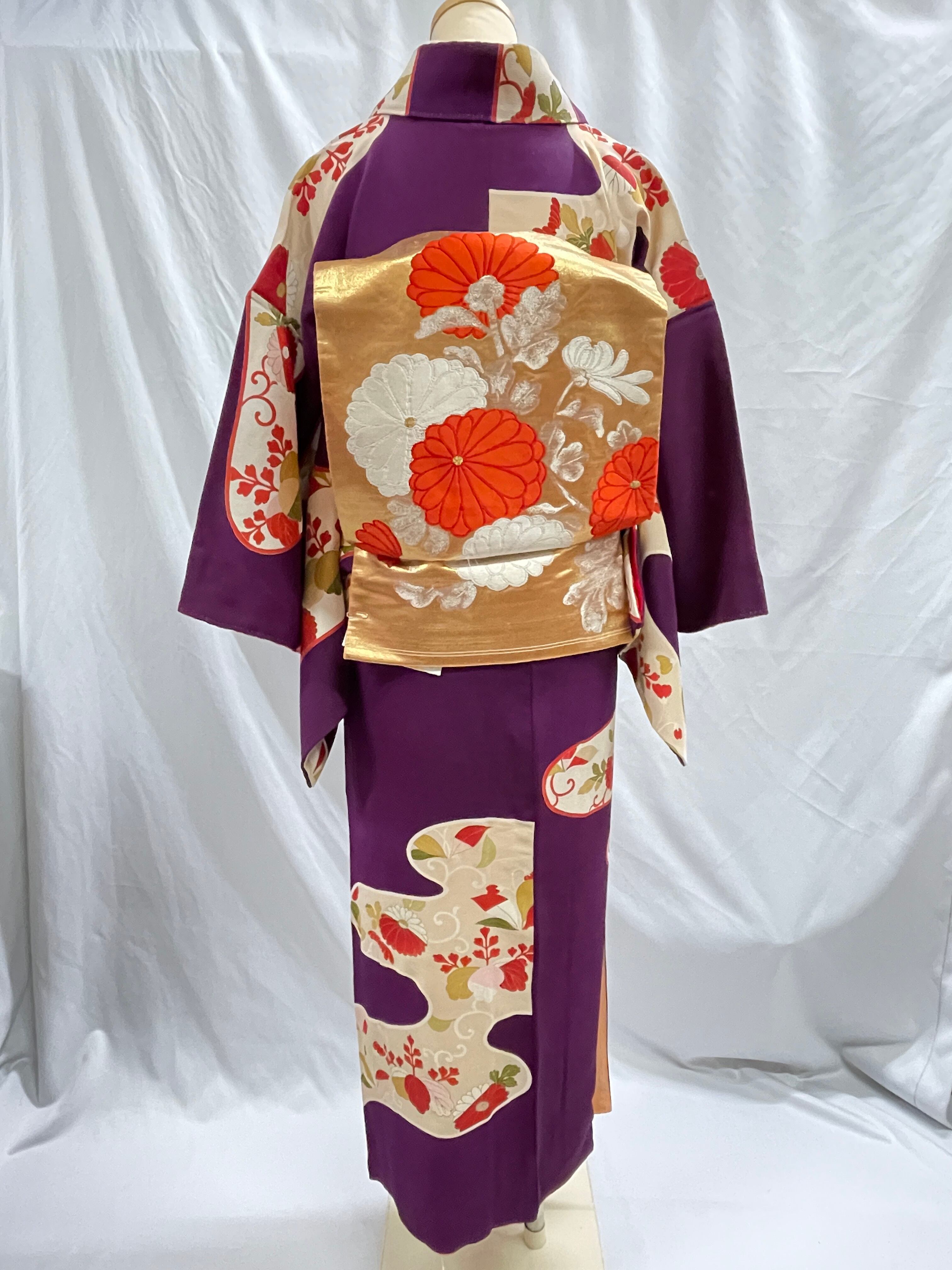 アンティーク着物 訪問着 紫地 雲取り 菊花 唐草胴裏 紅絹