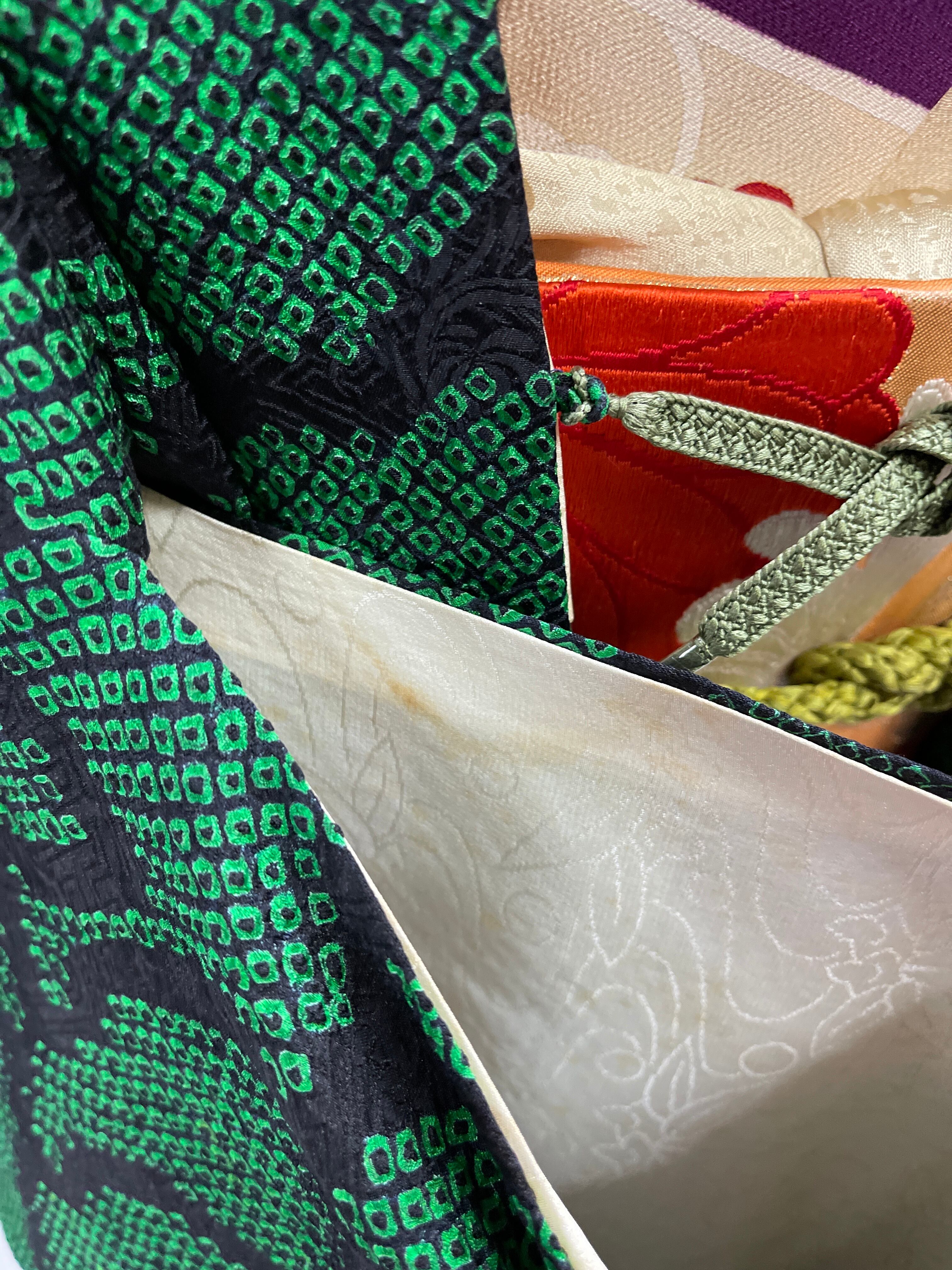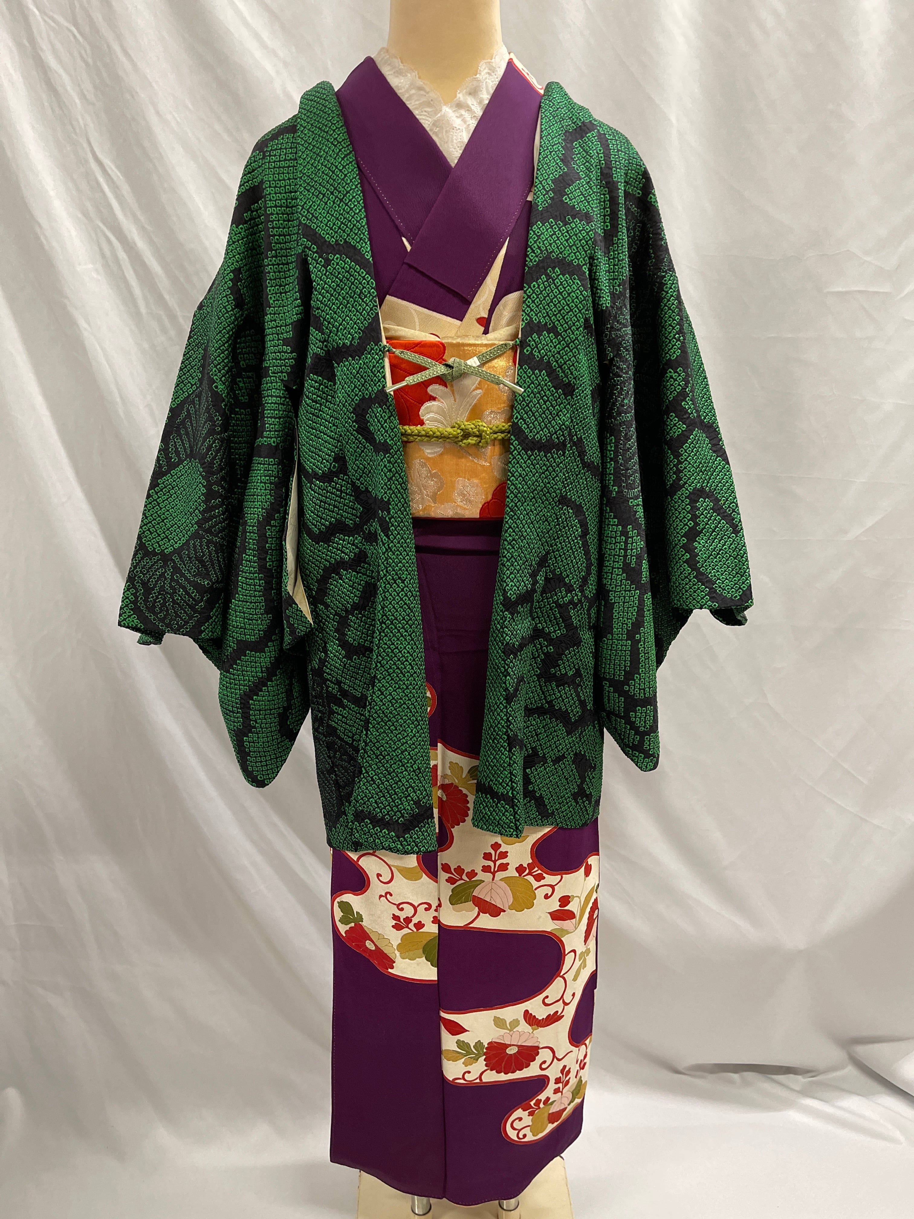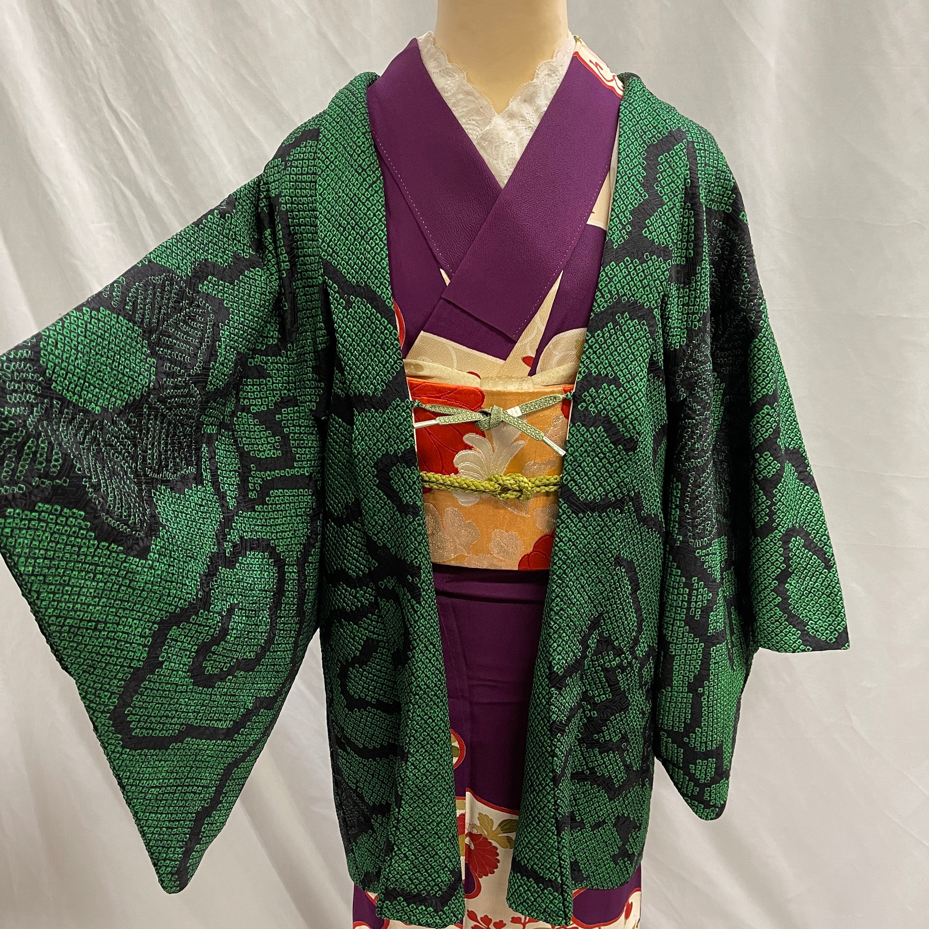 羽織 総絞り 緑地 裄65cm 大輪の花