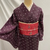 赤地でパステル調のお花の飛び柄のシックな帯です。