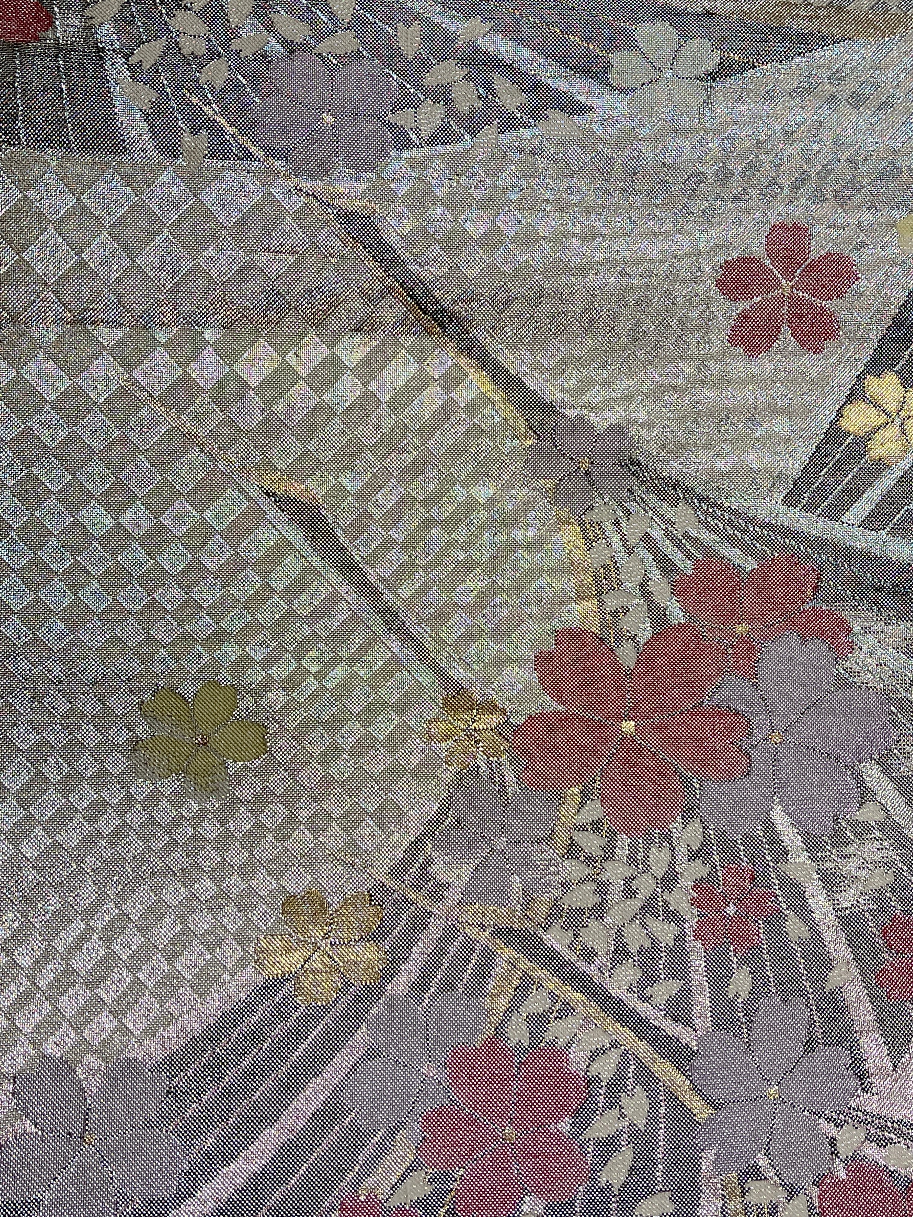 袋帯 シルバー系 市松 鶴 パステルカラーのお花 フォーマル 振袖 留袖 訪問着 色無地