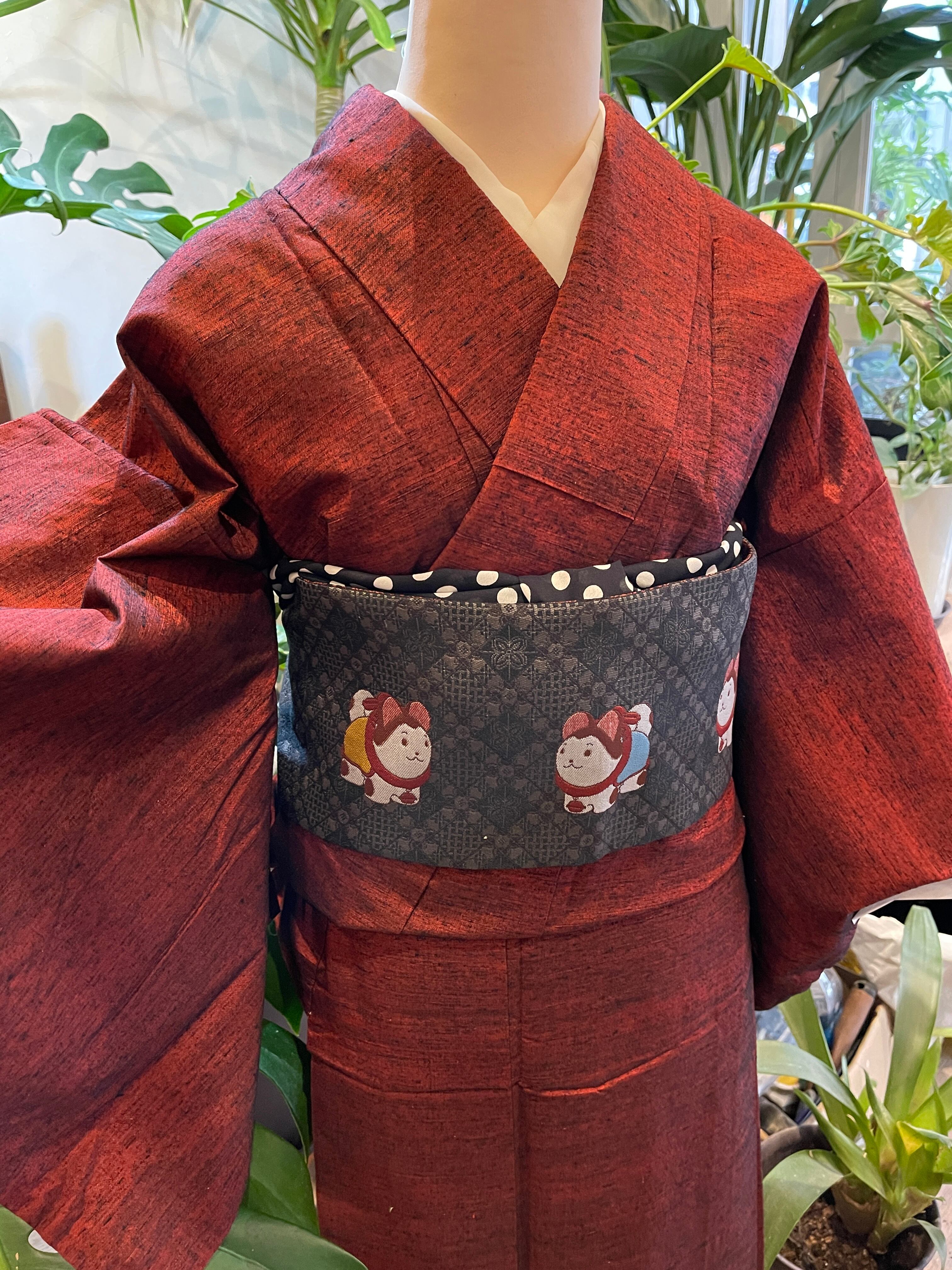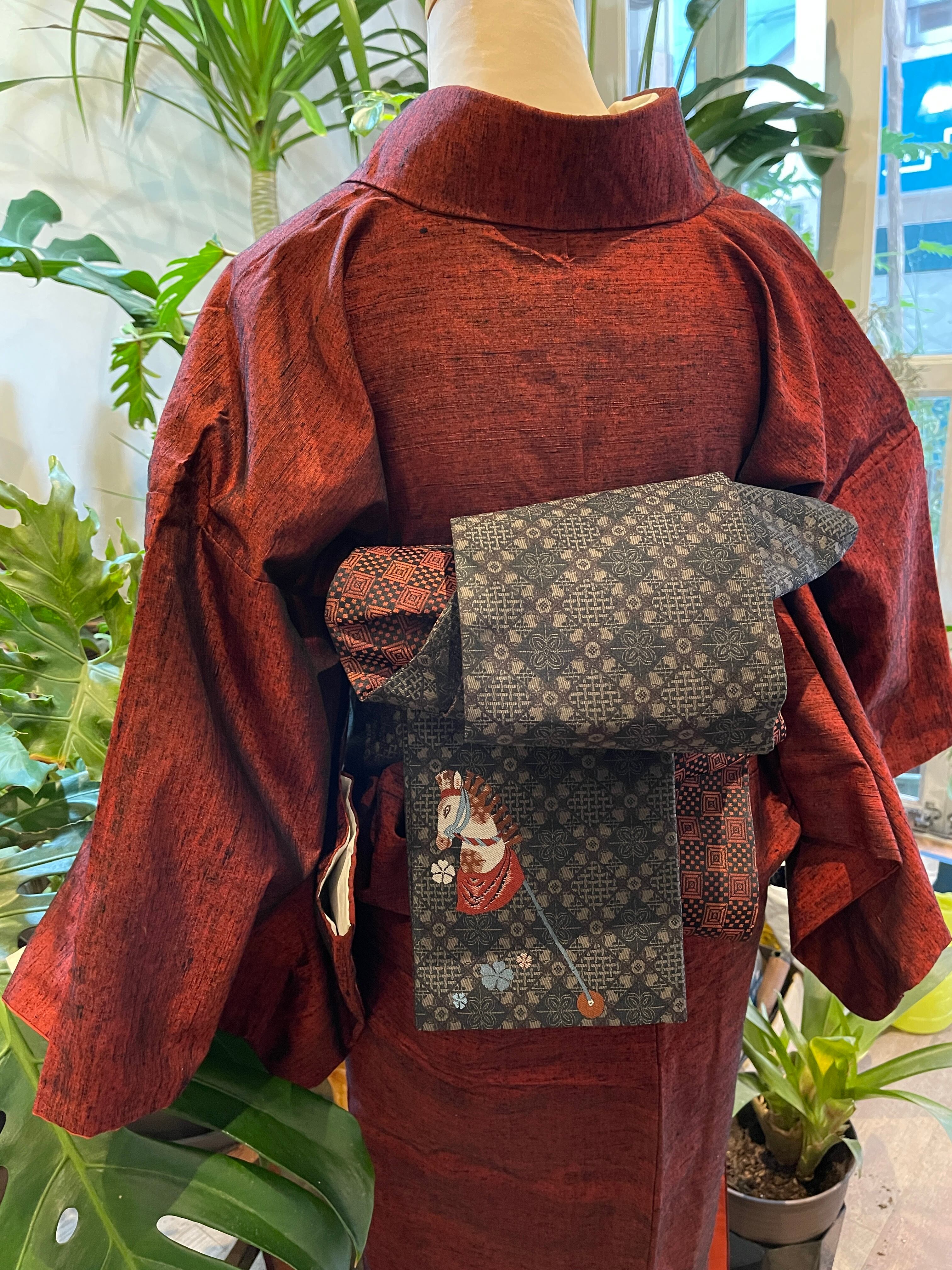 半幅帯 黒系 玩具 こま犬 騎馬 格子 花紋 リバーシブル 普段着 カジュアル