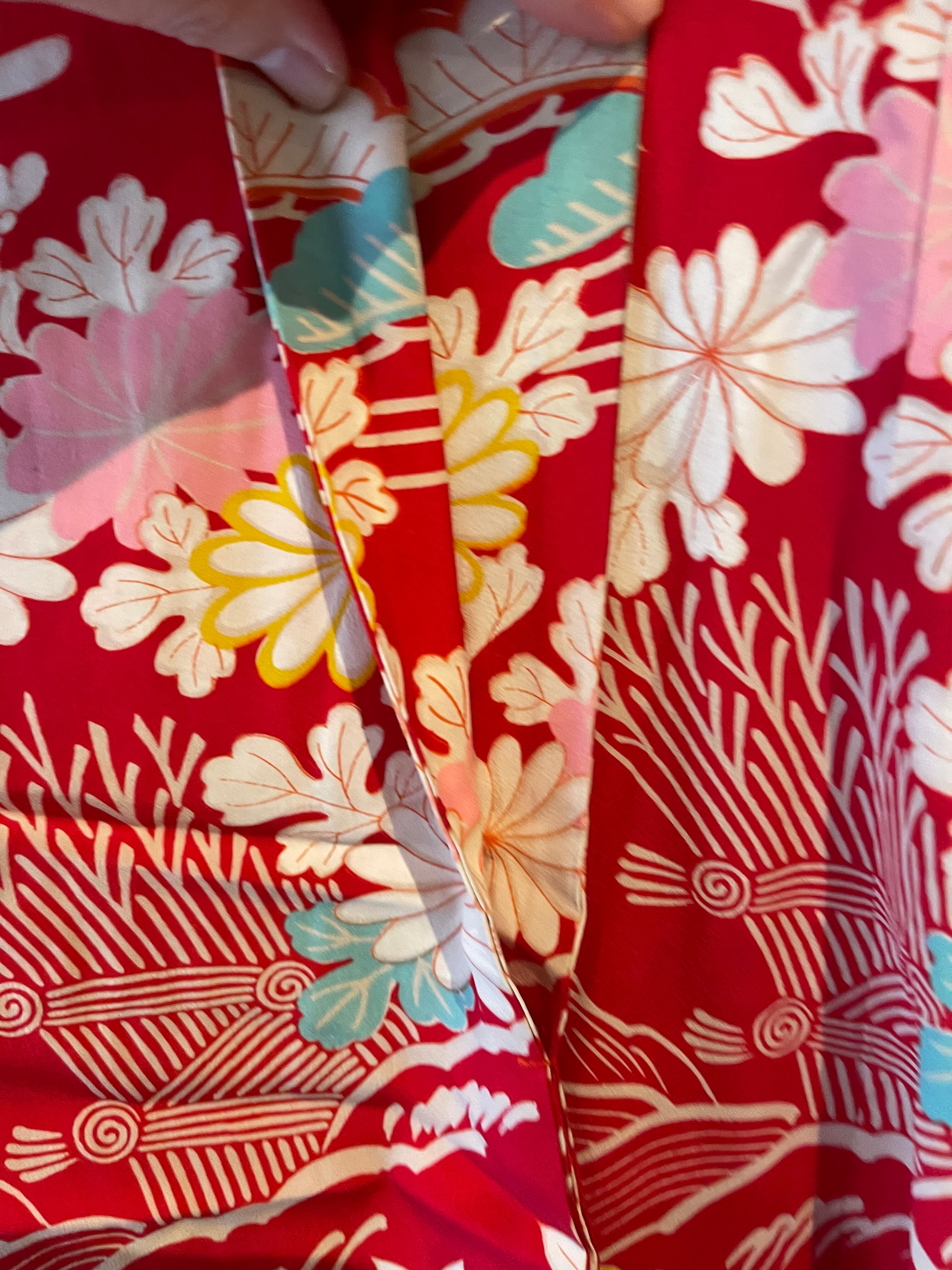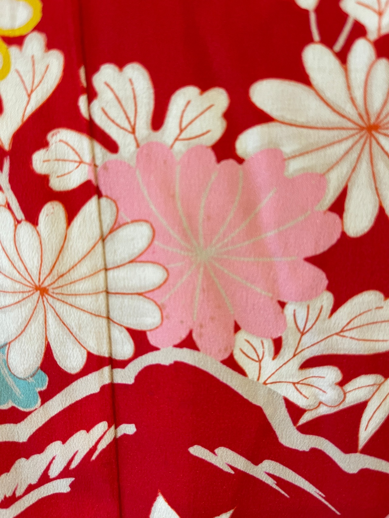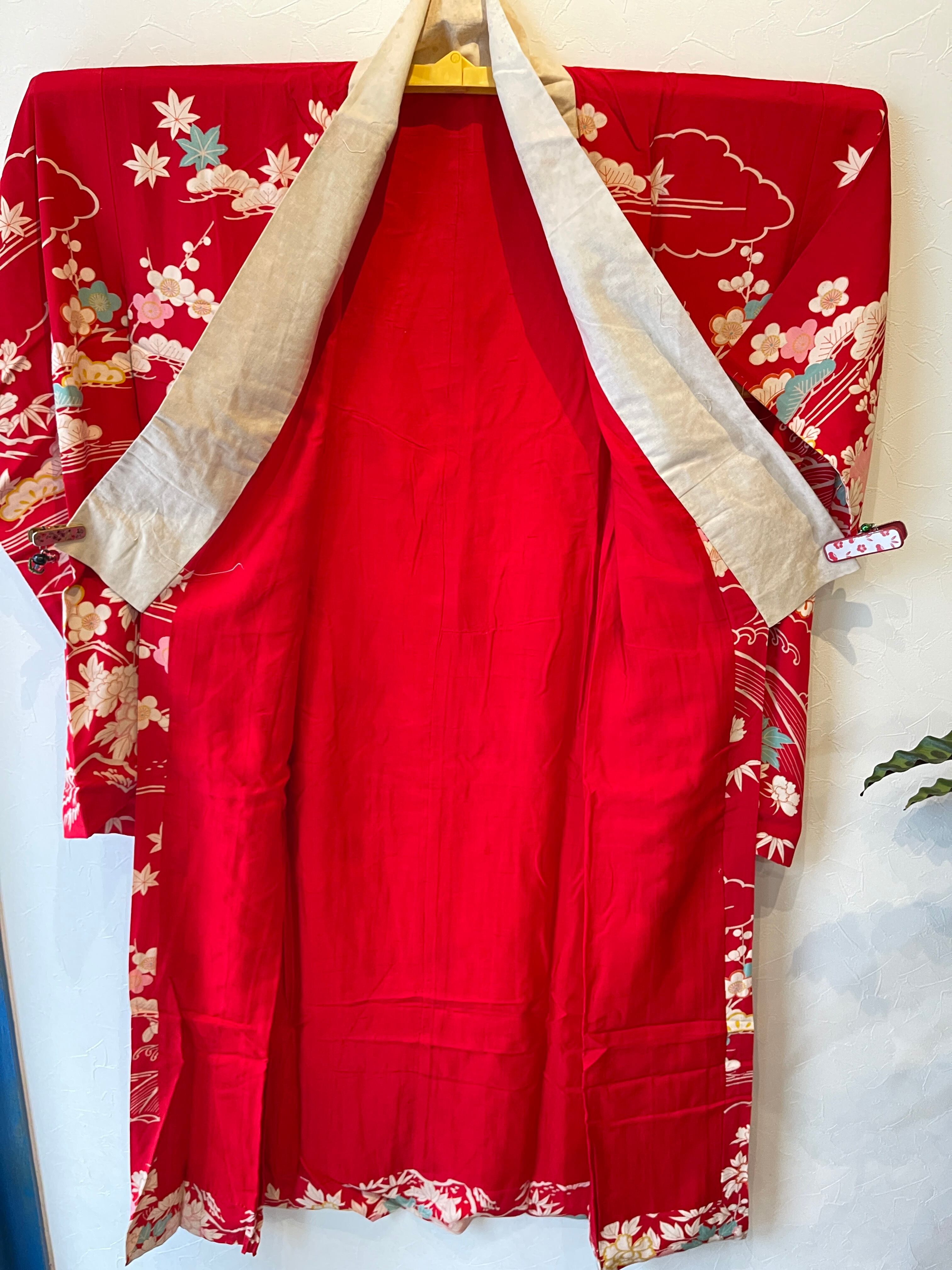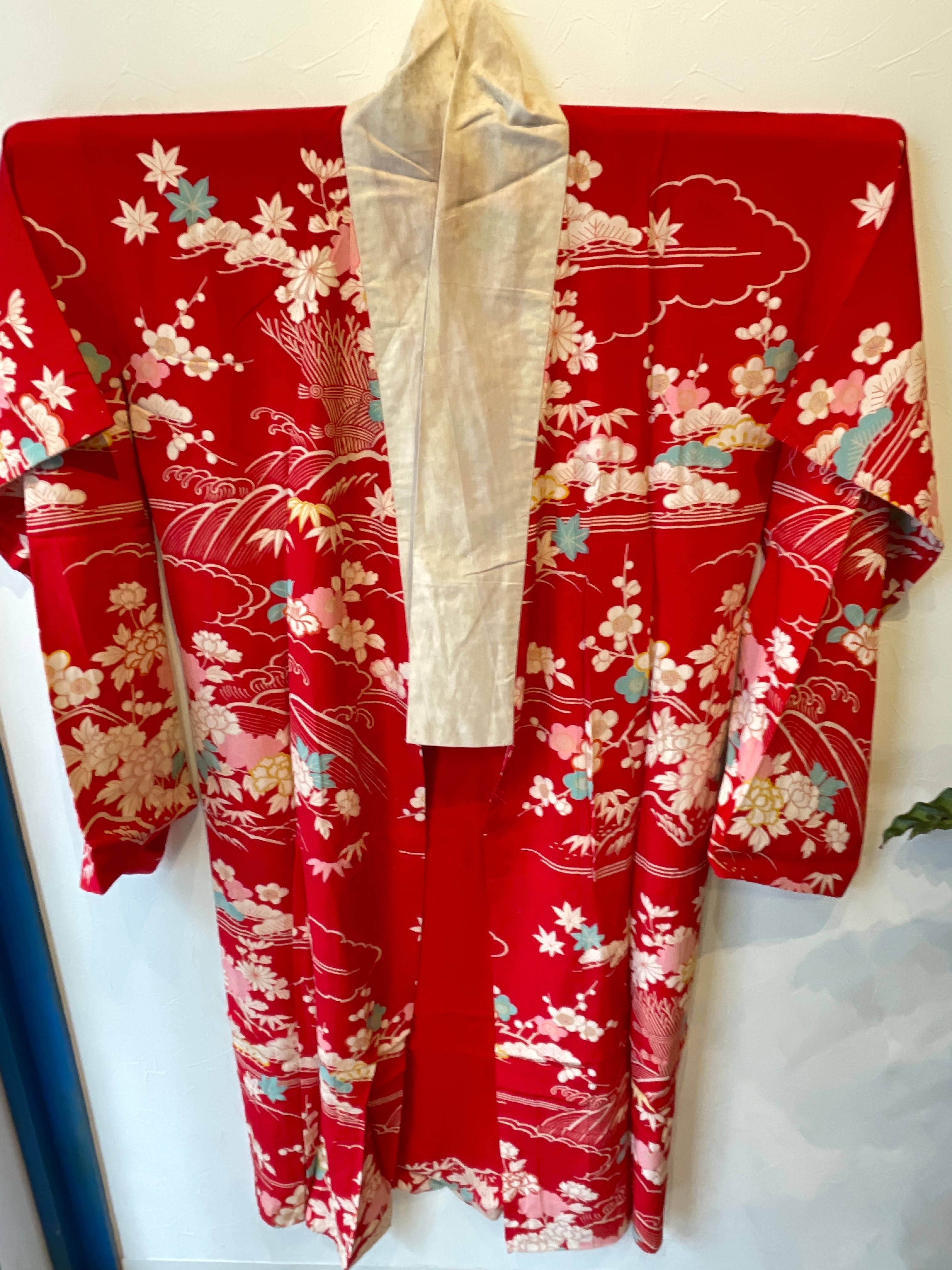 赤地に四季の花、見えないおしゃれが楽しめる一枚です。