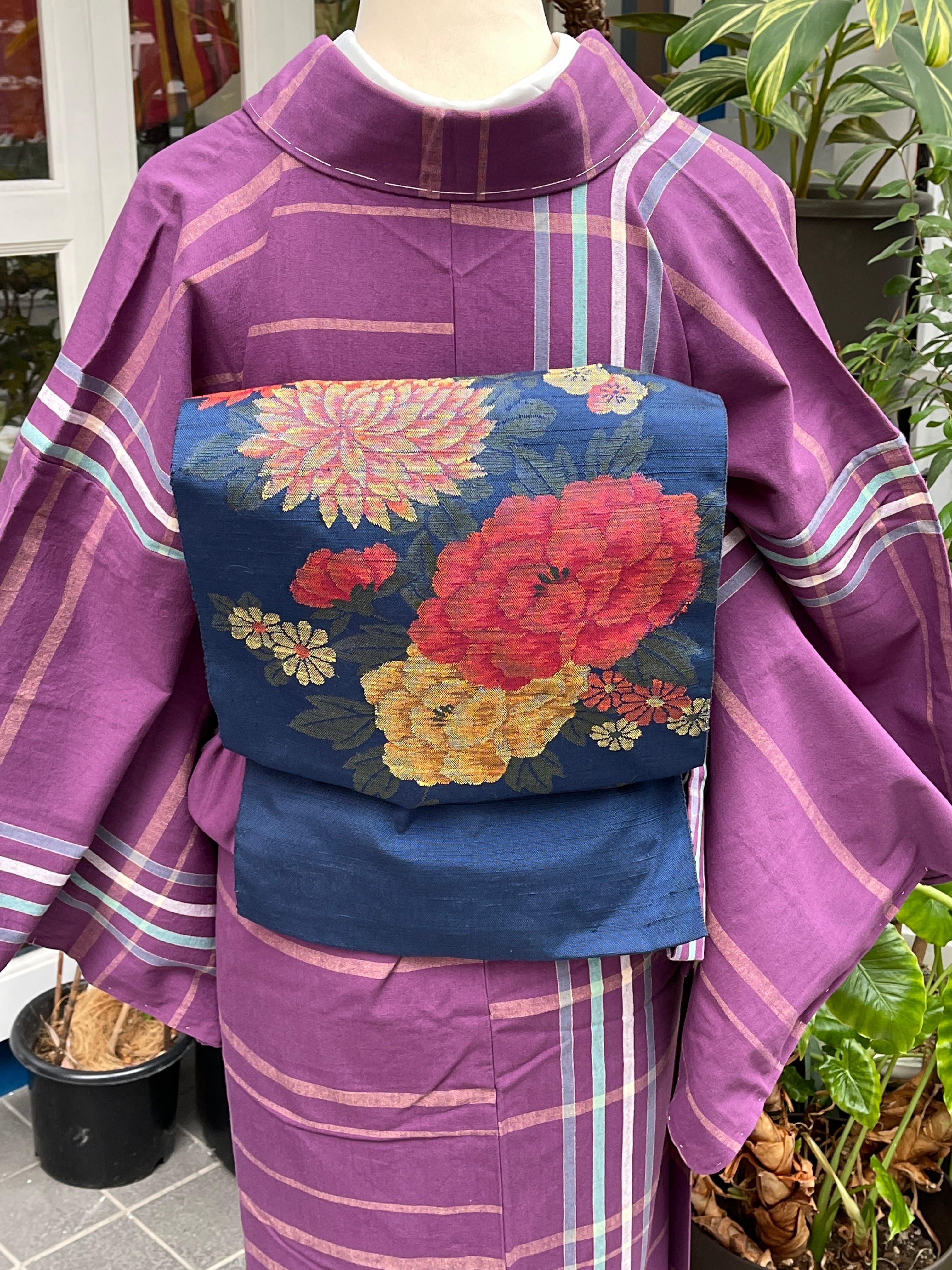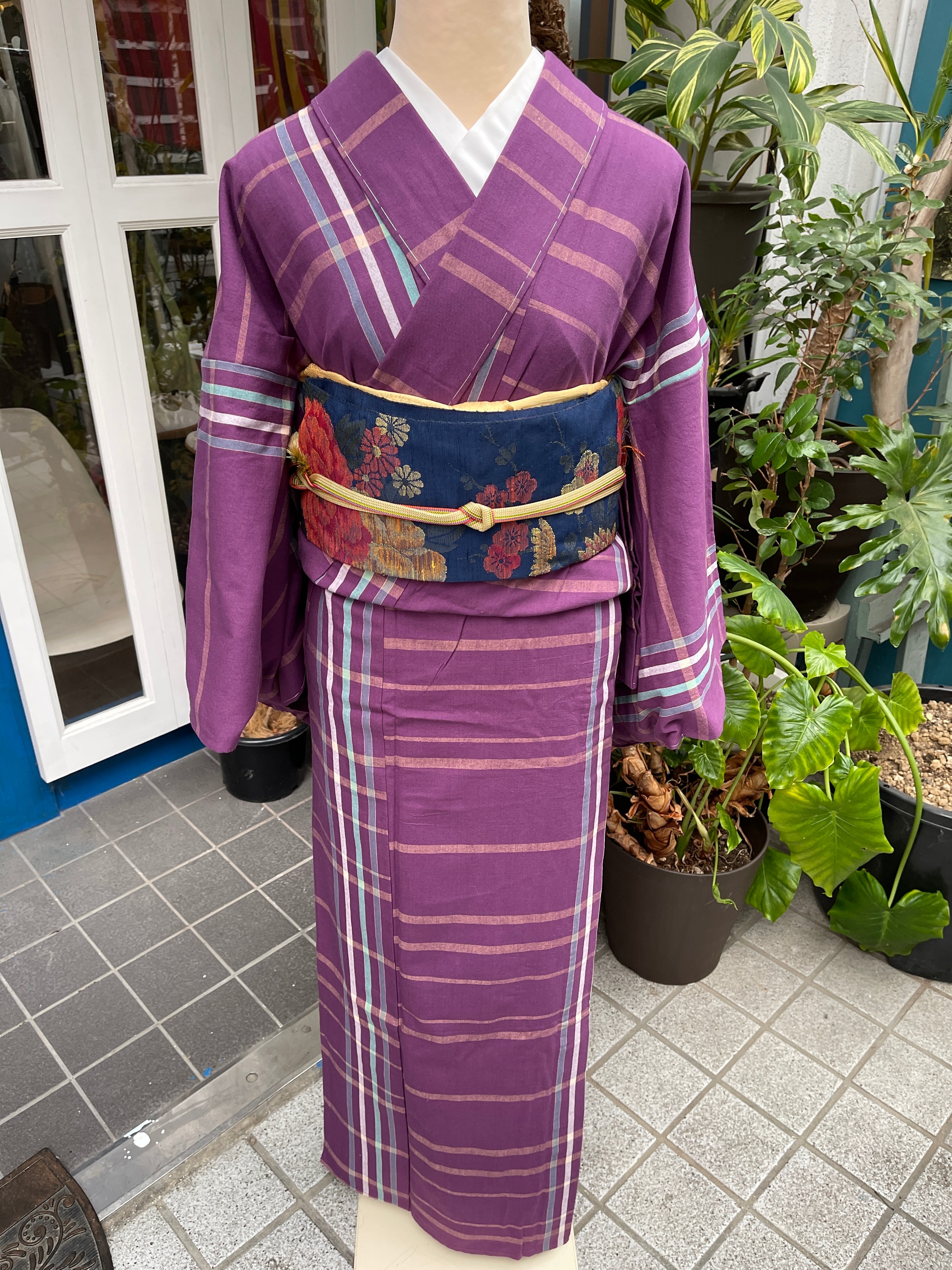 木綿着物 臼井織布 伊勢木綿 証紙あり 洗える着物 紫系 格子カジュアル
