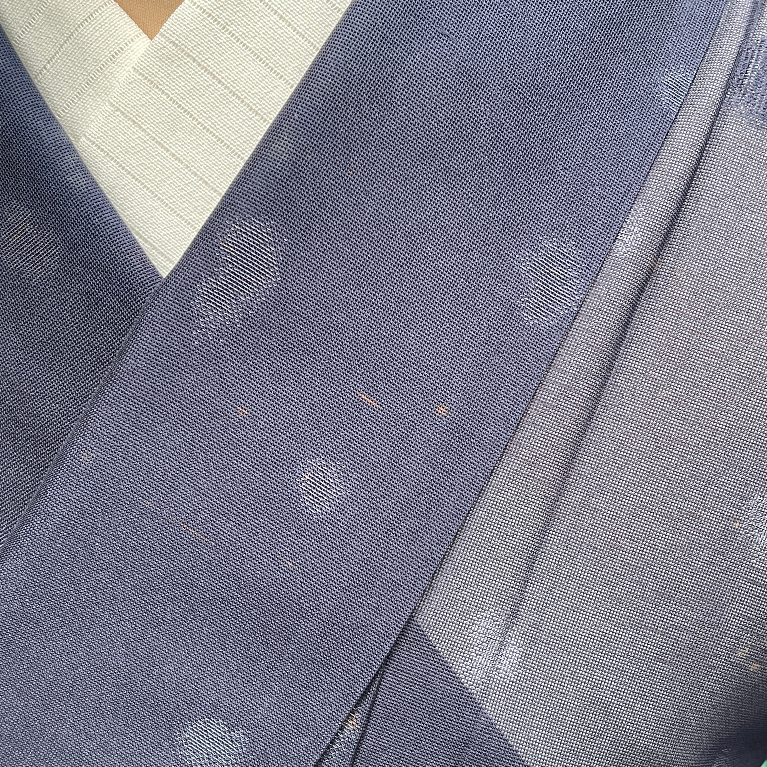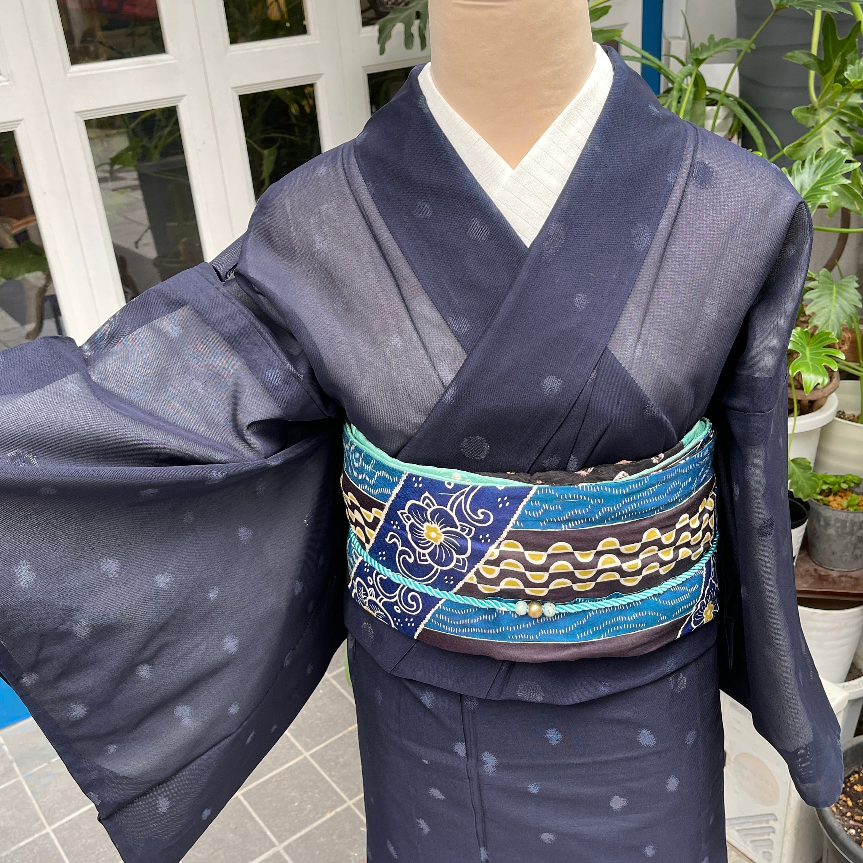 紺地に水玉で所々に銀糸が使われていてとても涼しげな夏着物です。