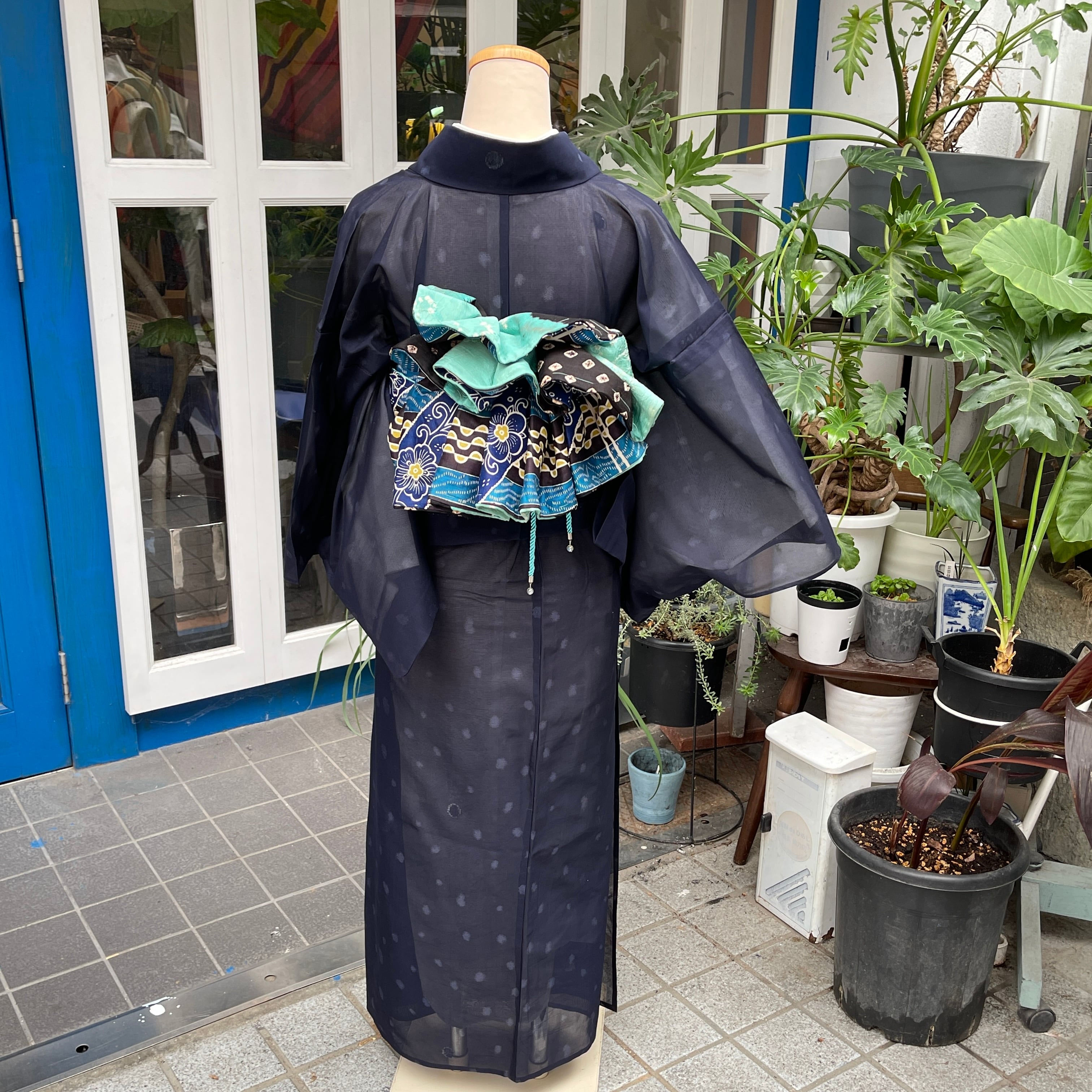アンティーク着物 夏着物 紗 ssize ゆったりサイズ 濃紺 水玉 銀糸 低身長さん