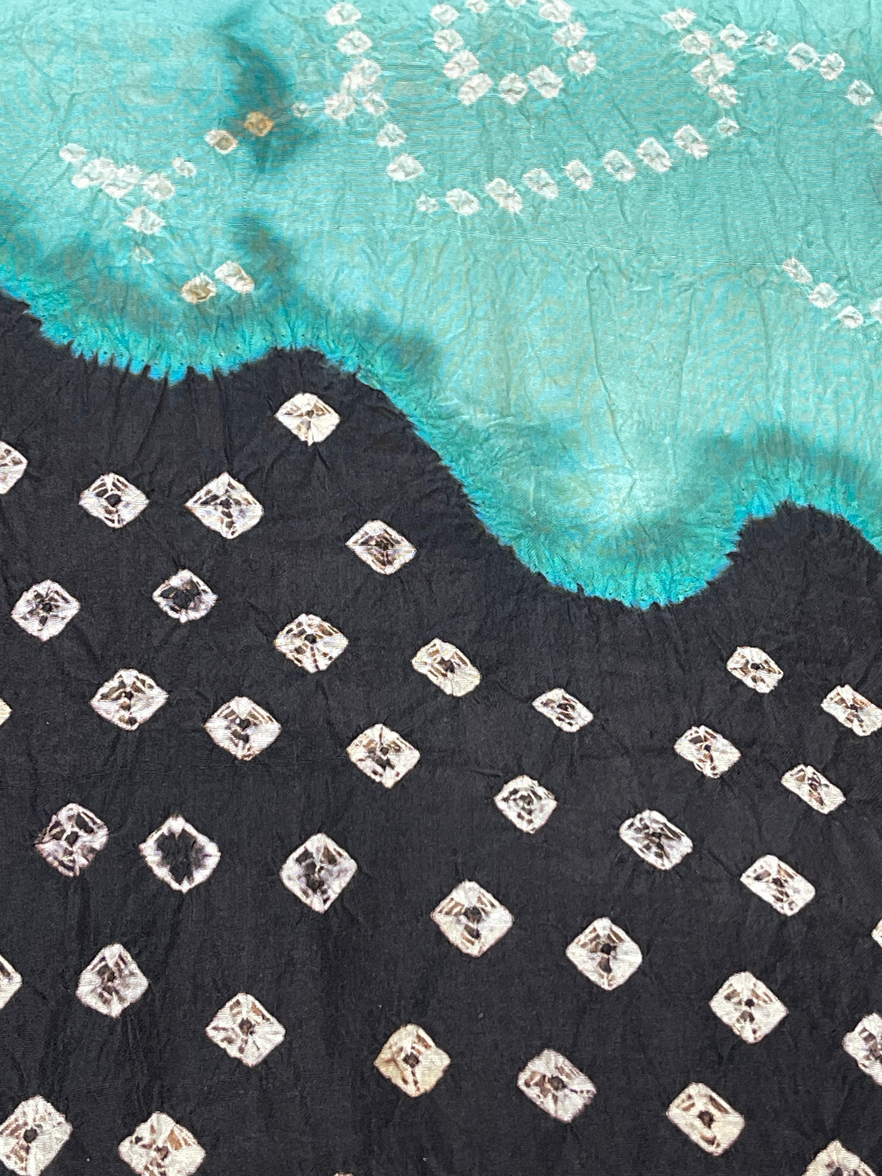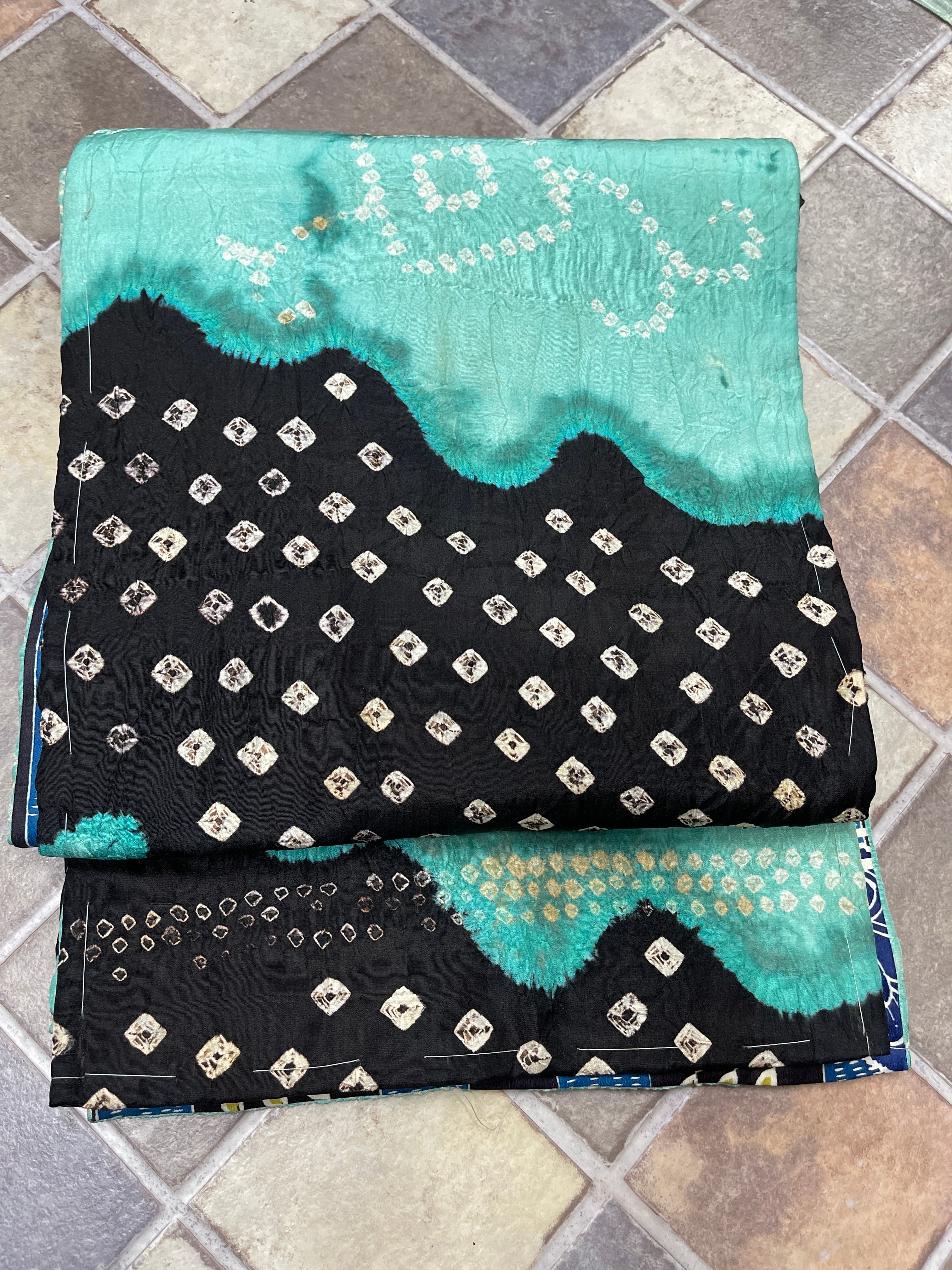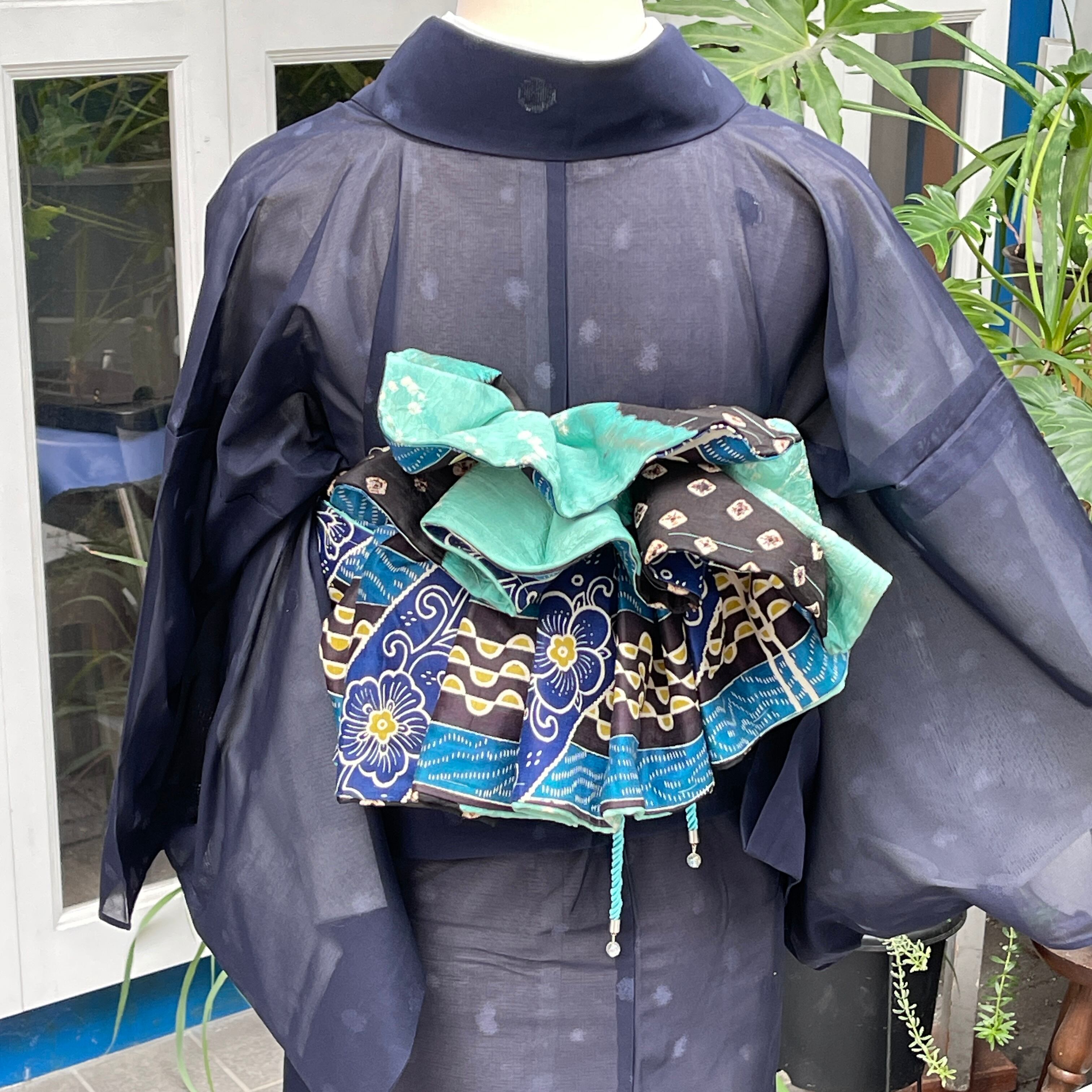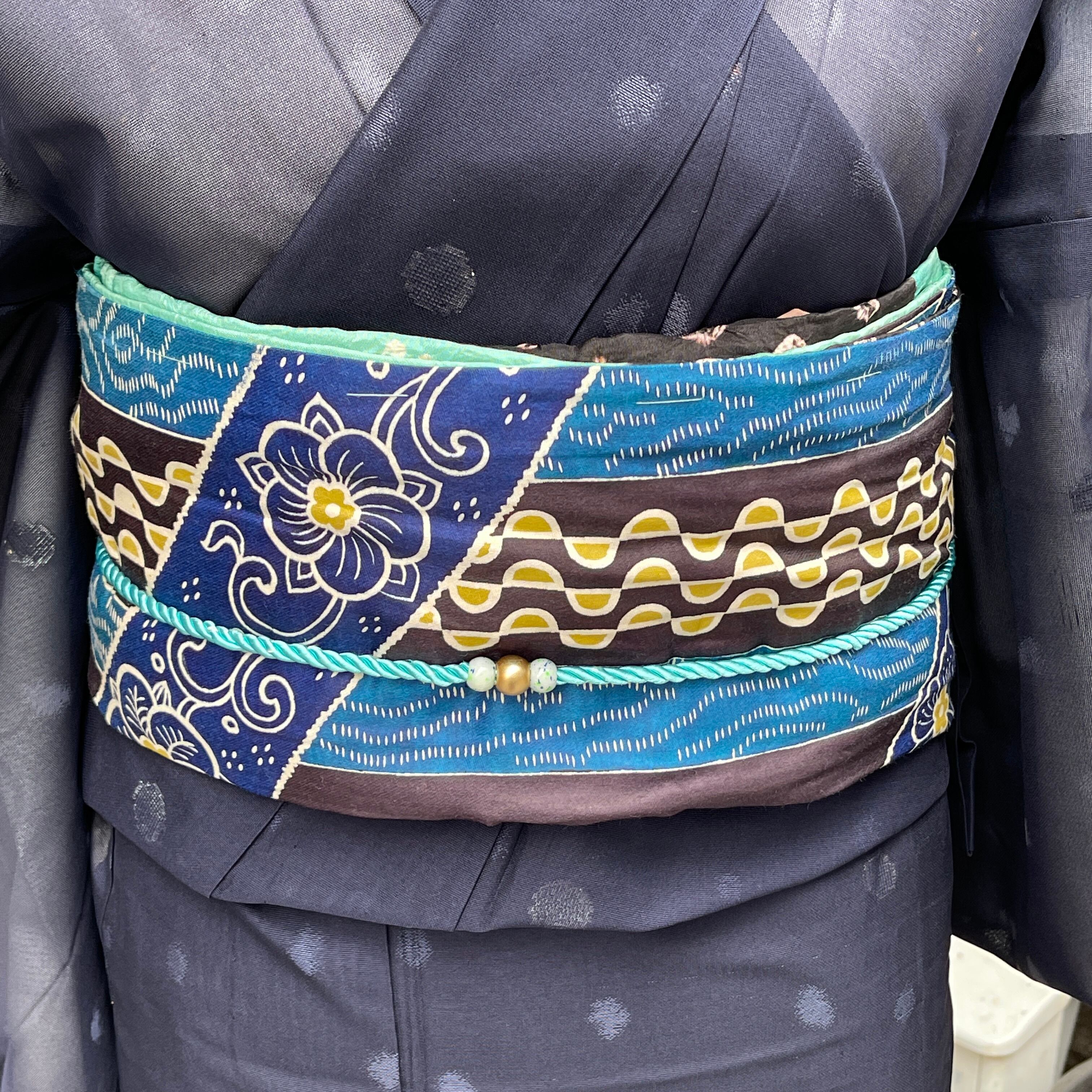 アンティーク帯 京袋帯 ファブリック帯 ブルー系 エメラルドグリーン兵児帯 リバーシブル 絞り 花唐草