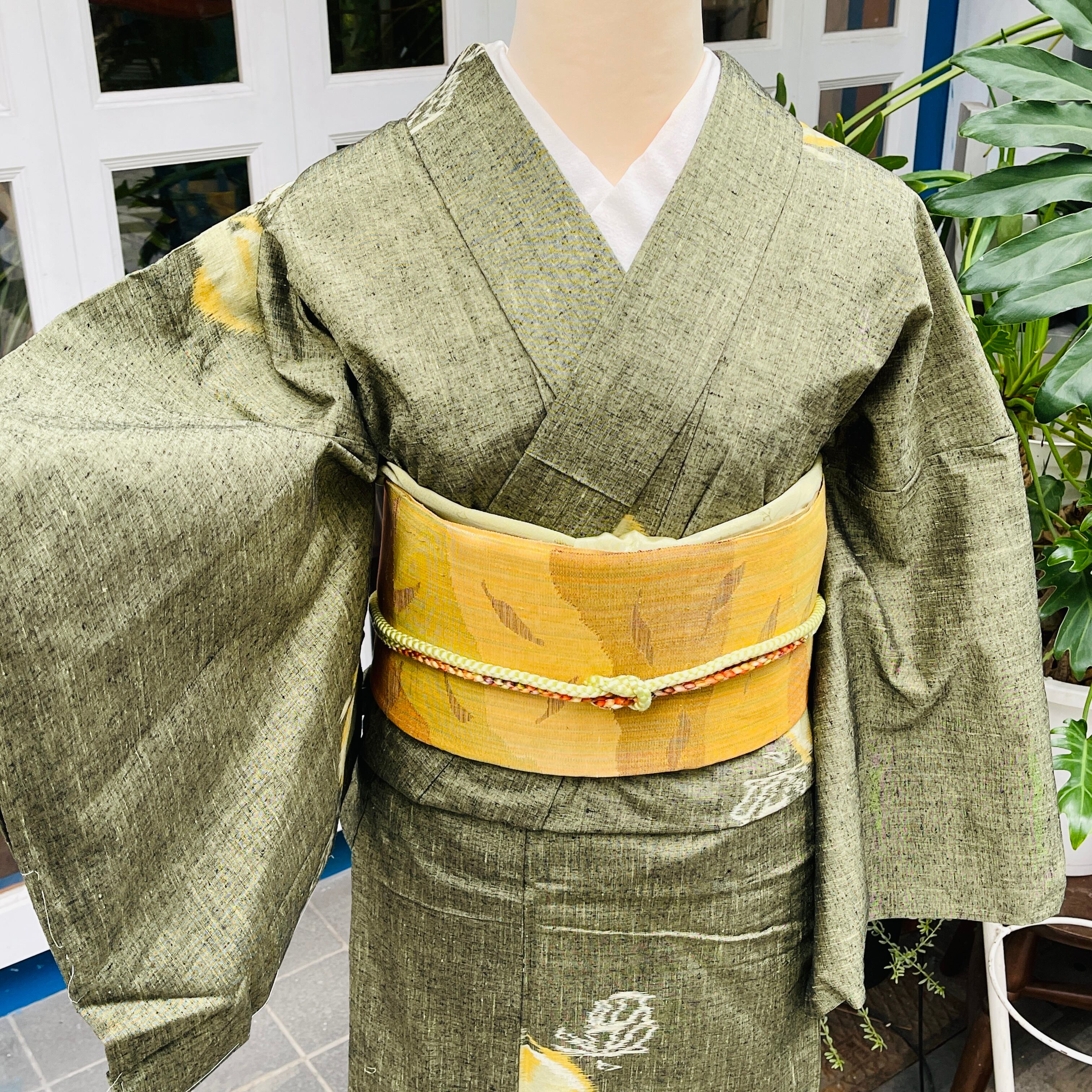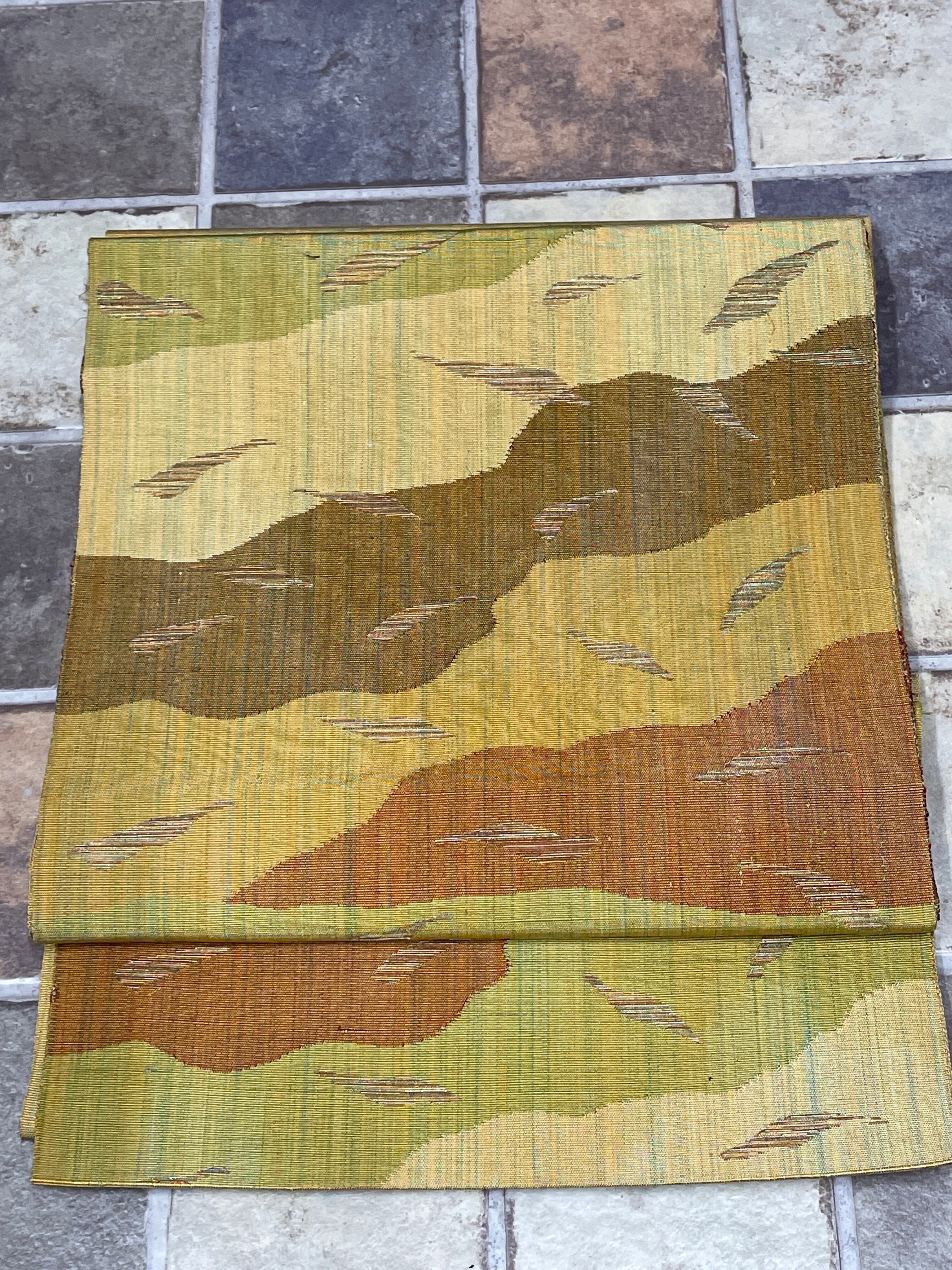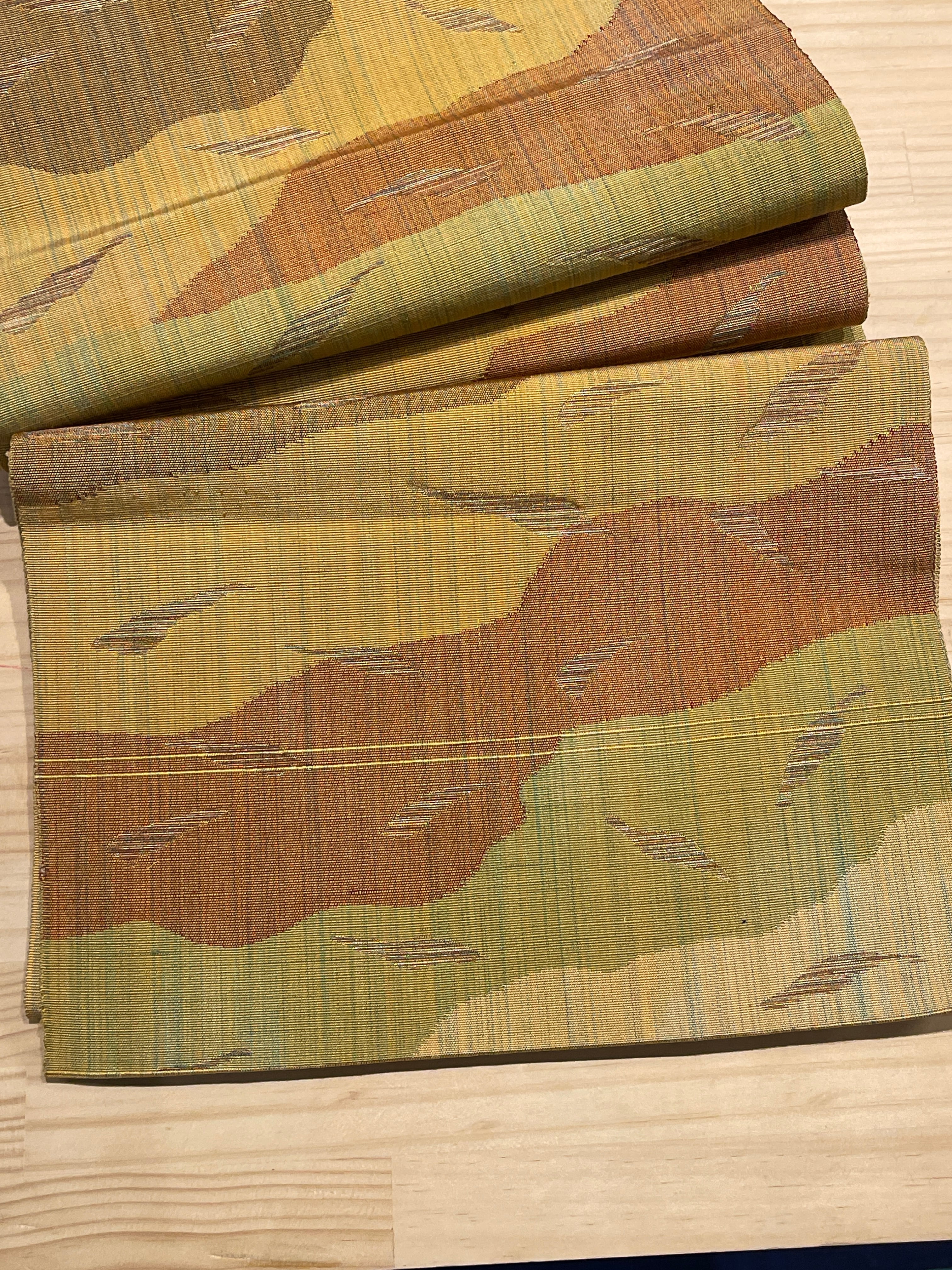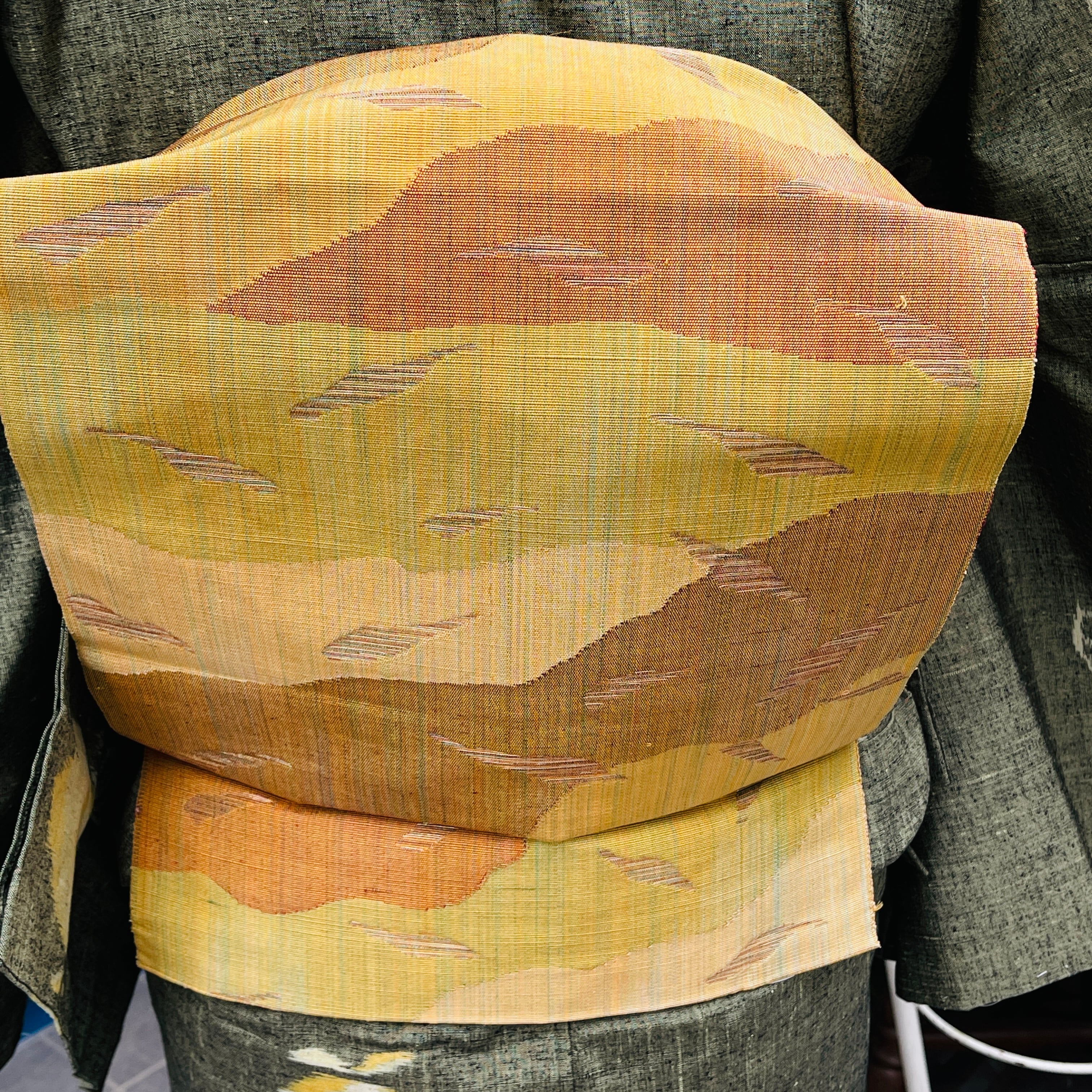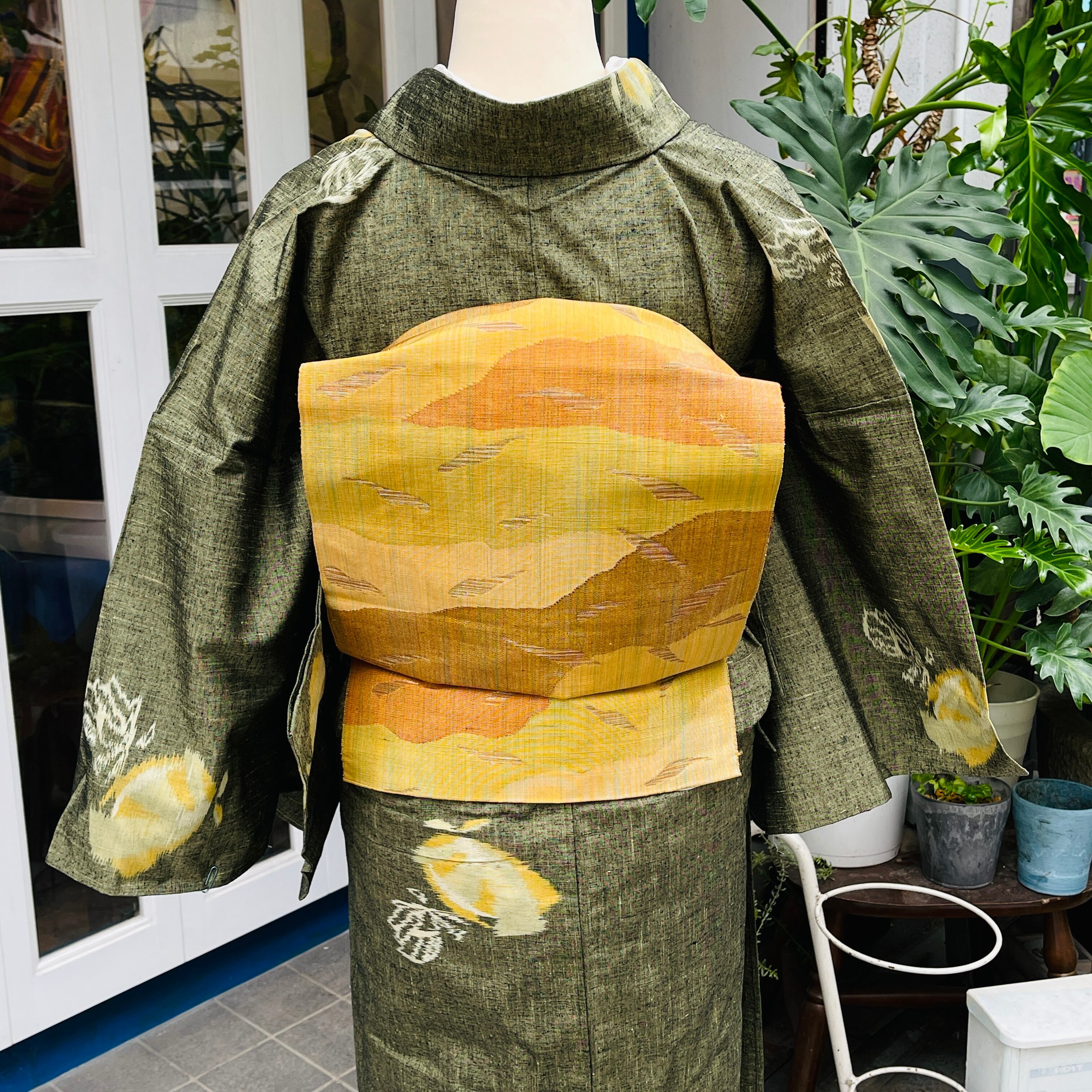 八寸名古屋帯 紬 イエロー系 葉っぱ カジュアル 普段着 お稽古