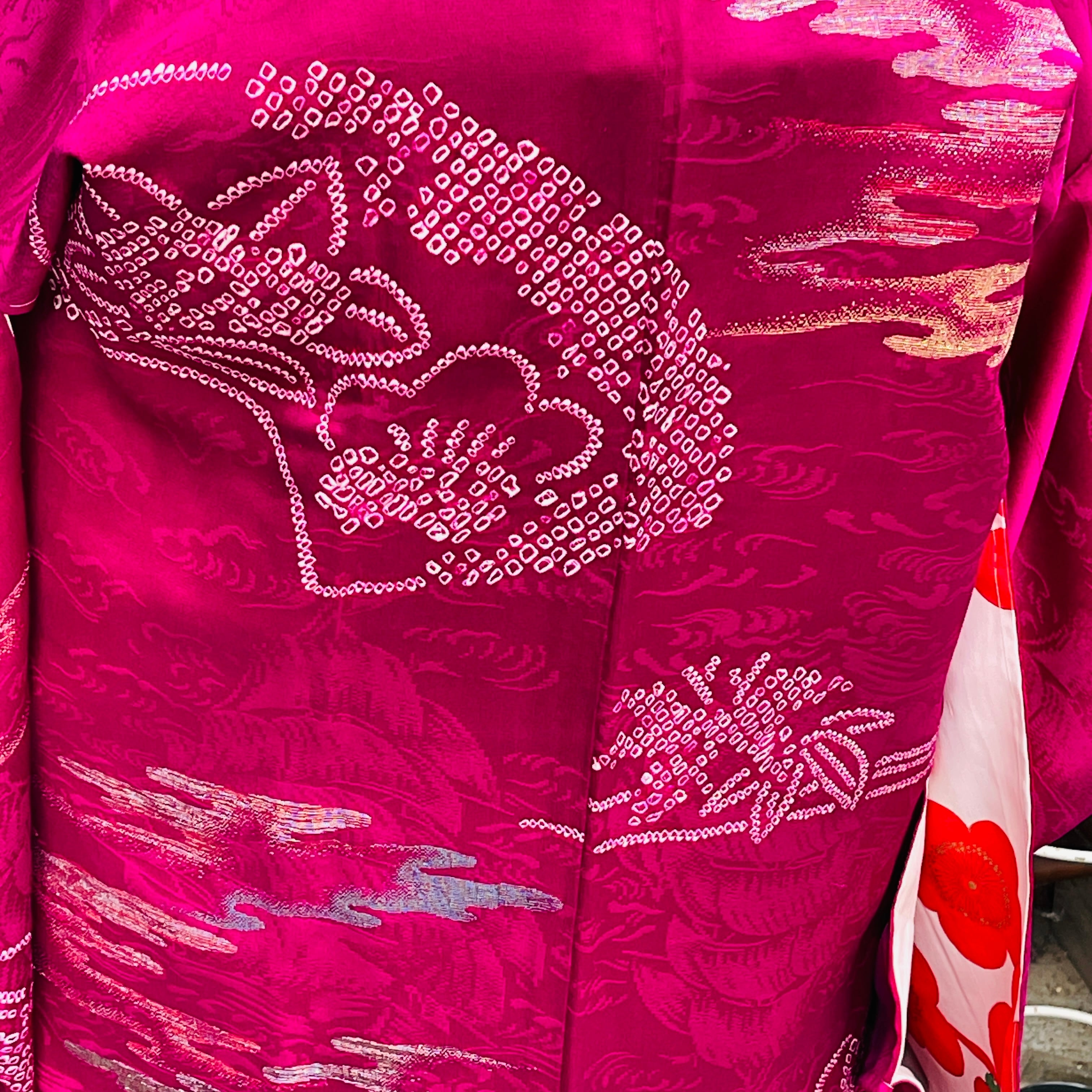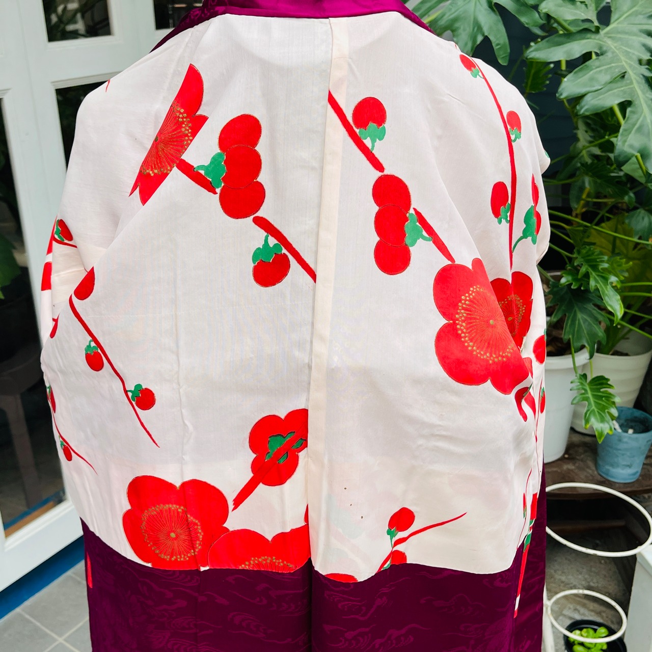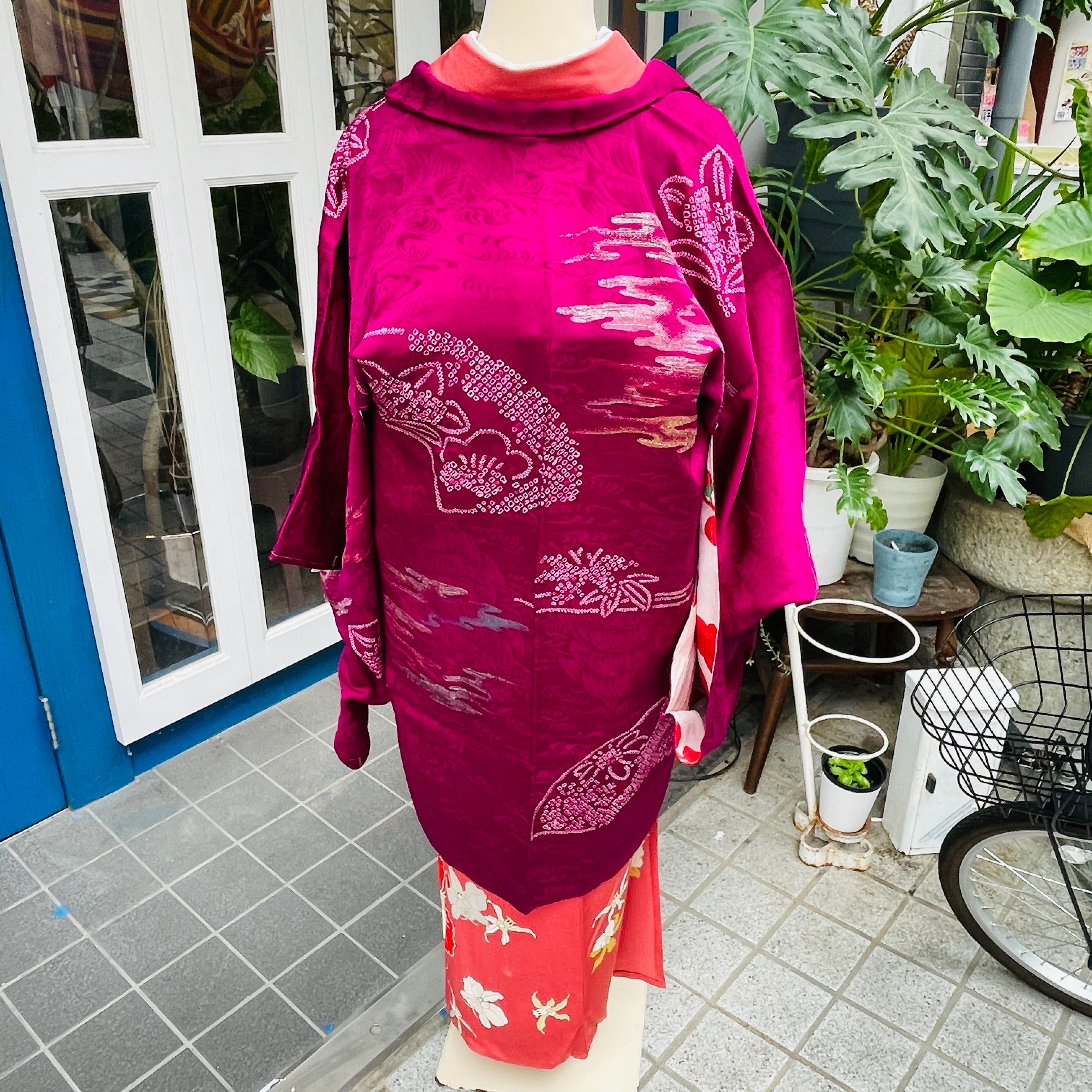 アンティーク羽織 羽織 赤紫地 絞り 橘 扇 金糸 銀糸 霞雲 帆船地模様