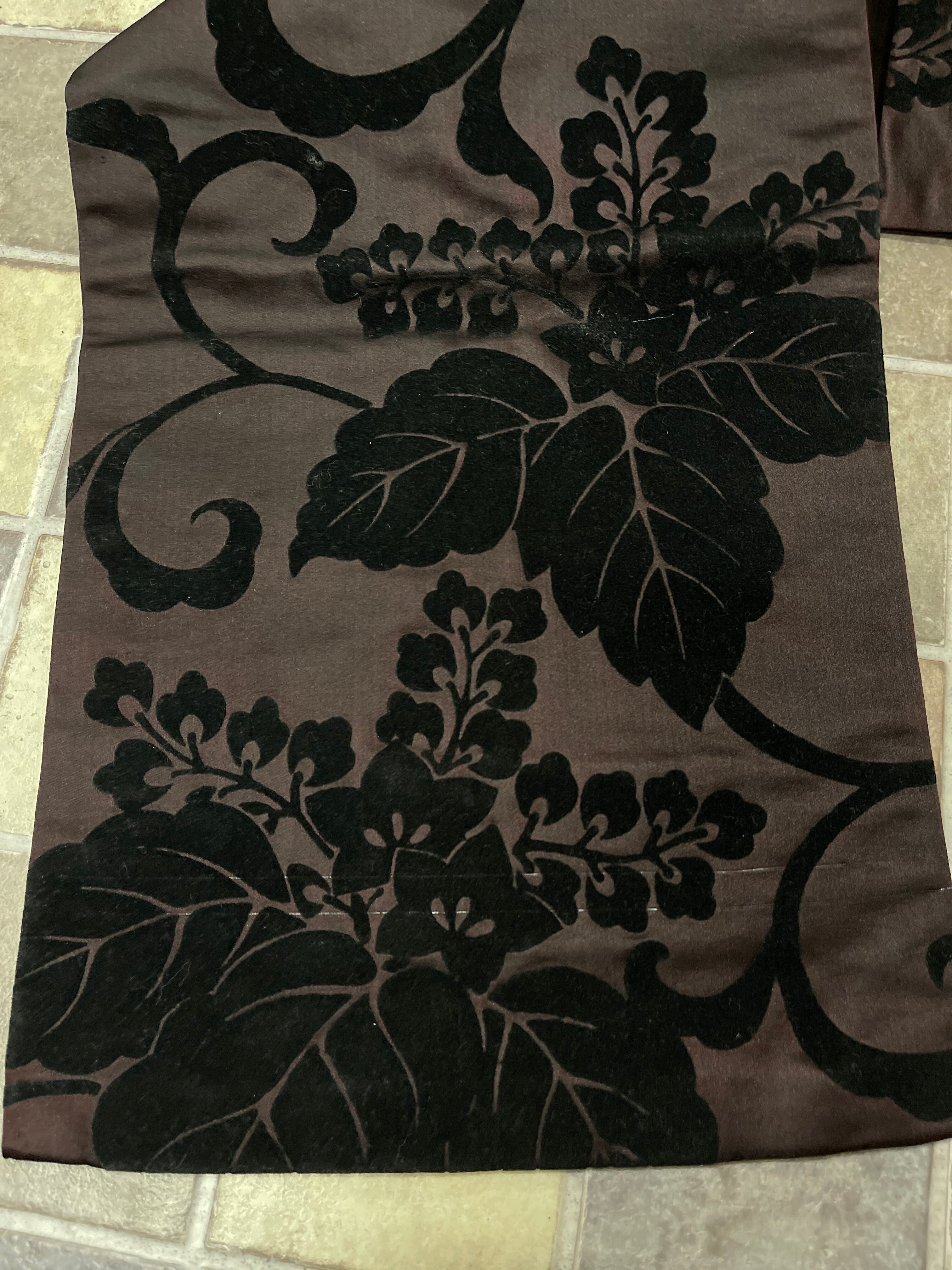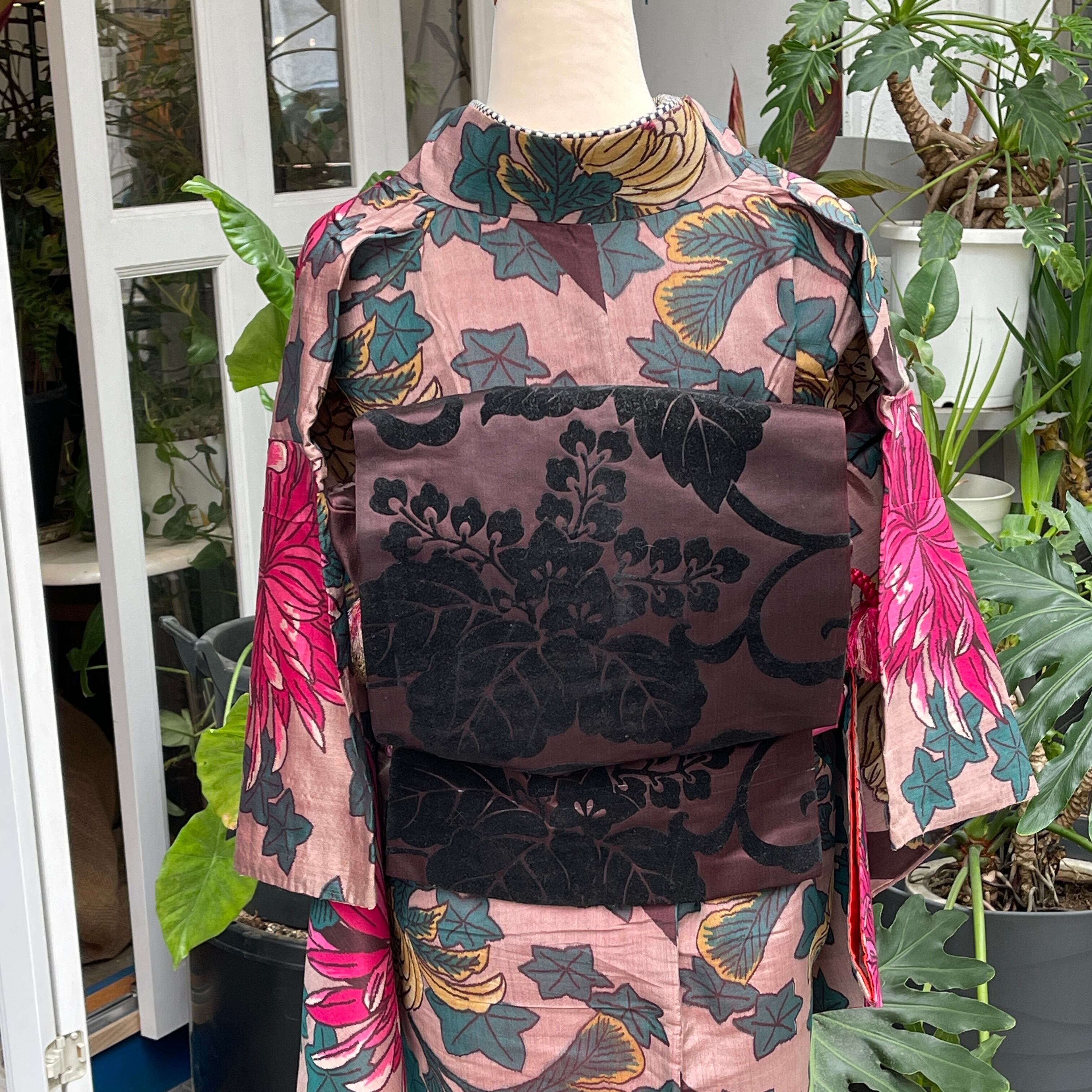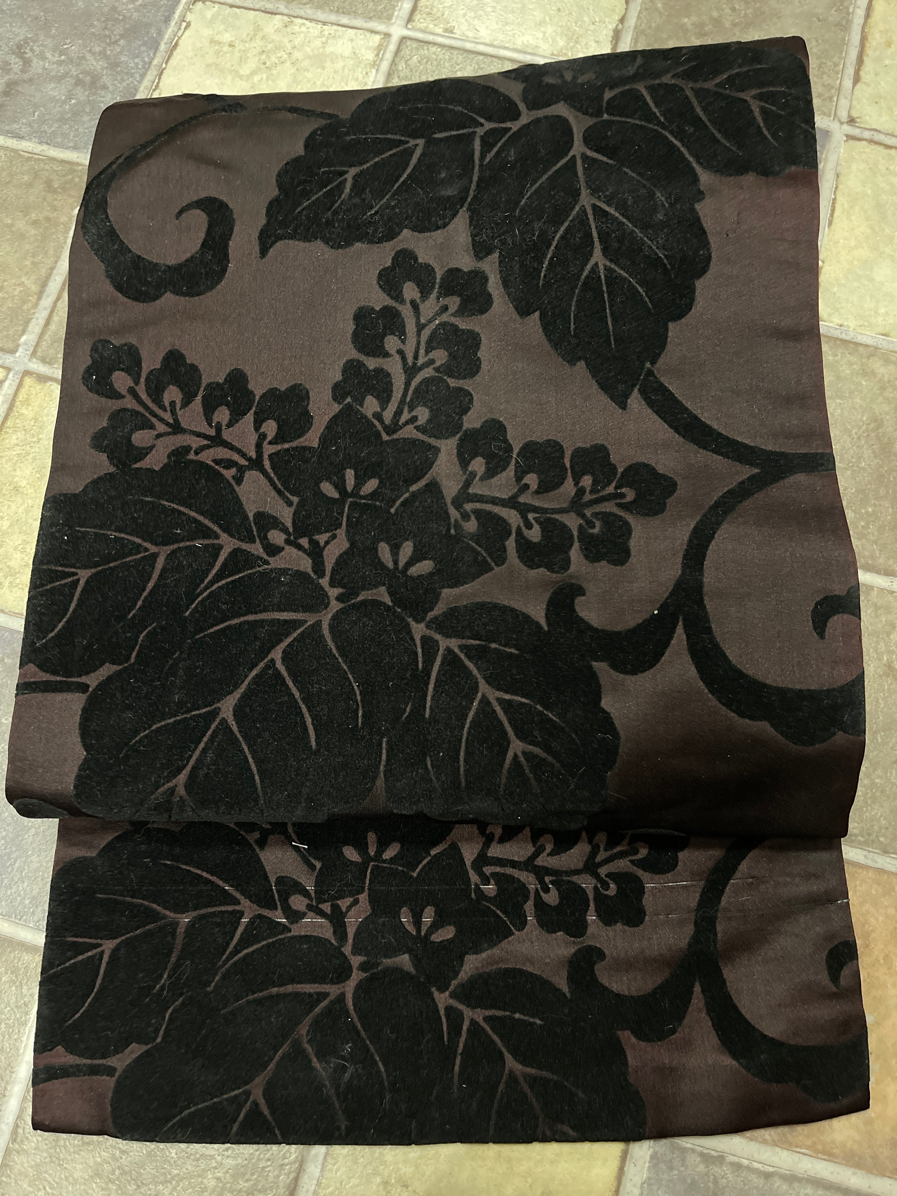 赤みがかった黒地の繻子帯に黒地のベルベットの桐唐草のアンティーク名古屋帯です。