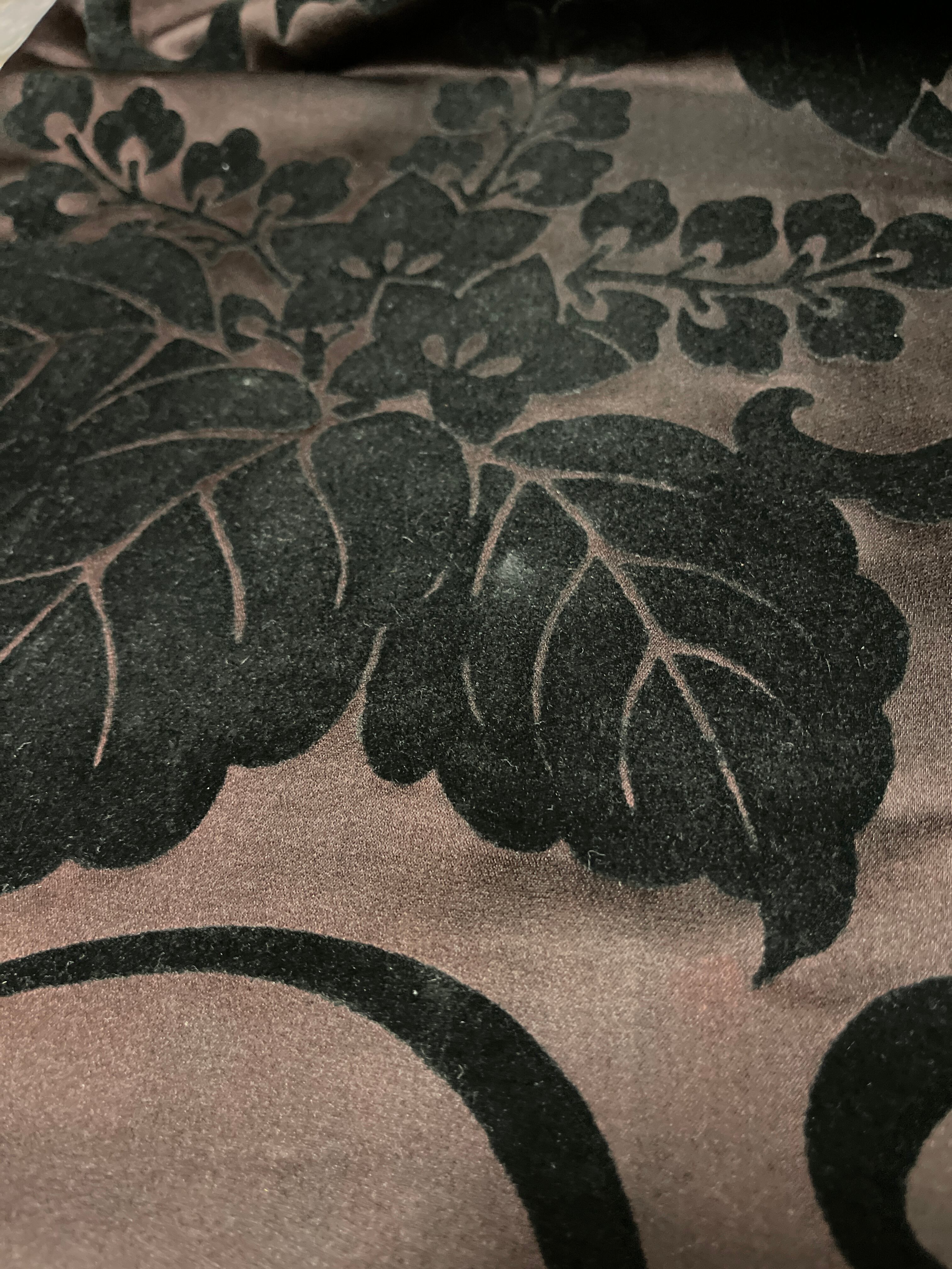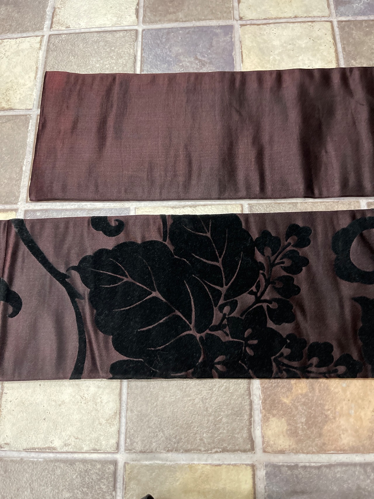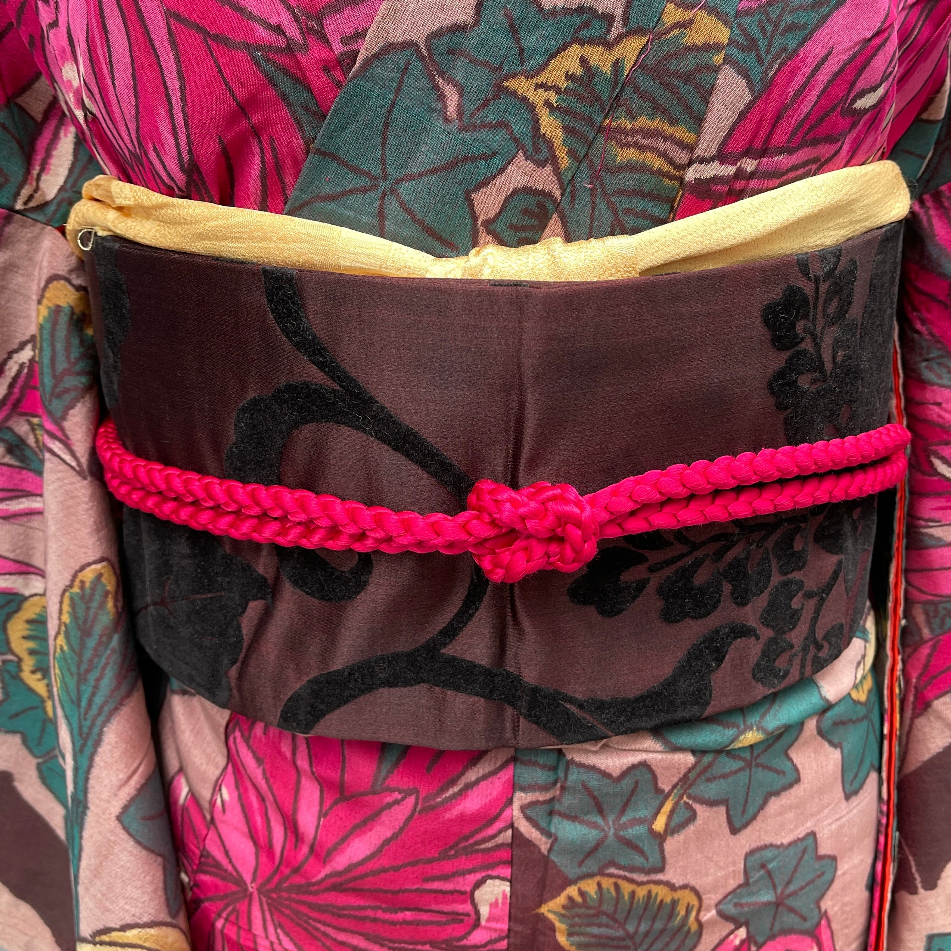 赤みがかった黒地の繻子帯に黒地のベルベットの桐唐草のアンティーク名古屋帯です。