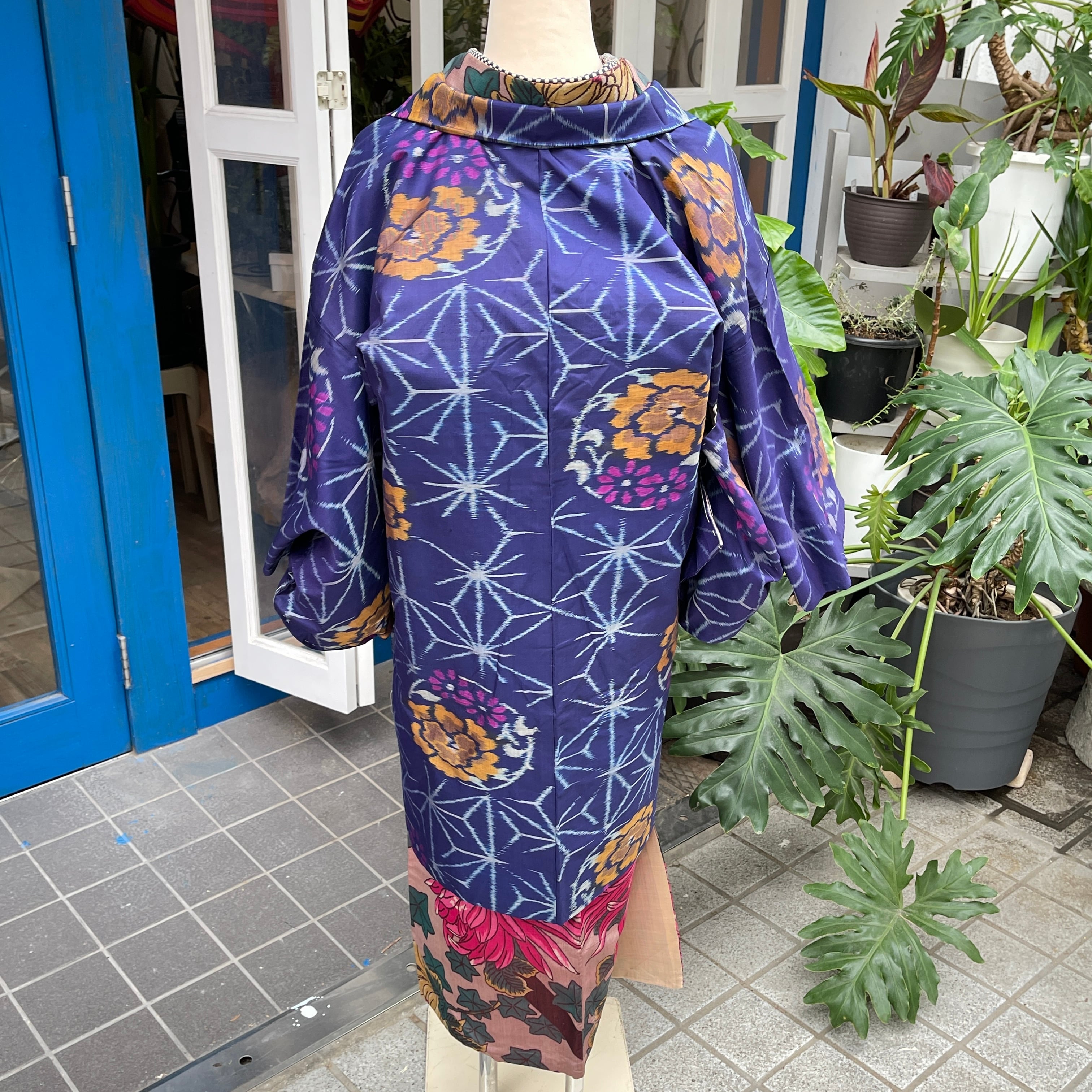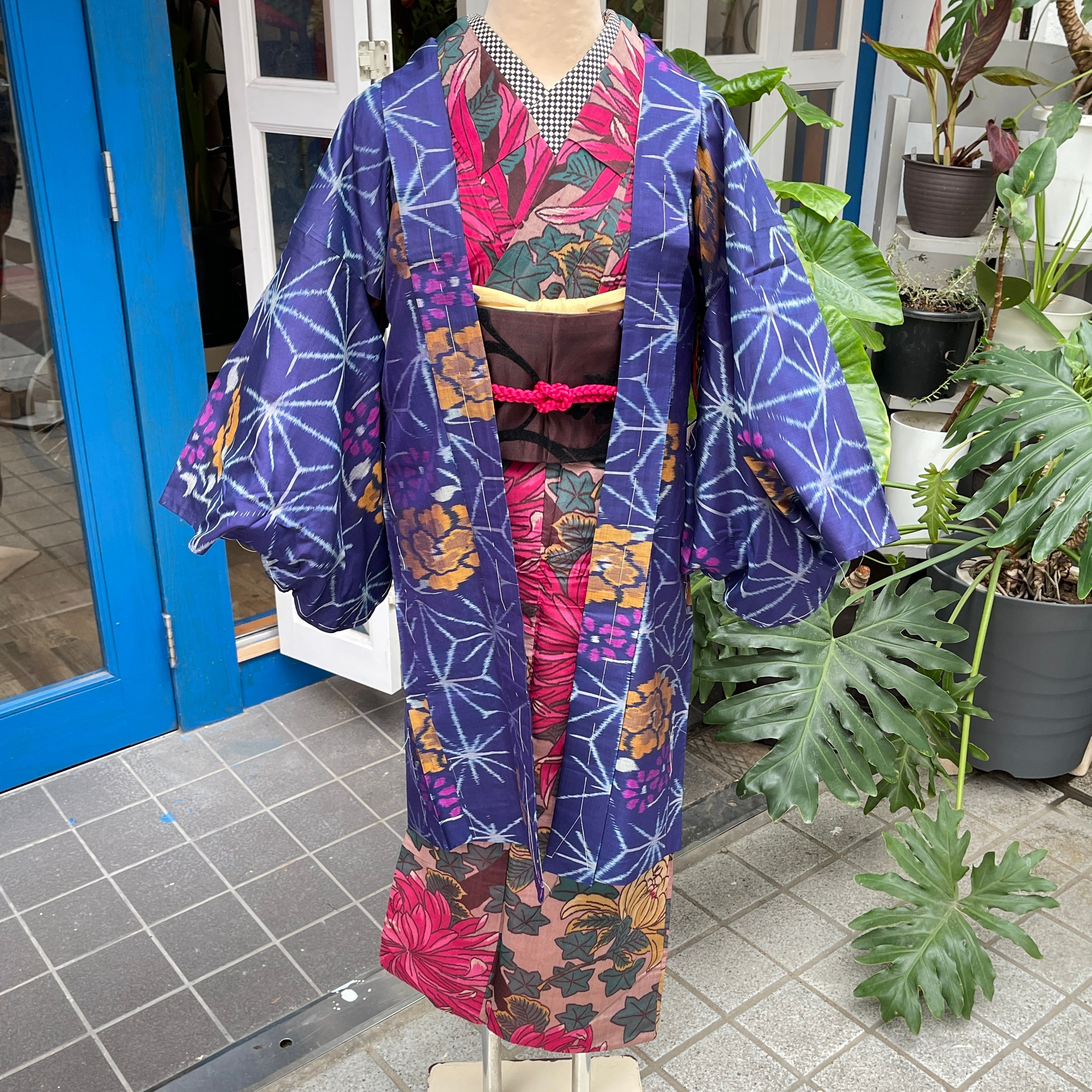アンティーク羽織 長羽織 羽織 ブルー系 裄65cm 銘仙 麻の葉 花紋 大正ロマン