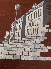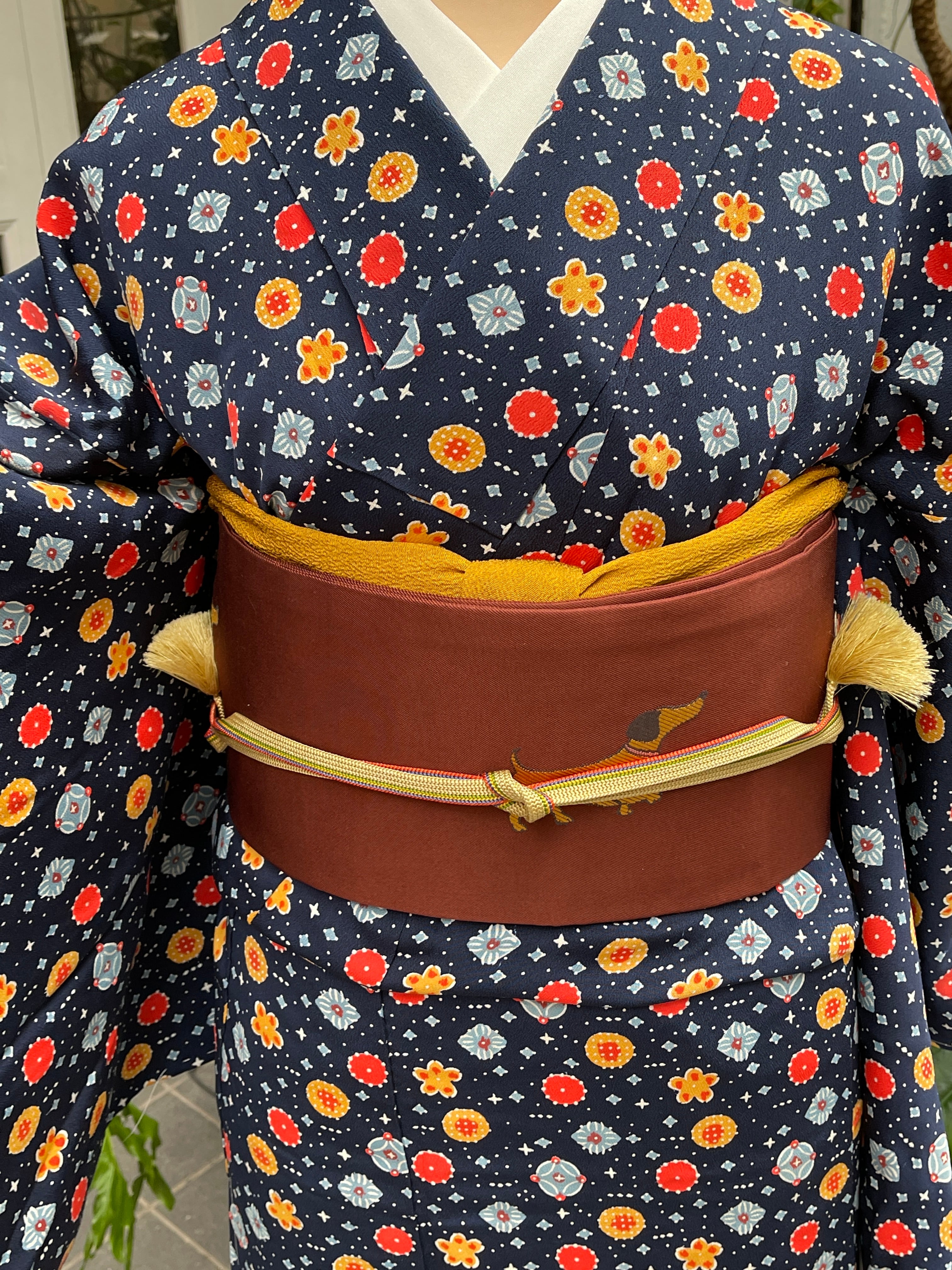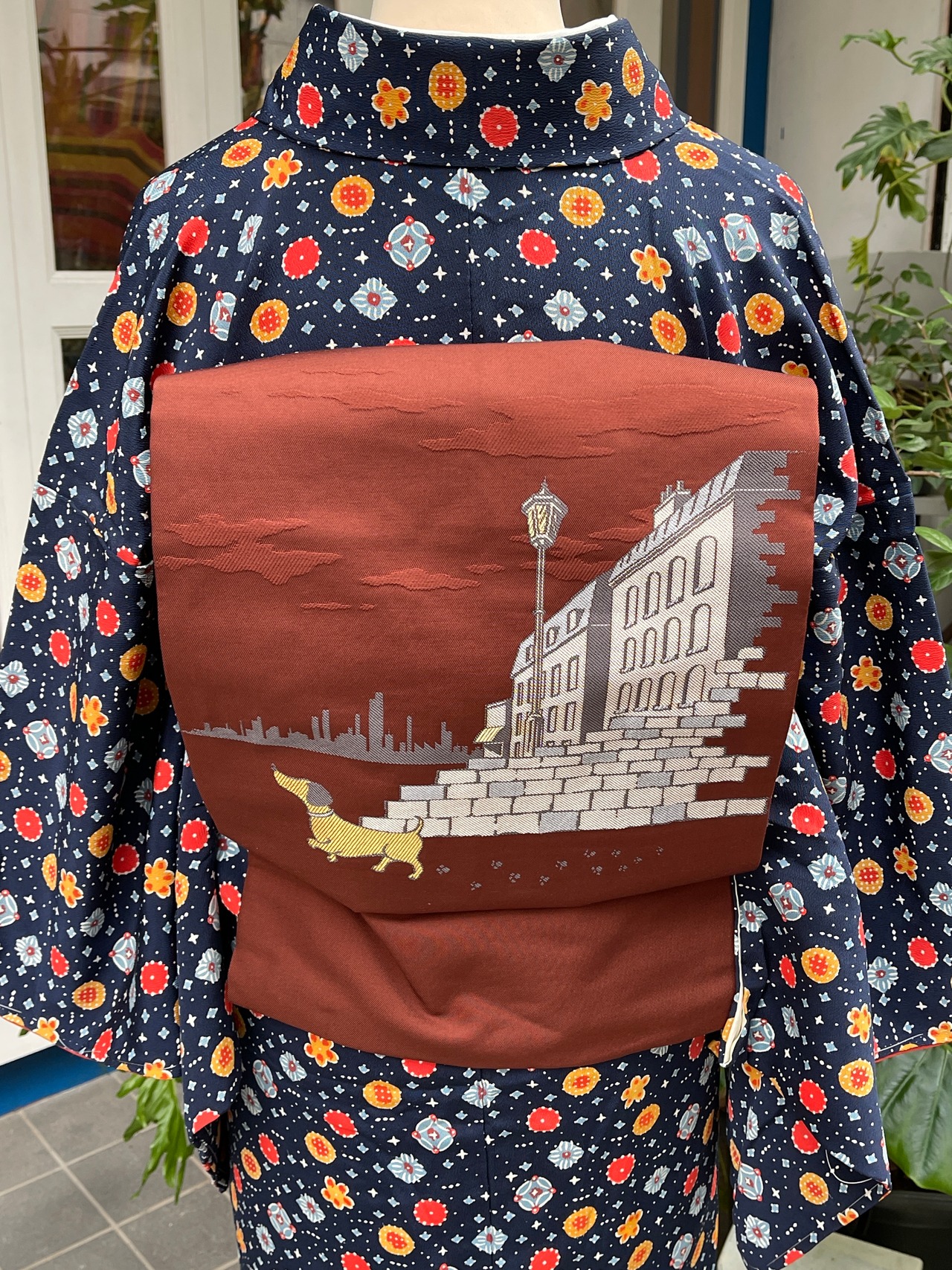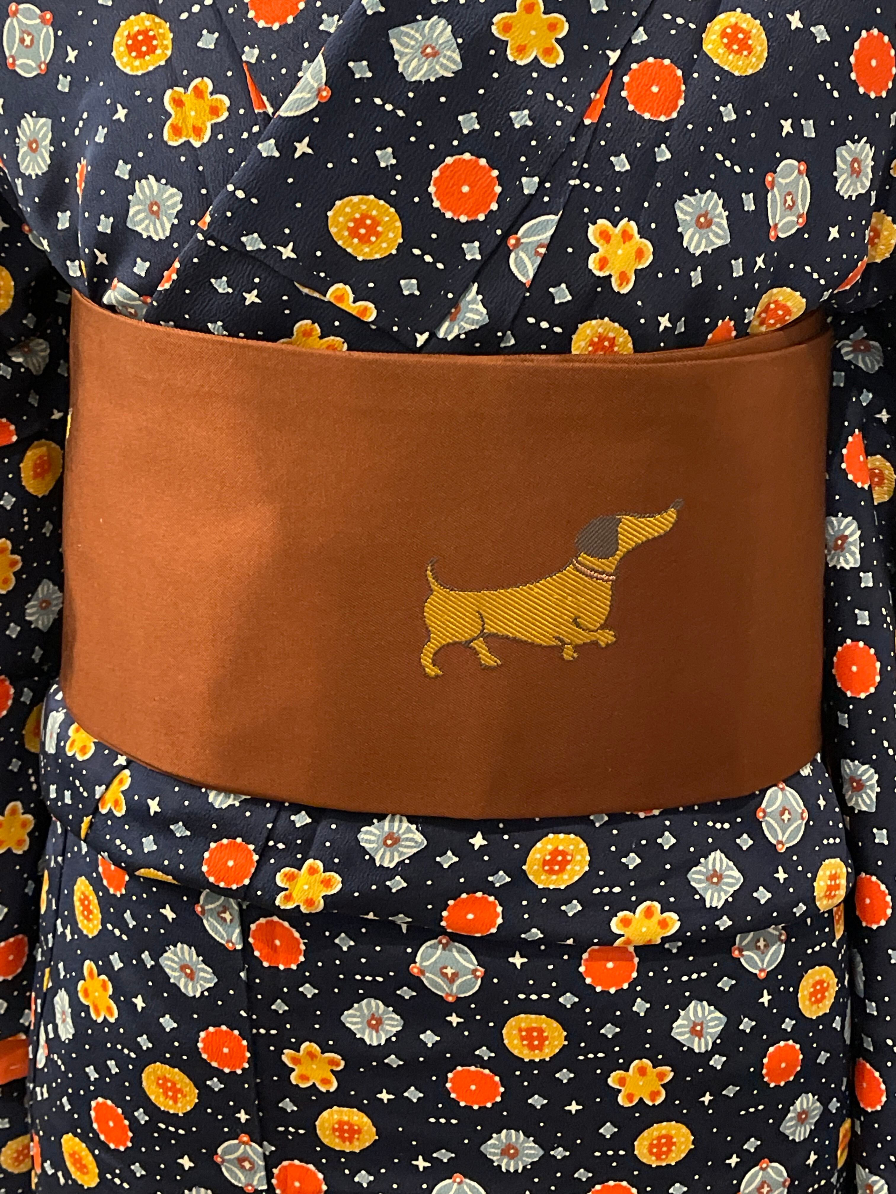 かわいいダックスフントが織り出された名古屋帯です。