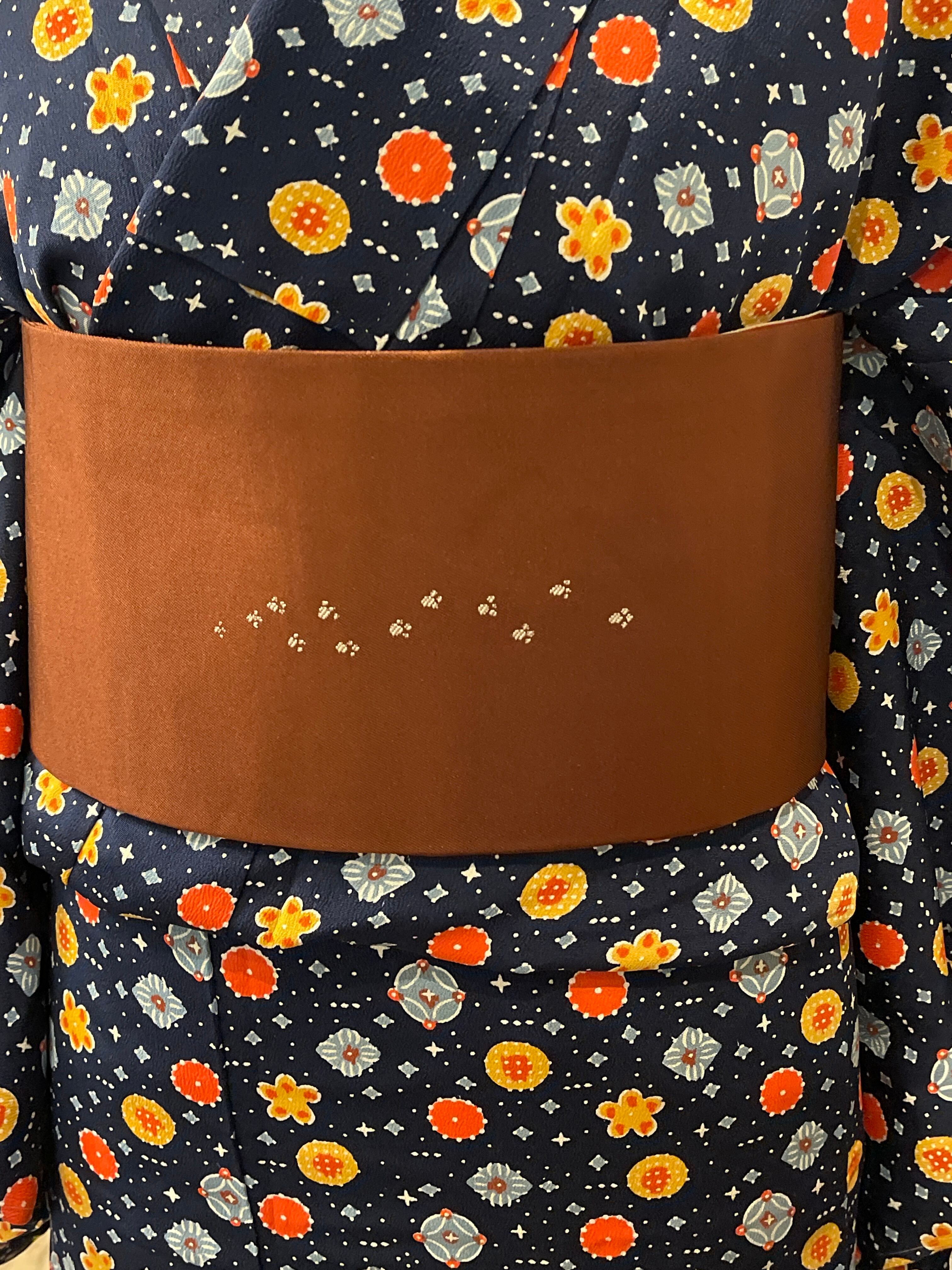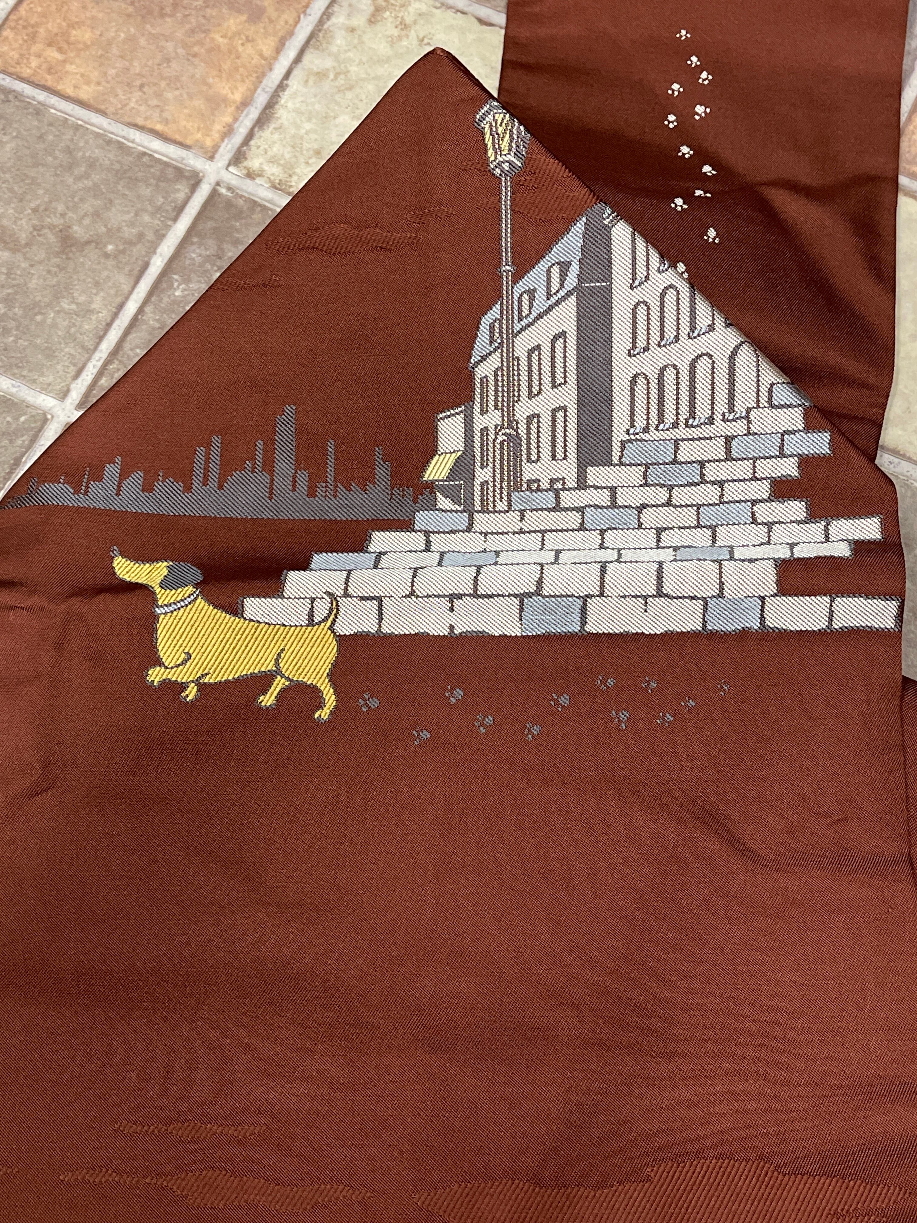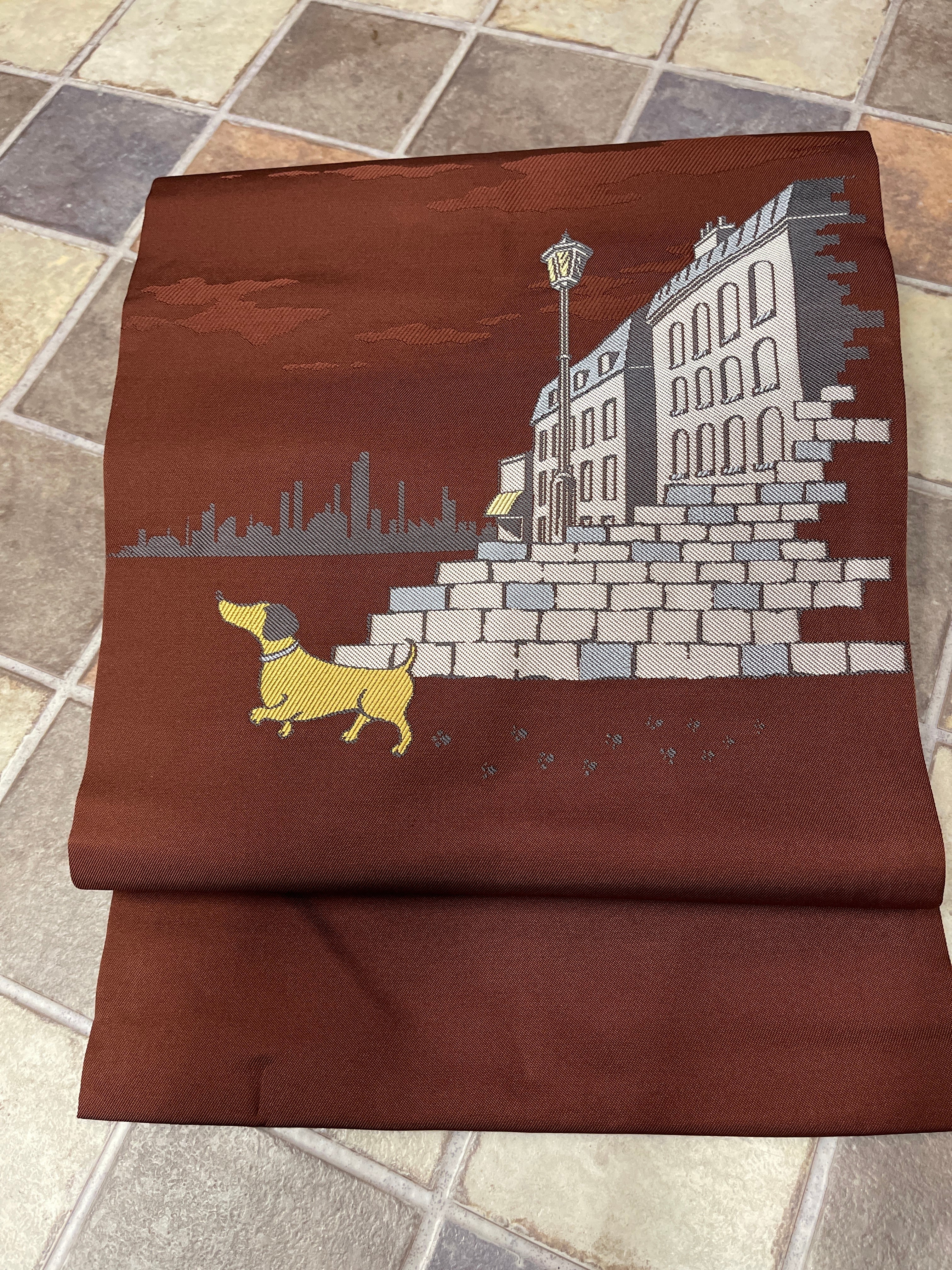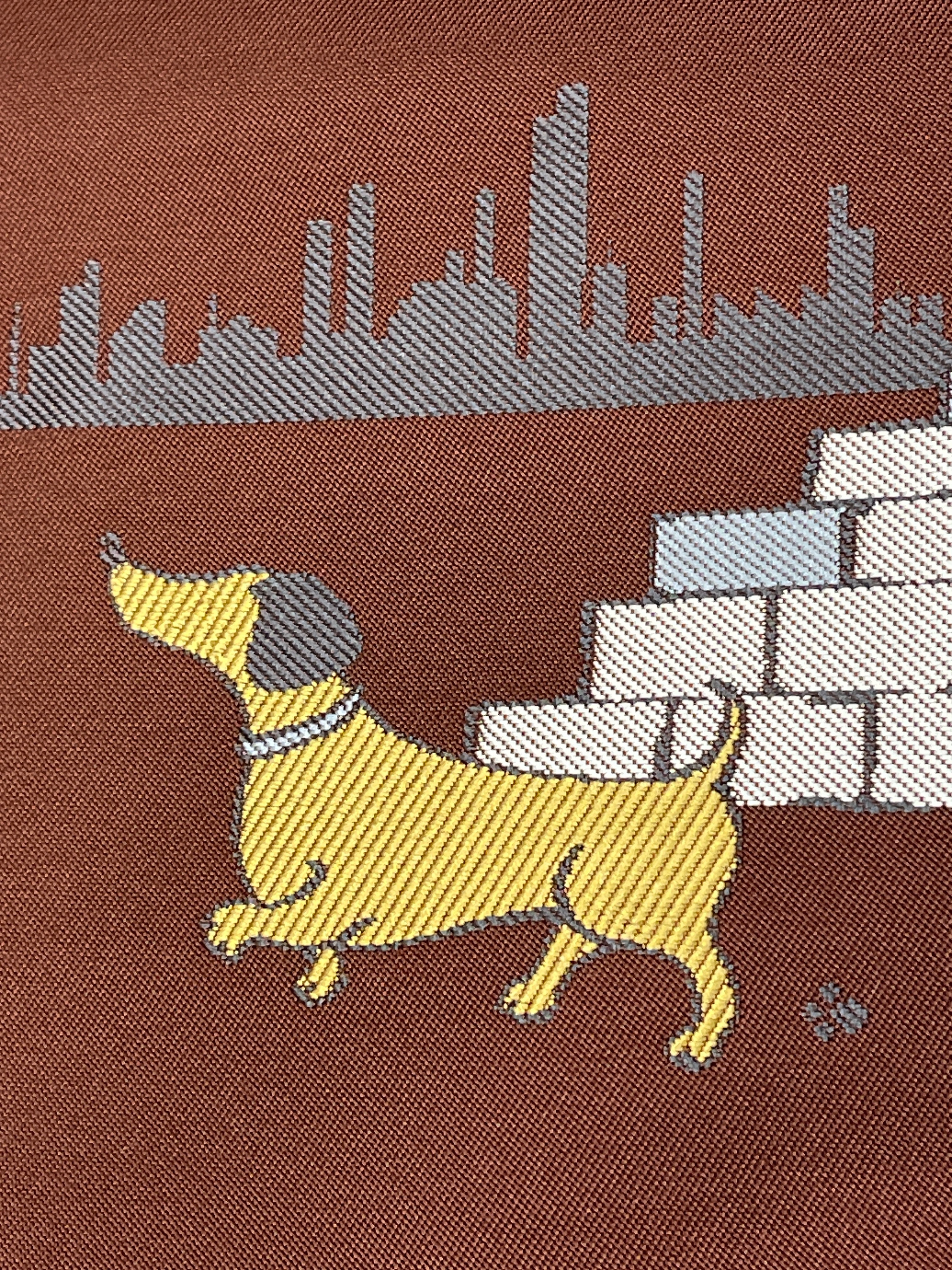 九寸名古屋帯 新品 茶系 犬のお散歩 ダックスフント カジュアル お稽古
