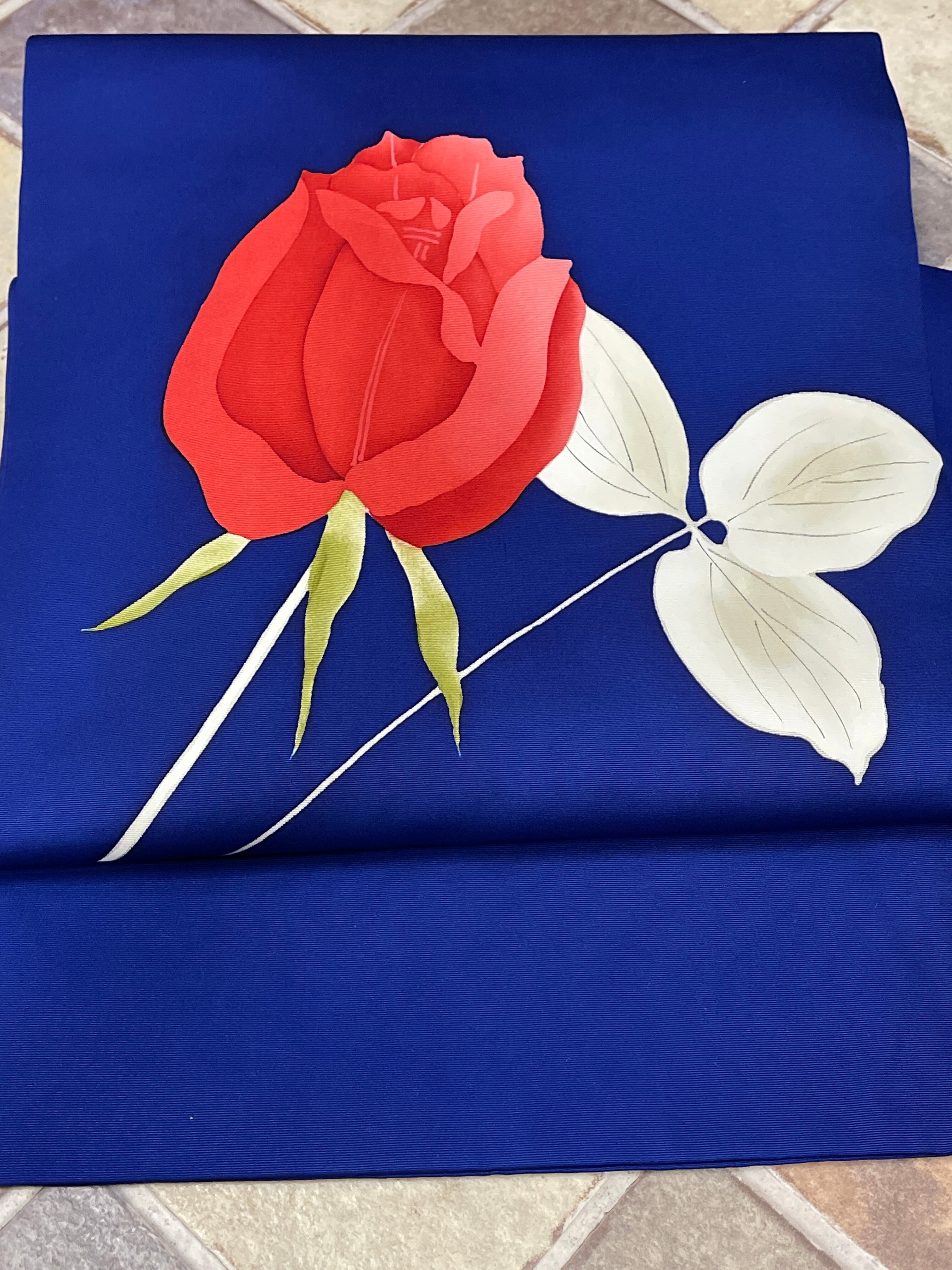 名古屋帯 塩瀬名古屋帯 青地 バラ カジュアル お稽古