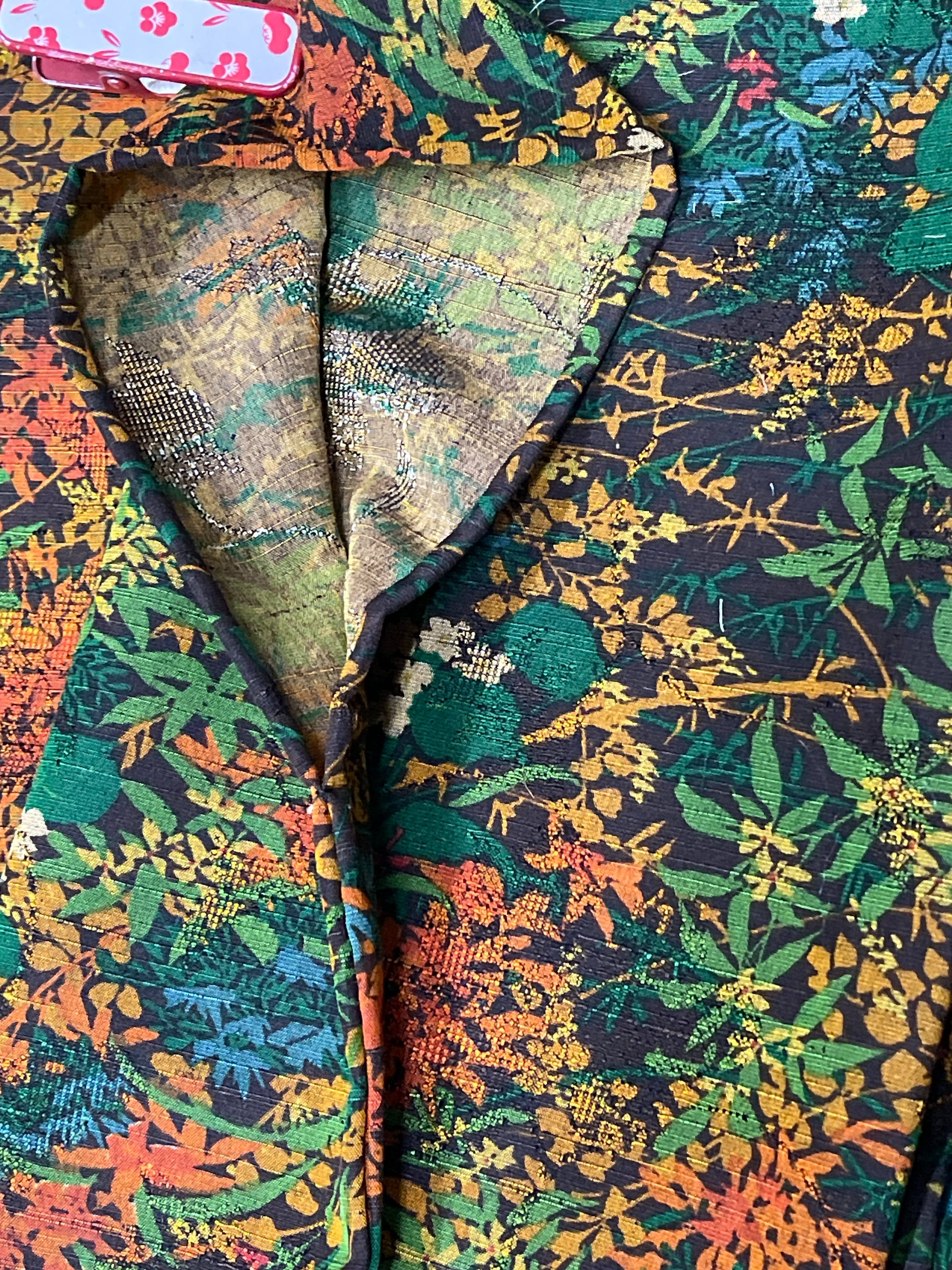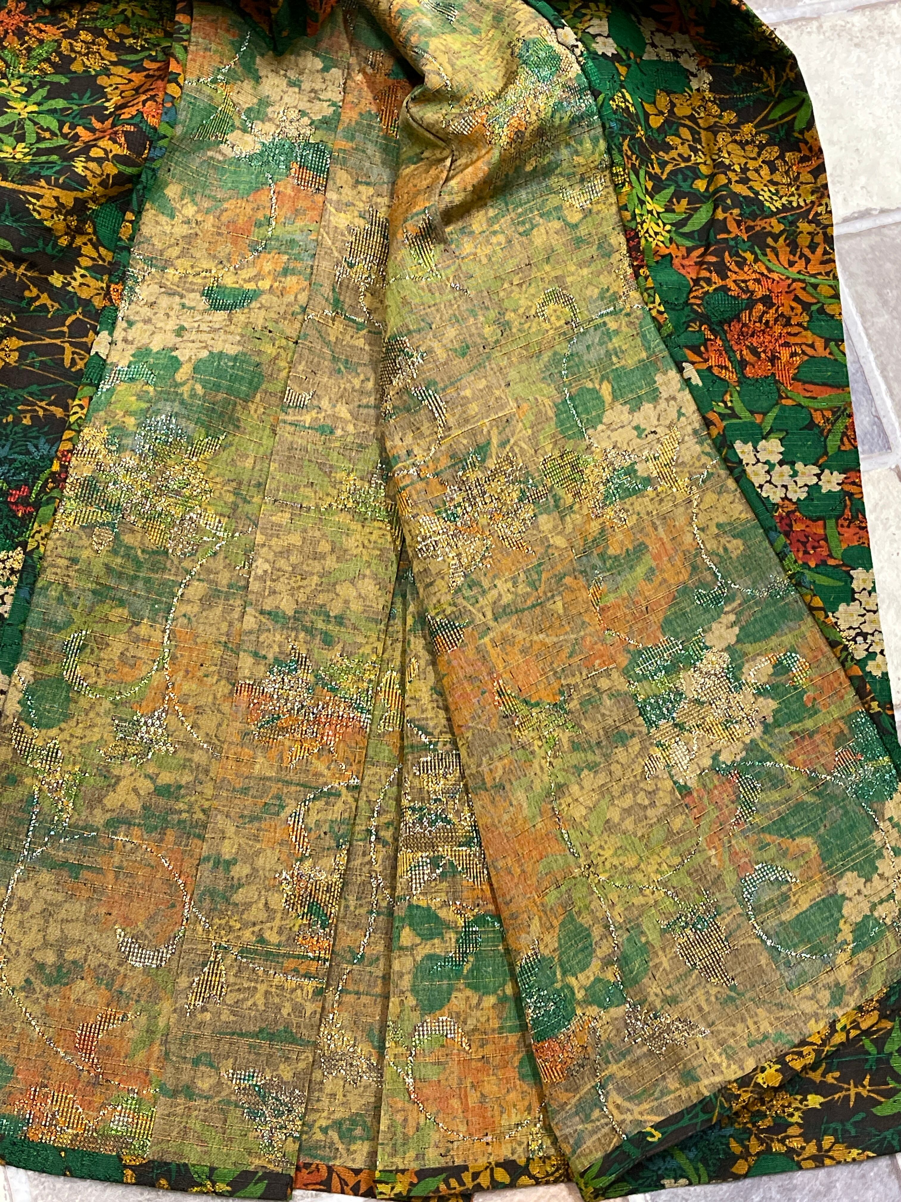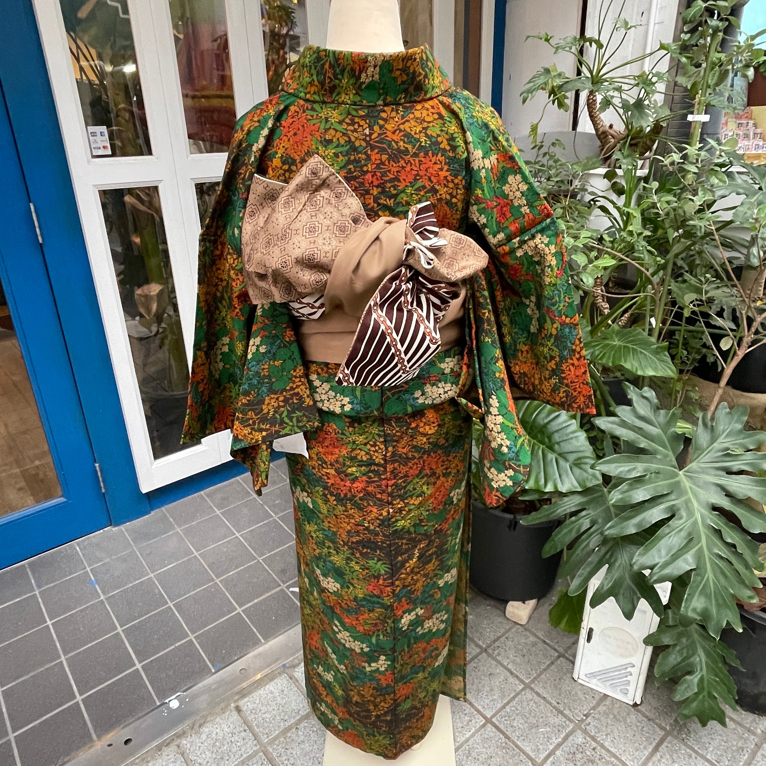 ウール着物 地色茶 洗える着物 ボタニカル カジュアル 普段着