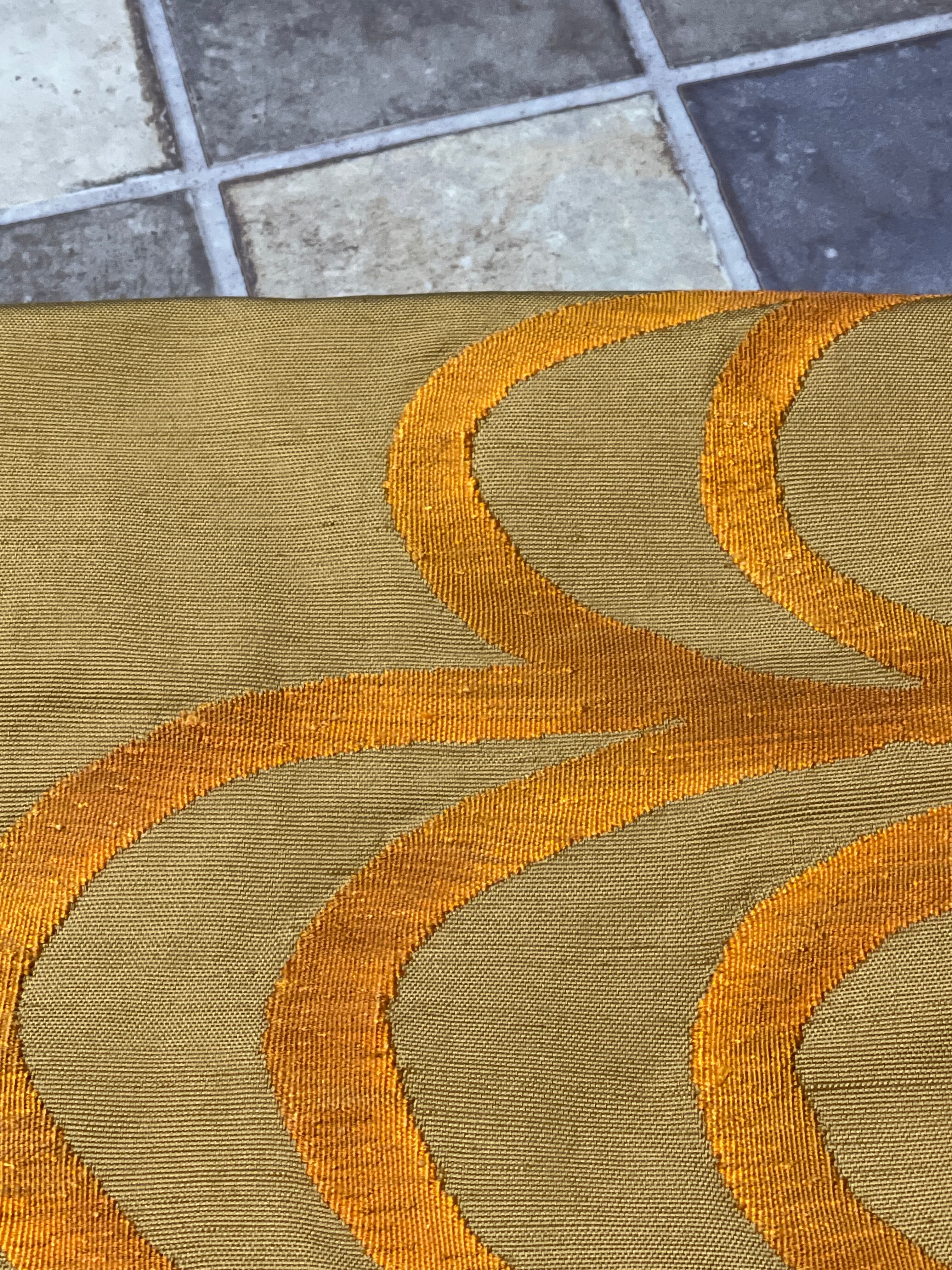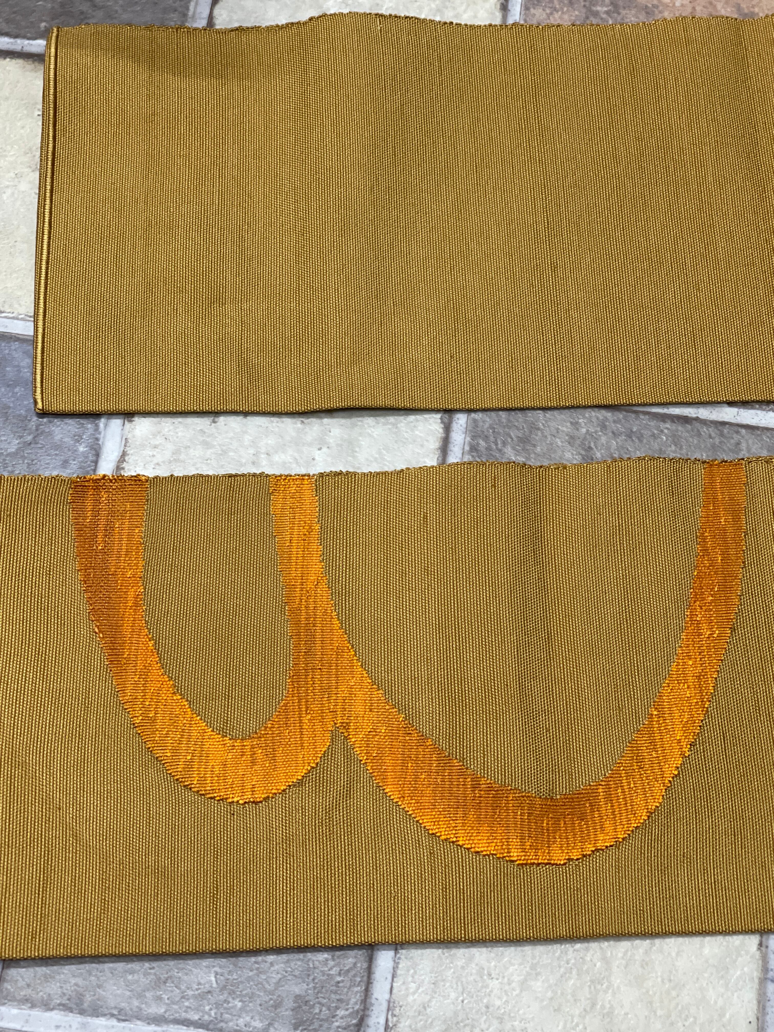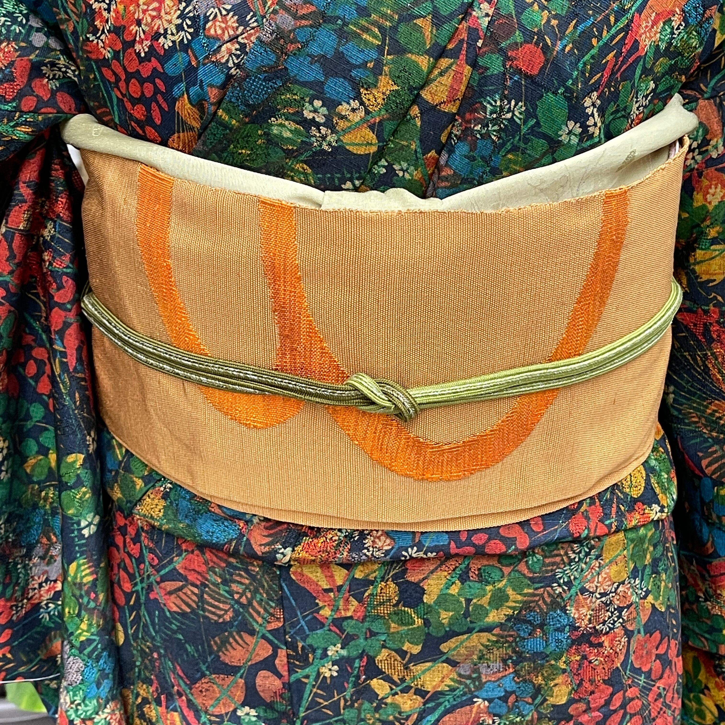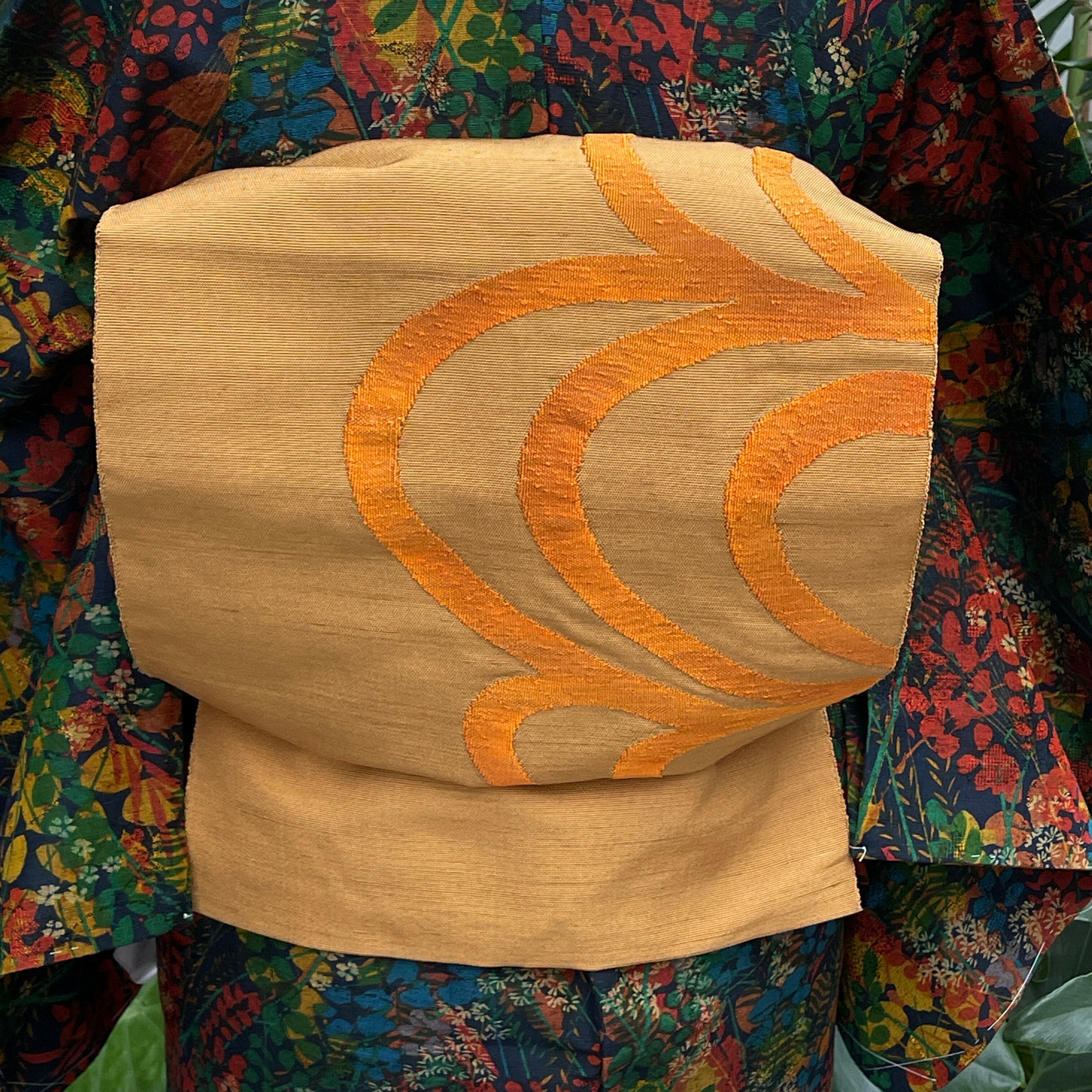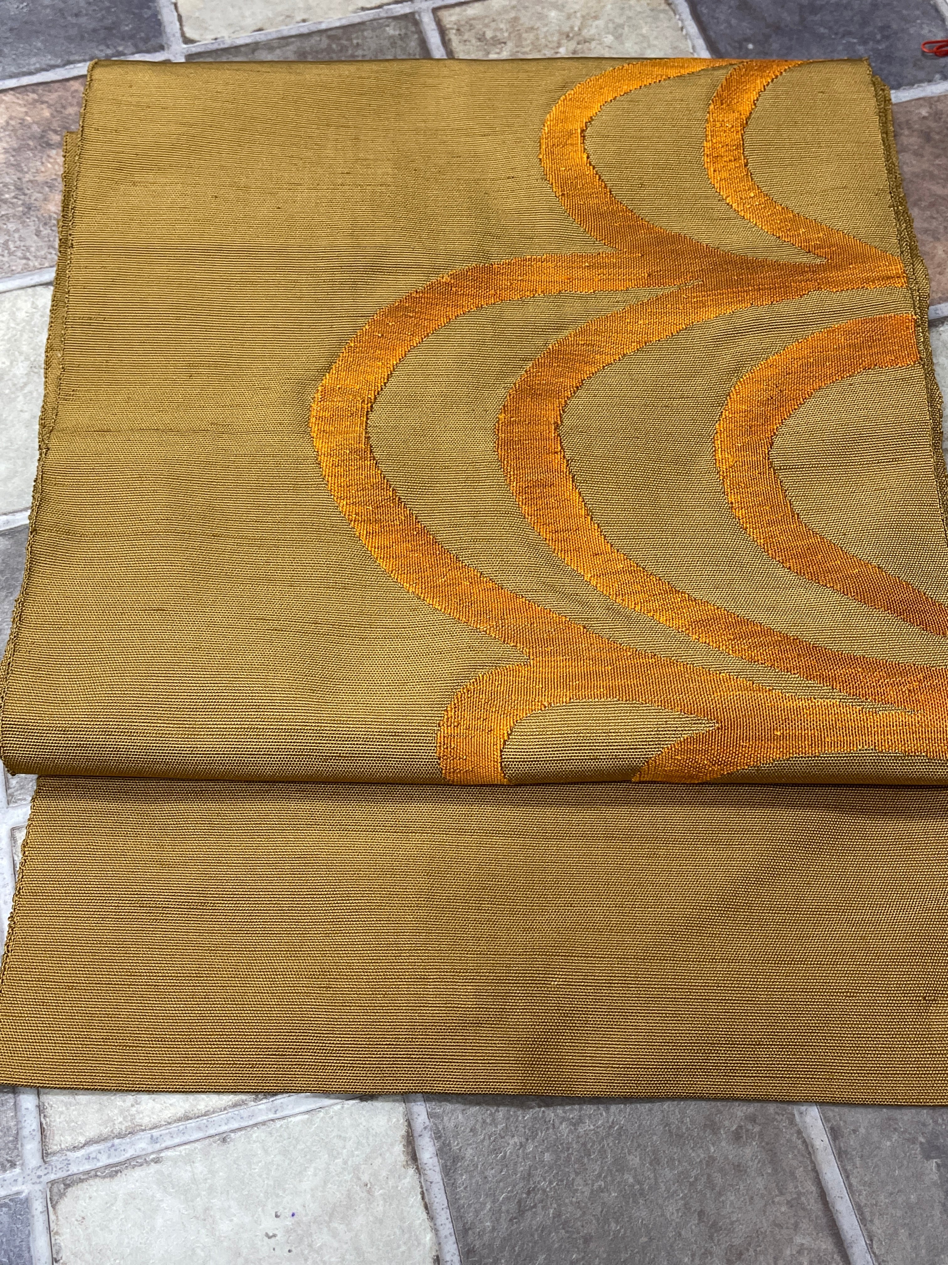 八寸名古屋帯 紬 金茶 波紋 オレンジ カジュアル 日常着 お稽古
