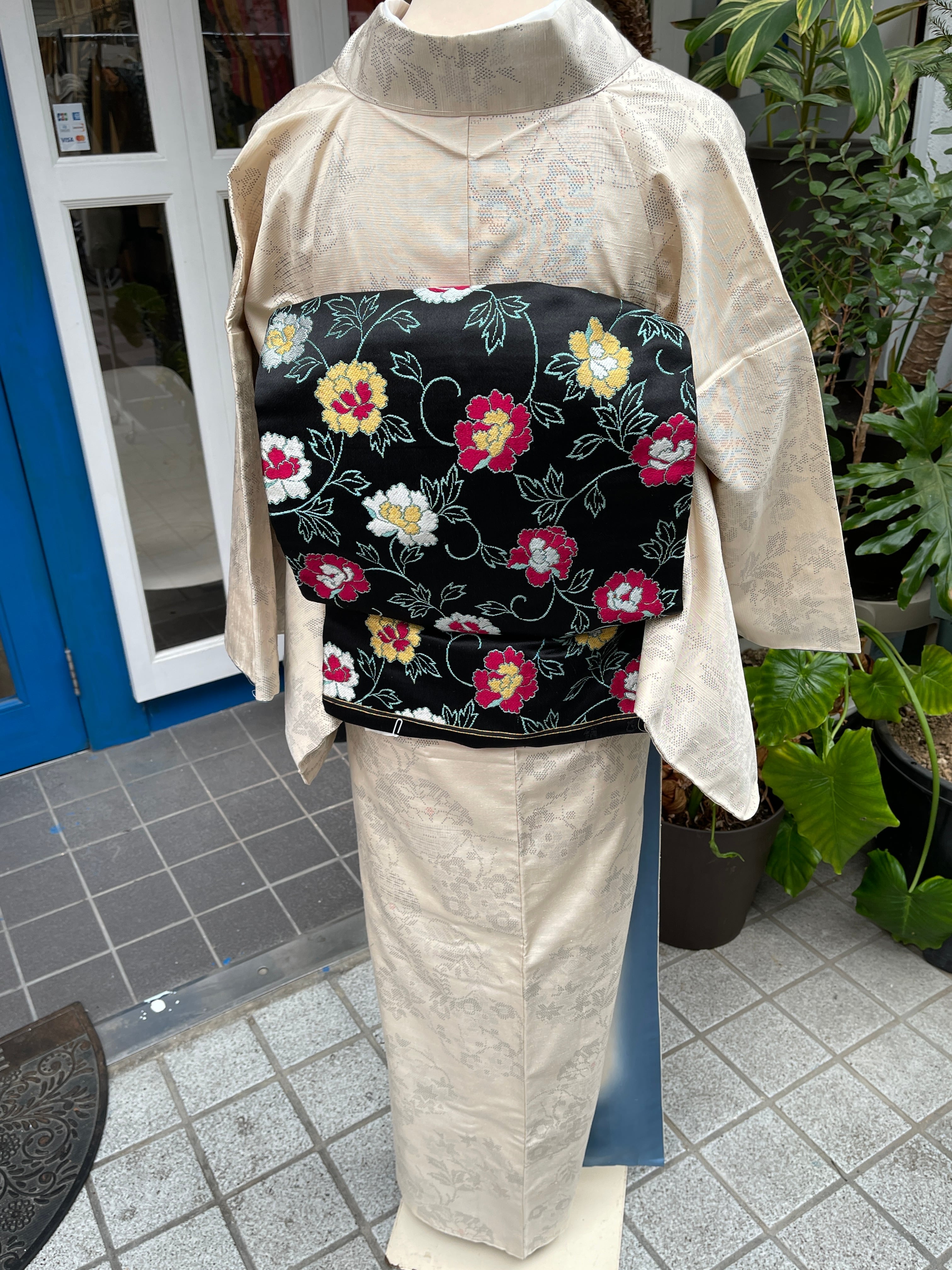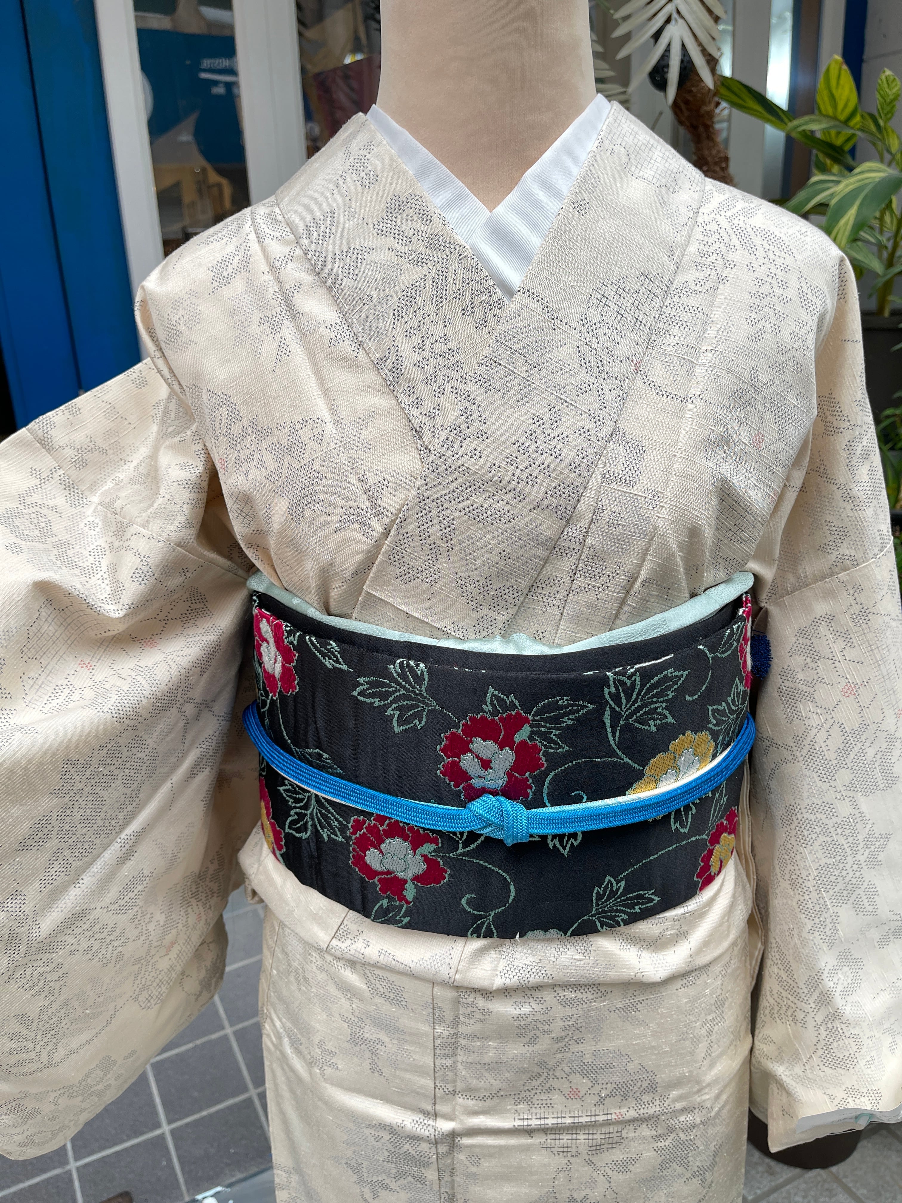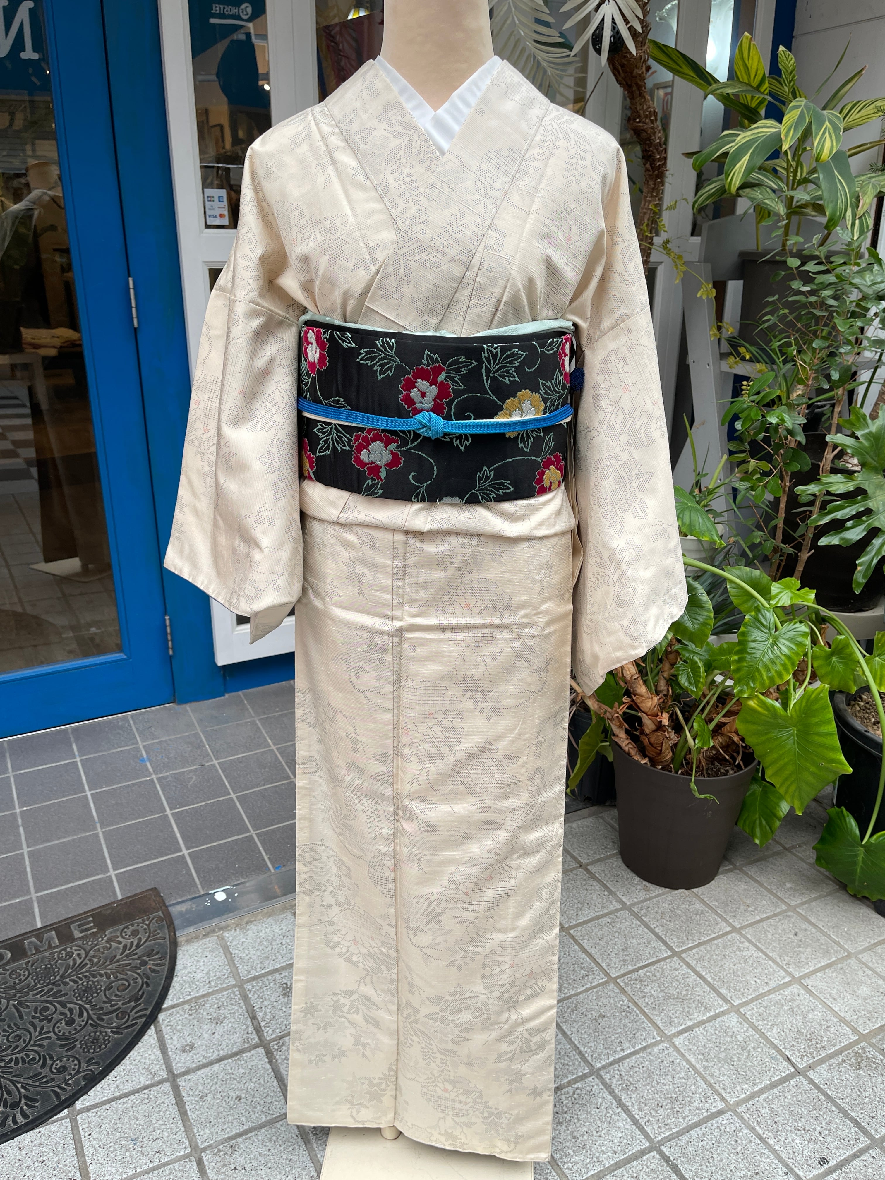 クリームっぽい白地に四季の花は、シンプルなお色目で帯を選ばずコーディネートが楽しめます。
