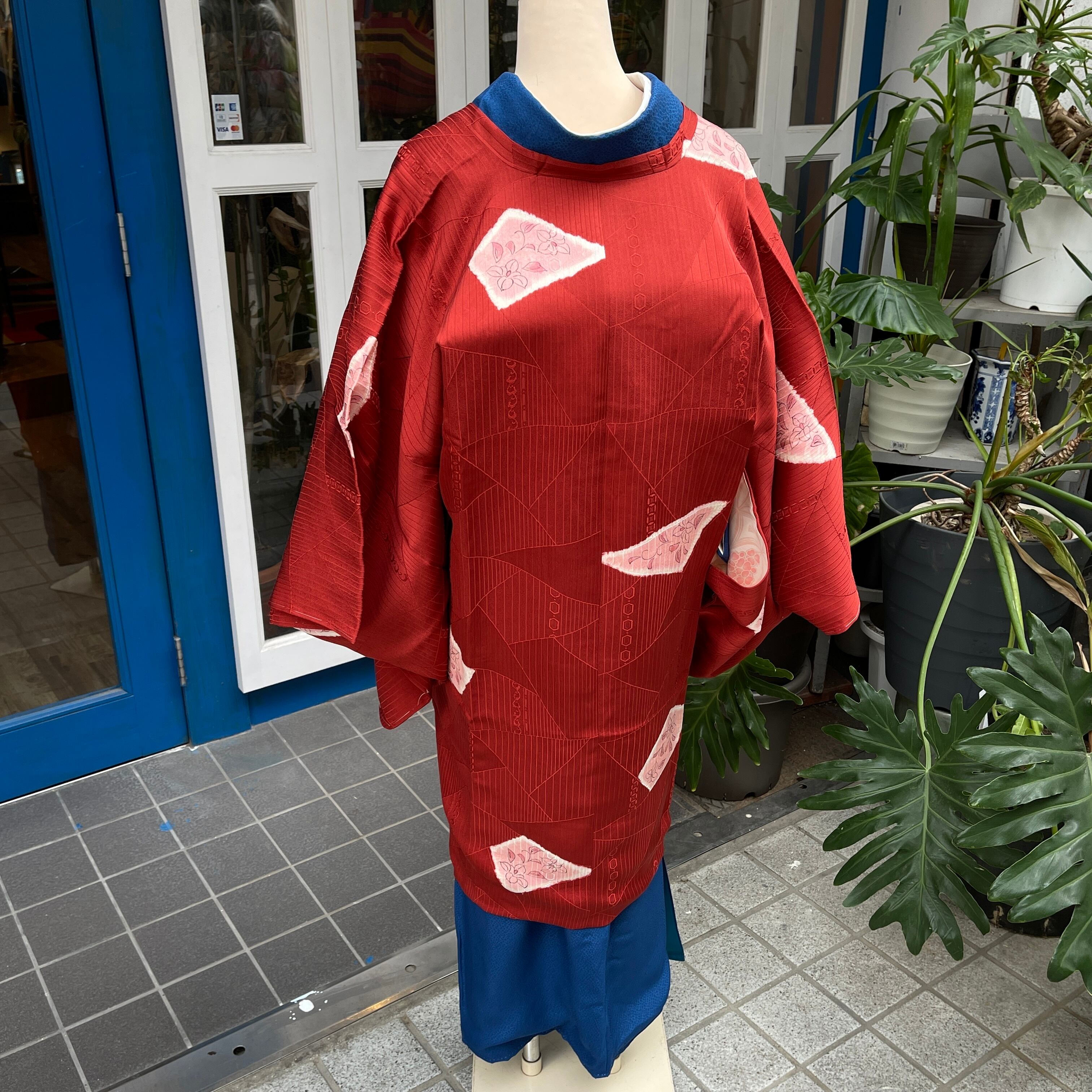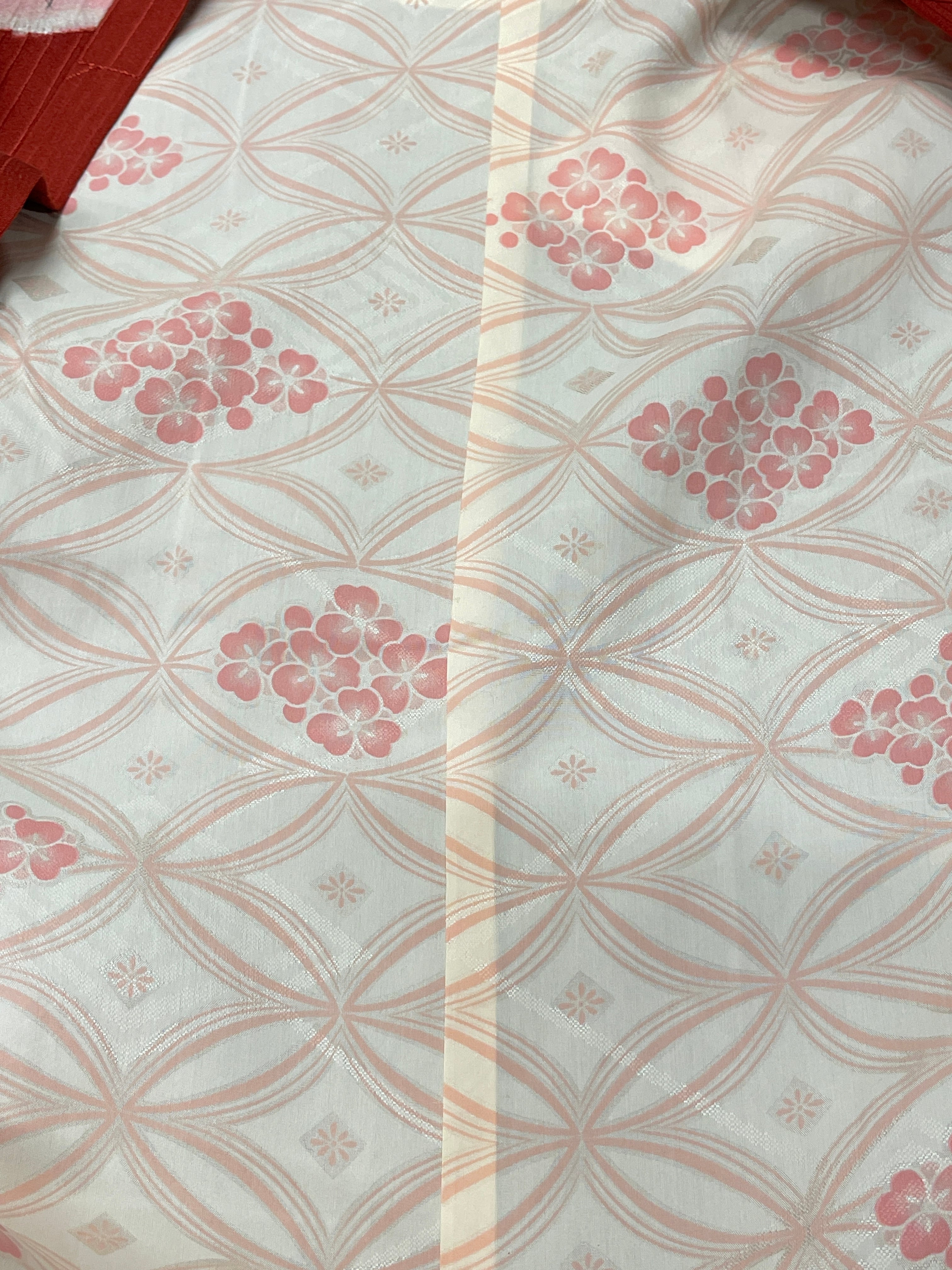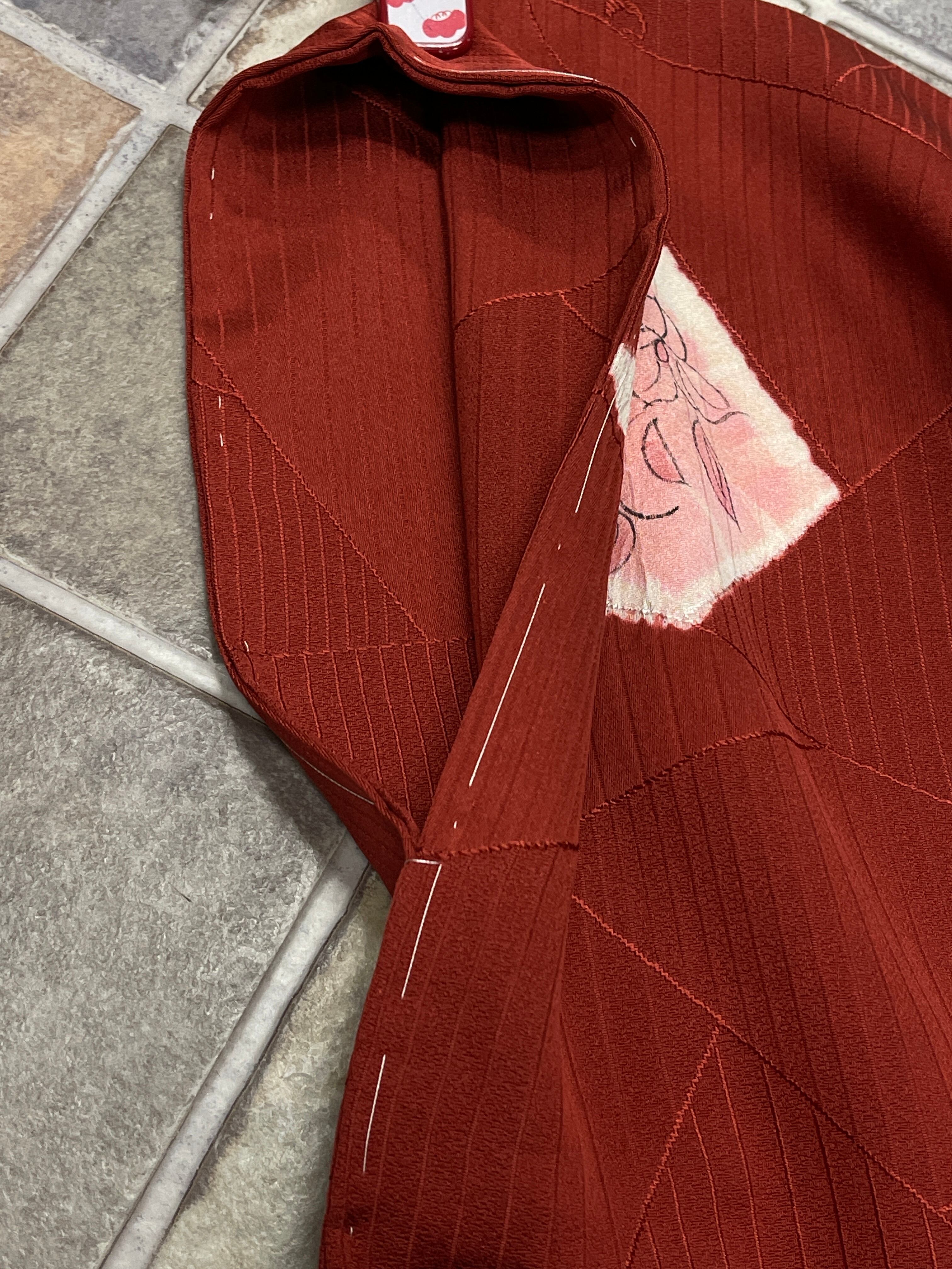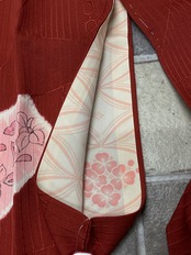 落ち着いた赤に割れ氷、縞、亀甲、波などモダンな地模様にピンクに染まったお花柄優しく描かれています。