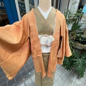 オレンジ系のお色がグラデーションに染められ、波の地紋、所々手書きで波が描かれた、優しくクールな羽織です。